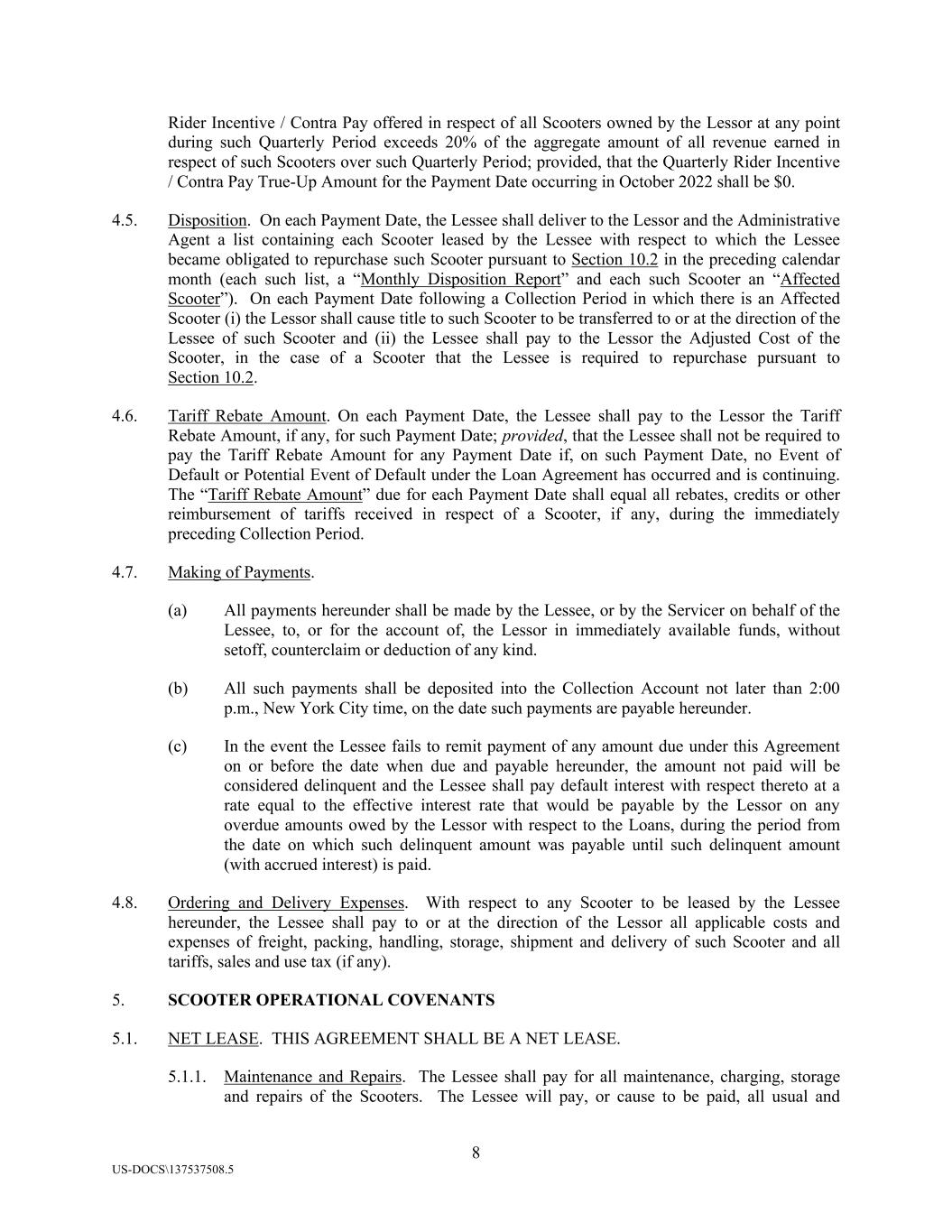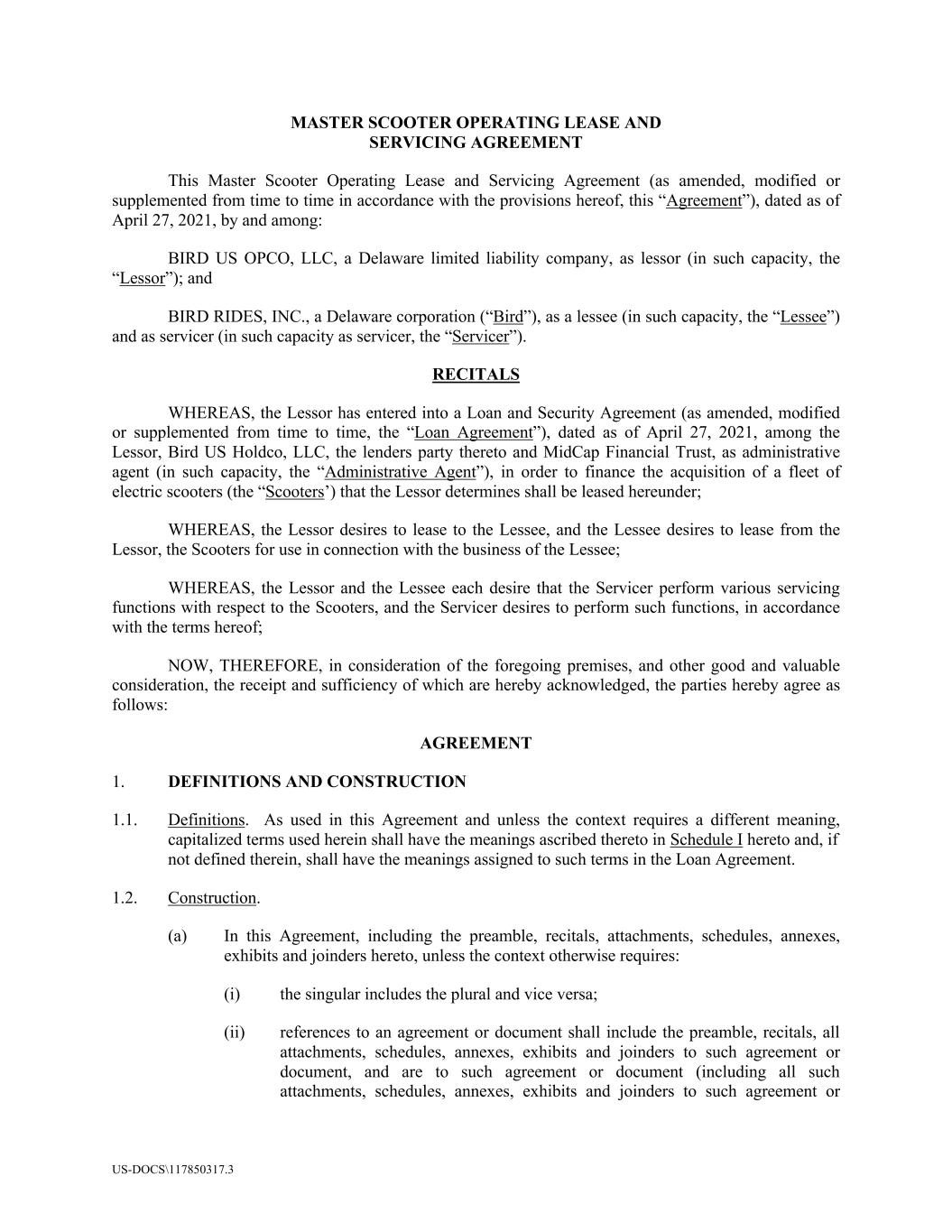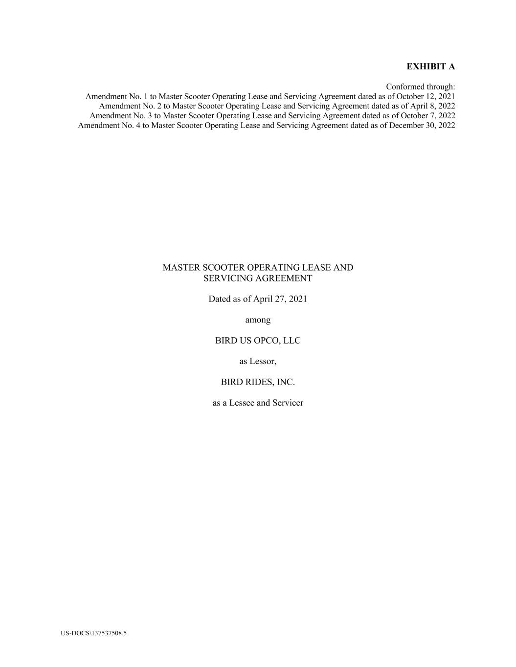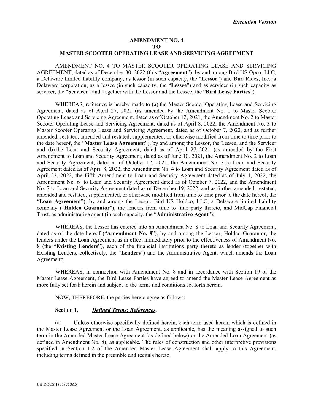 On the Closing Date, Bird Opco entered into Amendment No. 4 (“Amendment No. 4”) to the Master Scooter Operating Lease and Servicing Agreement, dated as of April 27, 2021 (as amended from time to time period to the Amendment Effective Date, the “Existing Scooter Lease”), with Bird Rides. On the Closing Date, Amendment No. 4,