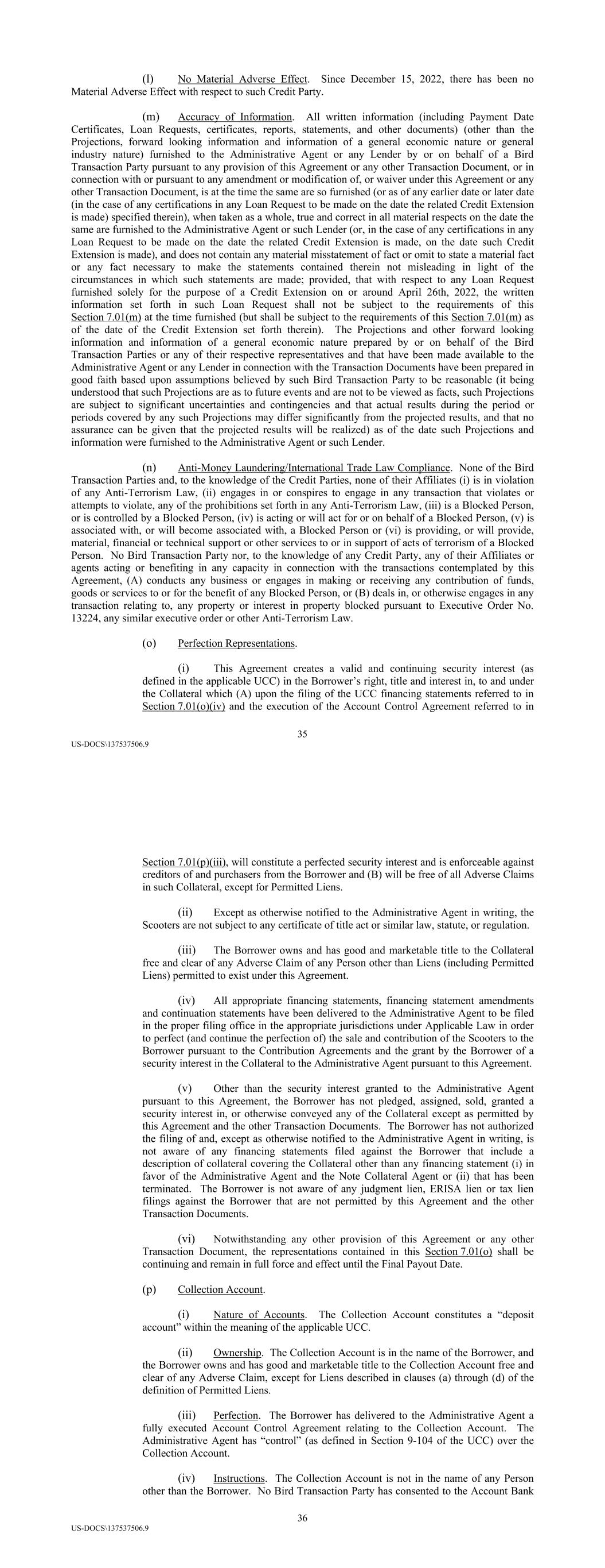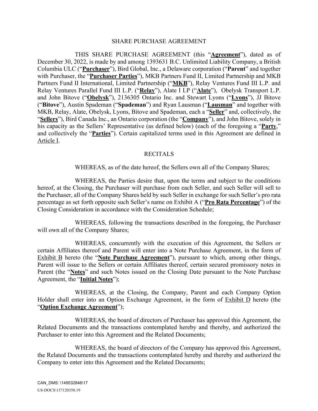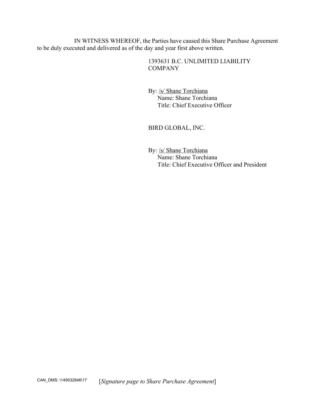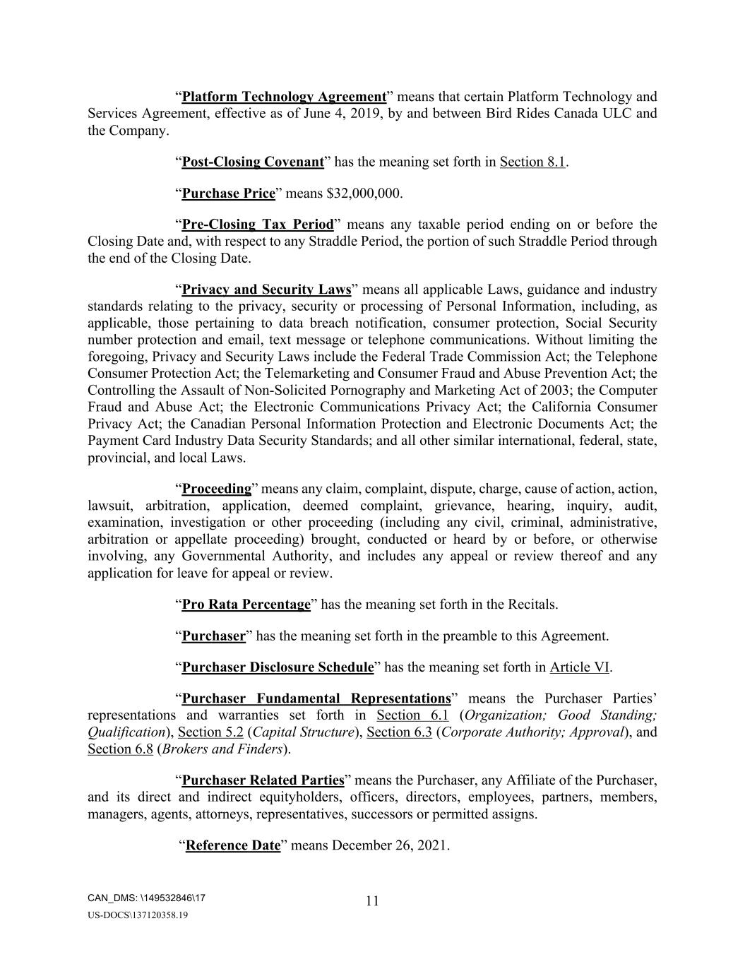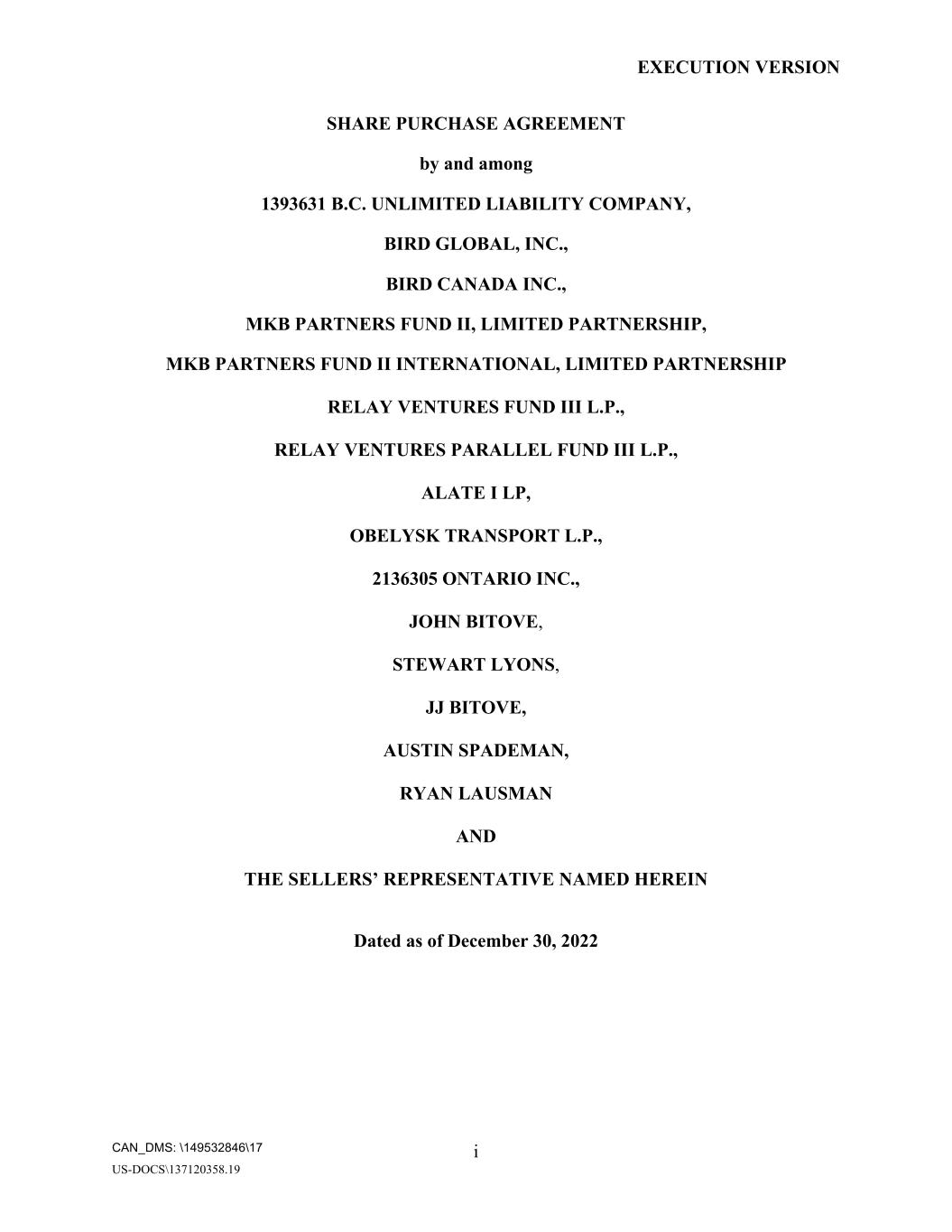 The Share Purchase Agreement contains customary representations and warranties related to Bird Canada, the BC Sellers, the Purchaser and the Company. The Share Purchase Agreement contains customary indemnification provisions by the Purchaser, the Company and the BC Sellers with respect to breaches of representations and warranties and the performance of post-closing covenants. Indemnification claims will survive the closing for (i) with respect to breaches of general representations and warranties, 18 months, (ii) with respect to breaches of fundamental representations and warrants, 24 months, and (iii) with respect to post-closing covenants, in accordance with their terms or until fully performed.
