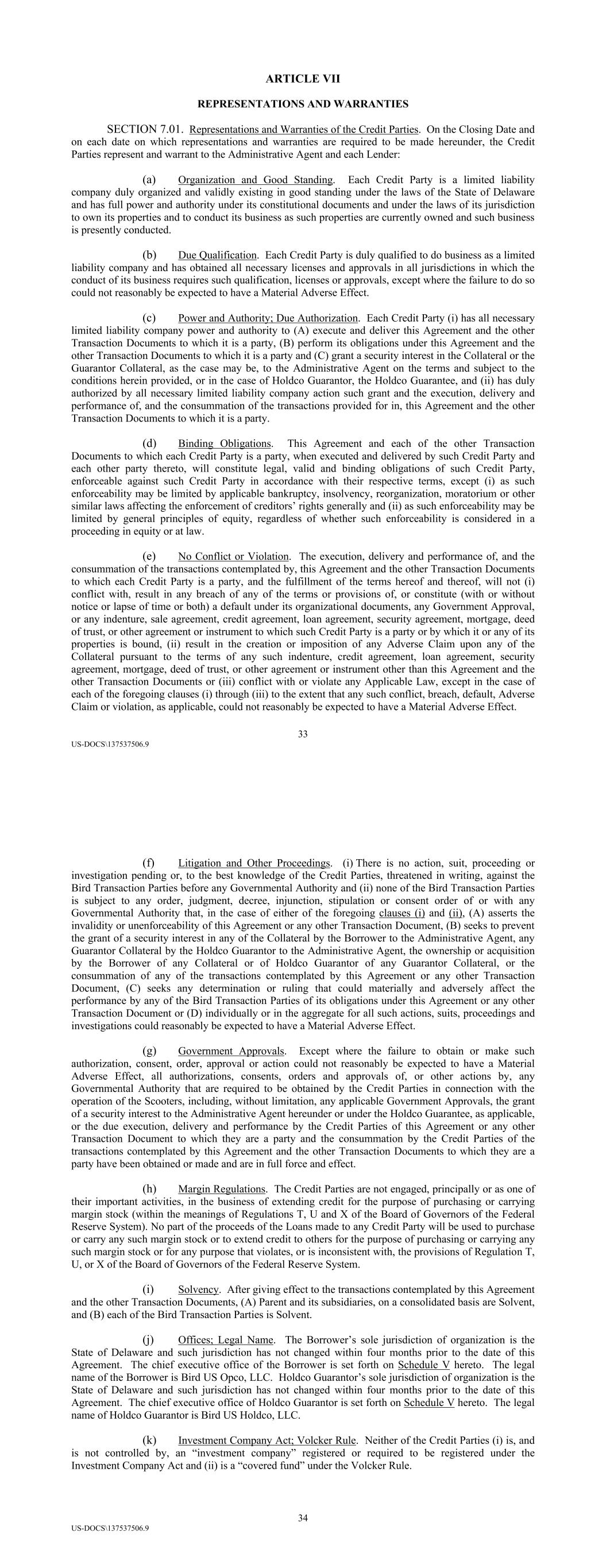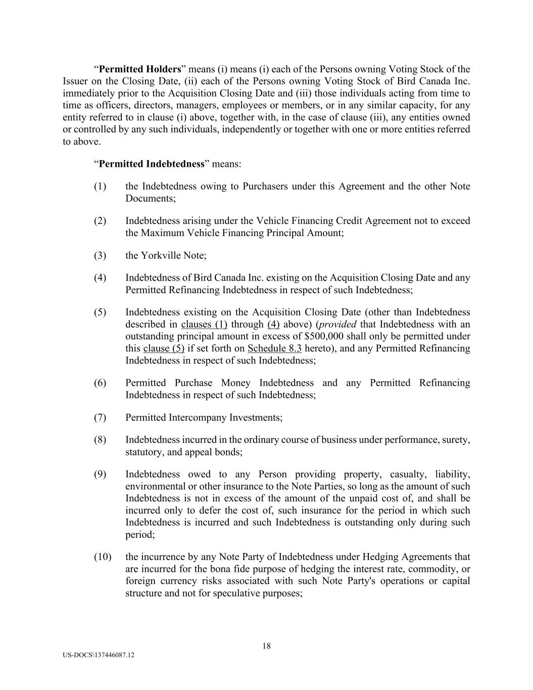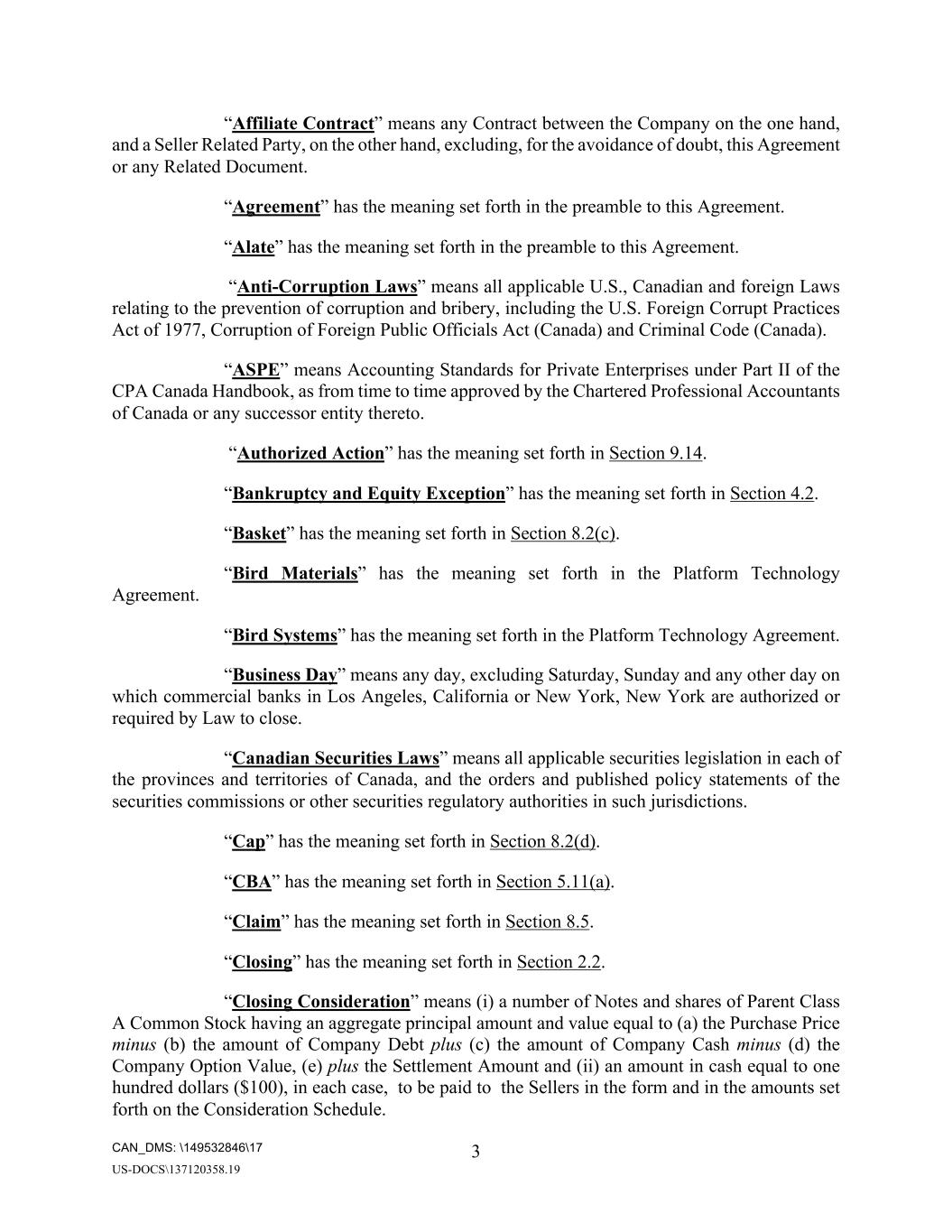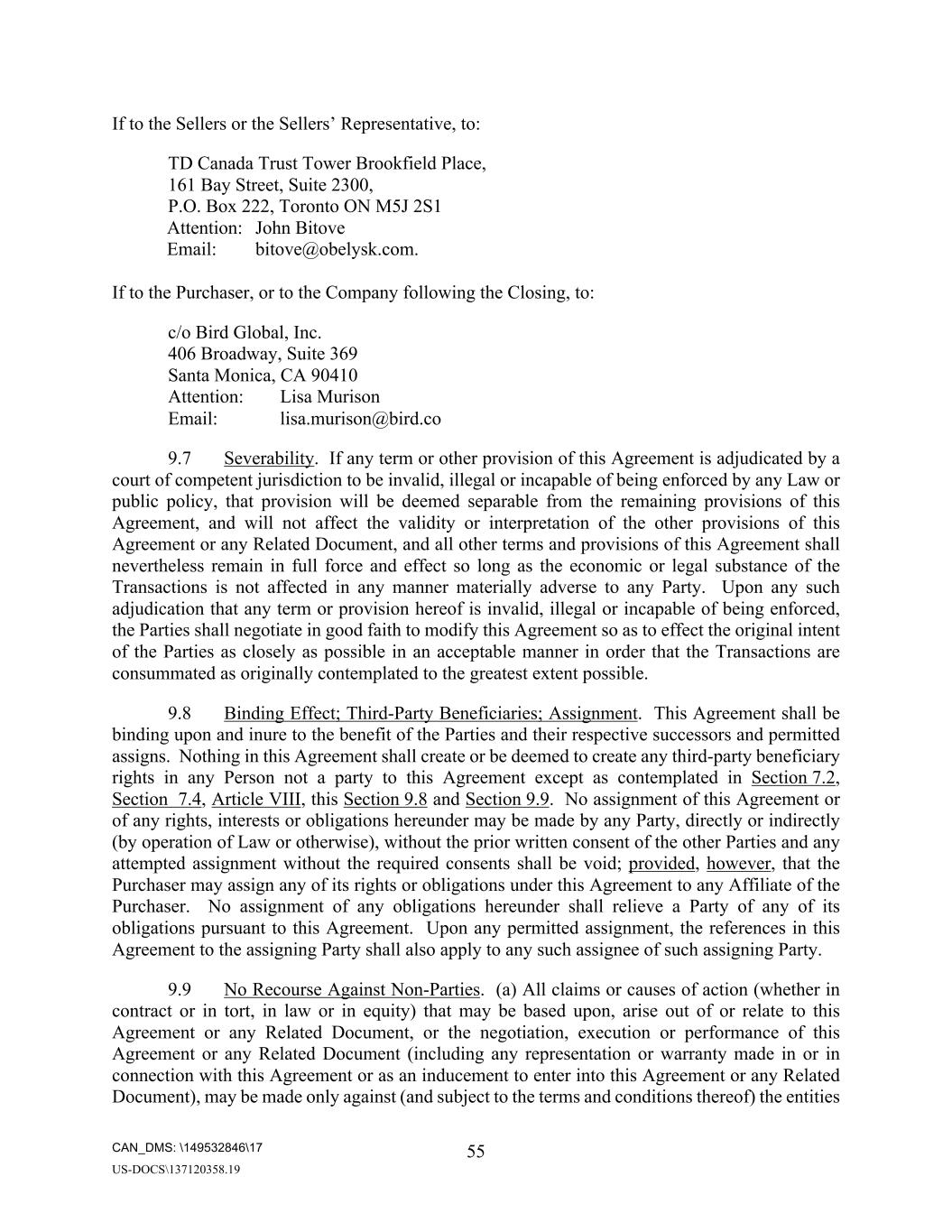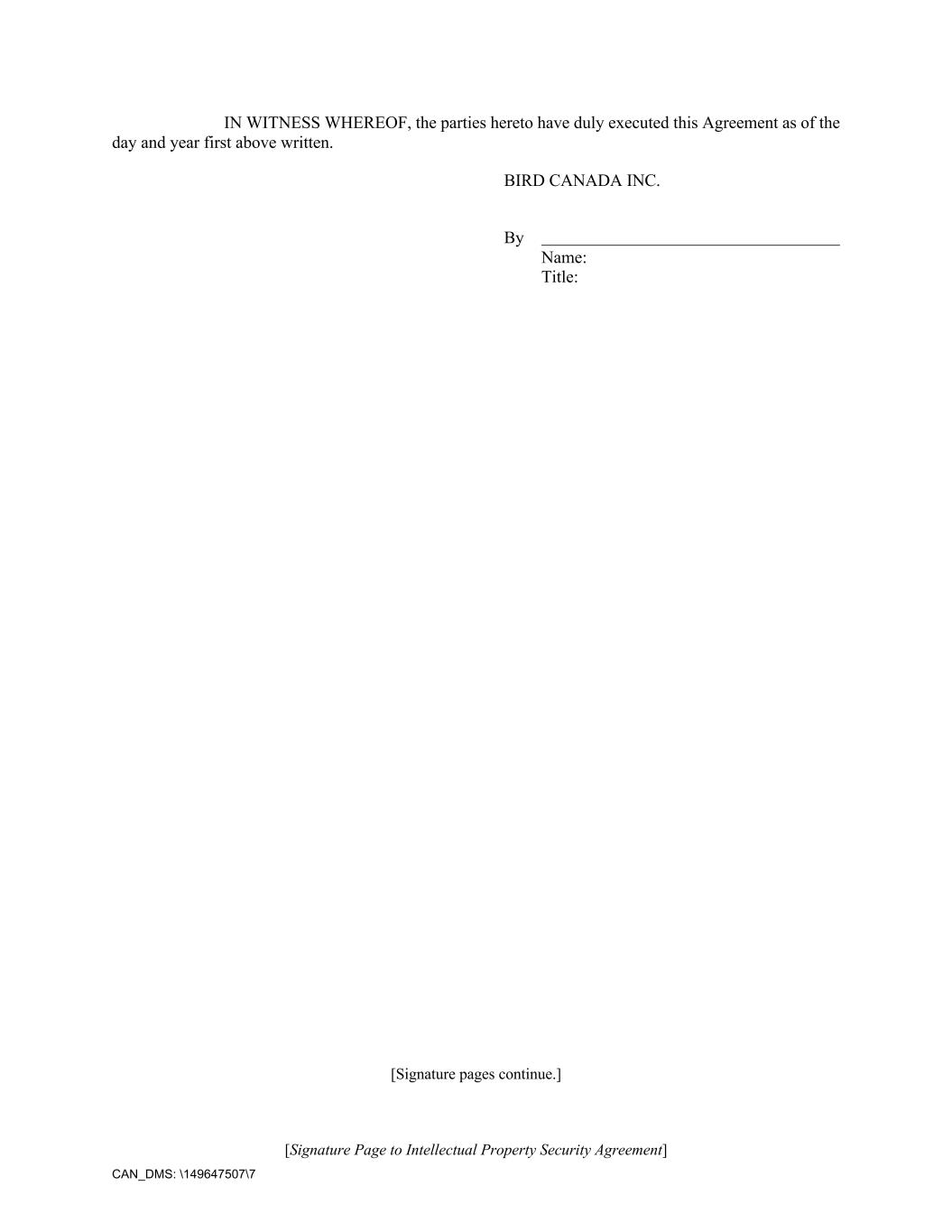 The Share Purchase Agreement contains customary representations and warranties related to Bird Canada, the BC Sellers, the Purchaser and the Company. The Share Purchase Agreement contains customary indemnification provisions by the Purchaser, the Company and the BC Sellers with respect to breaches of representations and warranties and the performance of post-closing covenants. Indemnification claims will survive the closing for (i) with respect to breaches of general representations and warranties, 18 months, (ii) with respect to breaches of fundamental representations and warrants, 24 months, and (iii) with respect to post-closing covenants, in accordance with their terms or until fully performed.