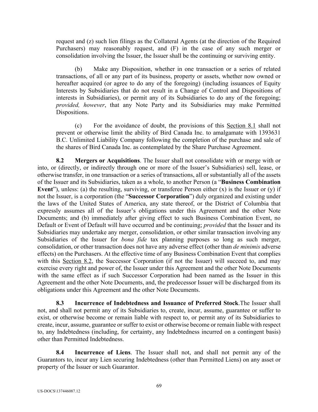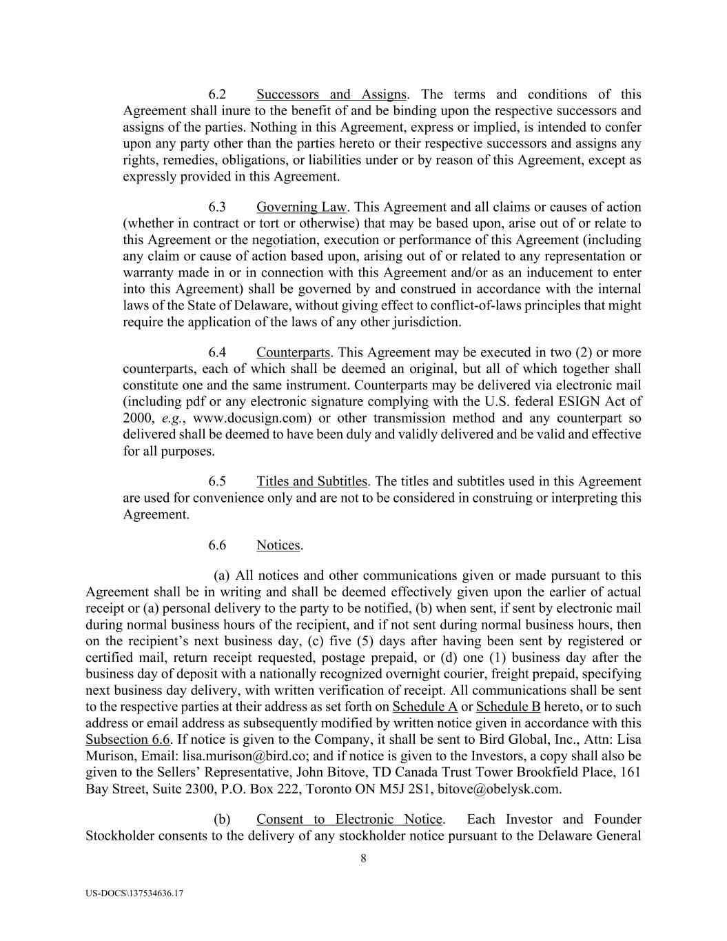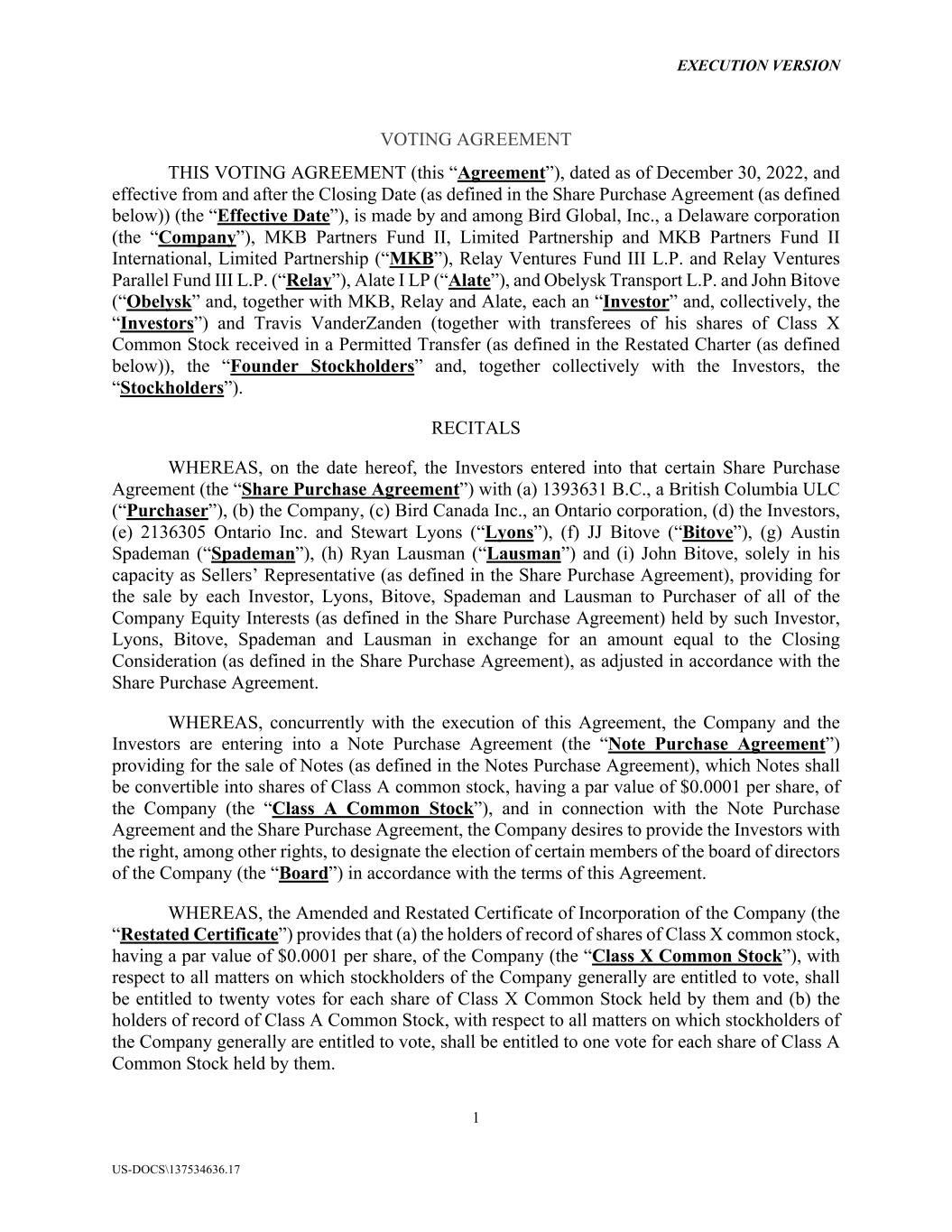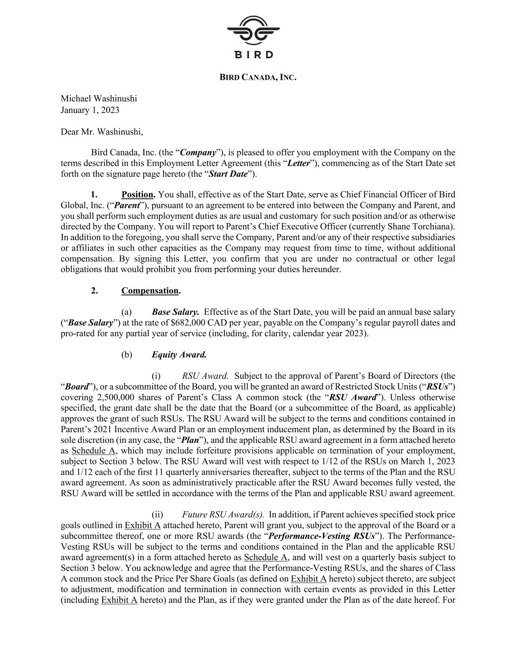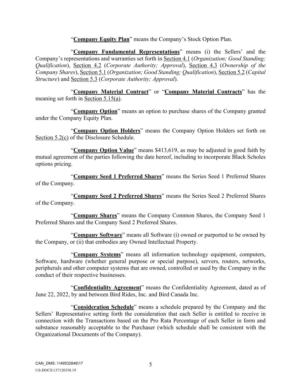 The Share Purchase Agreement contains customary representations and warranties related to Bird Canada, the BC Sellers, the Purchaser and the Company. The Share Purchase Agreement contains customary indemnification provisions by the Purchaser, the Company and the BC Sellers with respect to breaches of representations and warranties and the performance of post-closing covenants. Indemnification claims will survive the closing for (i) with respect to breaches of general representations and warranties, 18 months, (ii) with respect to breaches of fundamental representations and warrants, 24 months, and (iii) with respect to post-closing covenants, in accordance with their terms or until fully performed.