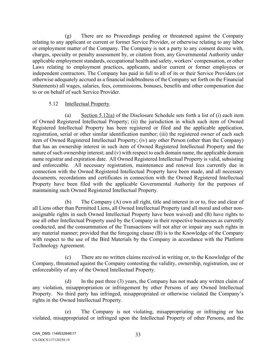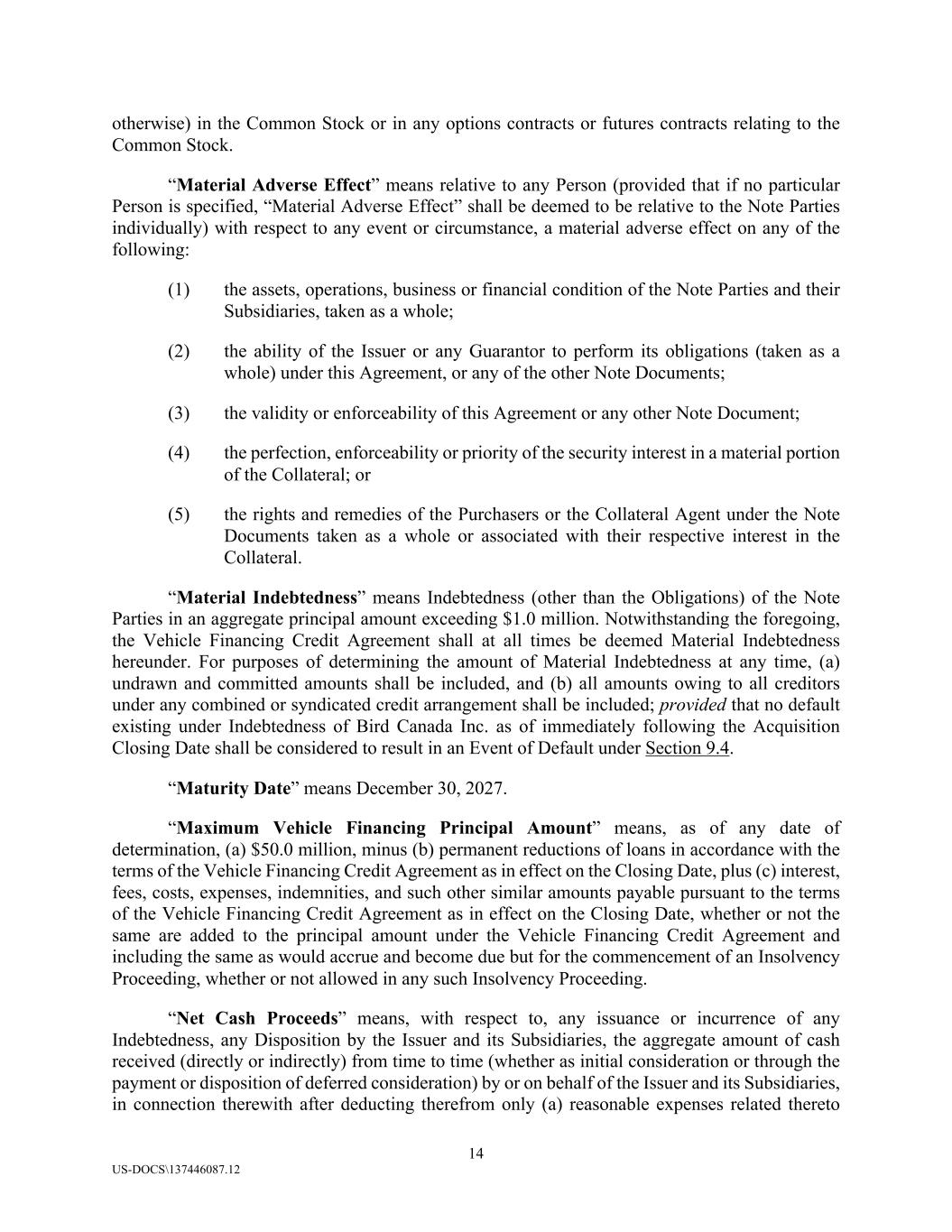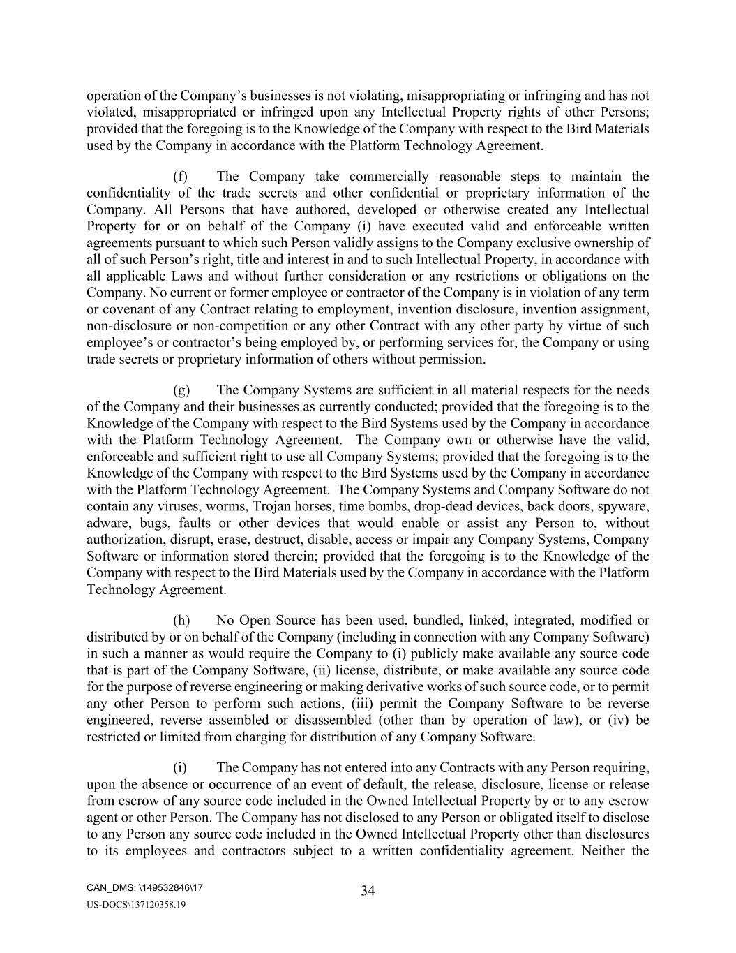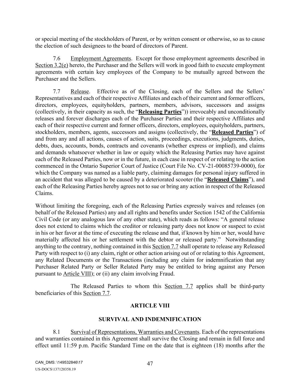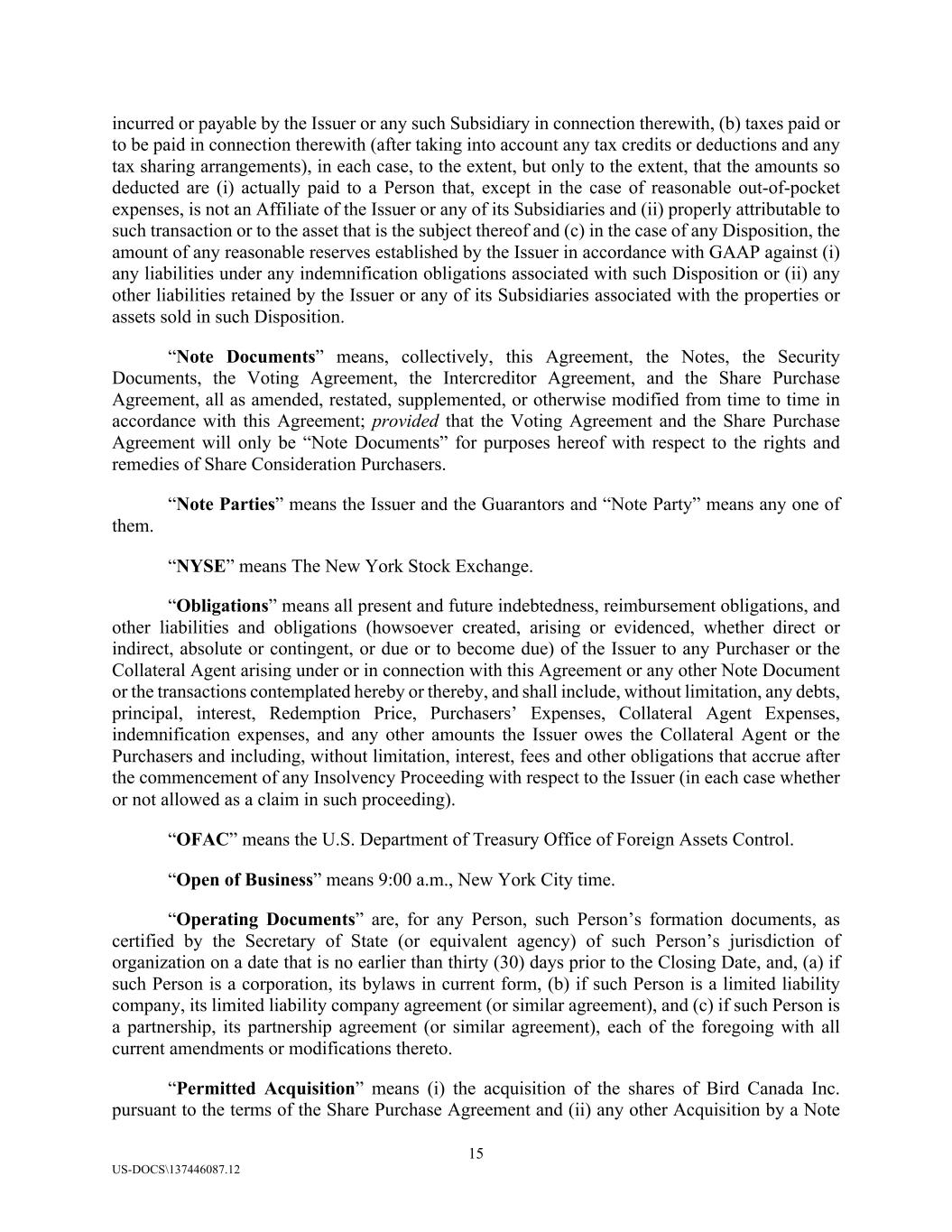 The Share Purchase Agreement contains customary representations and warranties related to Bird Canada, the BC Sellers, the Purchaser and the Company. The Share Purchase Agreement contains customary indemnification provisions by the Purchaser, the Company and the BC Sellers with respect to breaches of representations and warranties and the performance of post-closing covenants. Indemnification claims will survive the closing for (i) with respect to breaches of general representations and warranties, 18 months, (ii) with respect to breaches of fundamental representations and warrants, 24 months, and (iii) with respect to post-closing covenants, in accordance with their terms or until fully performed.