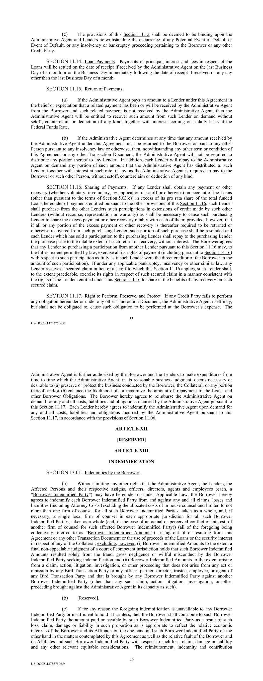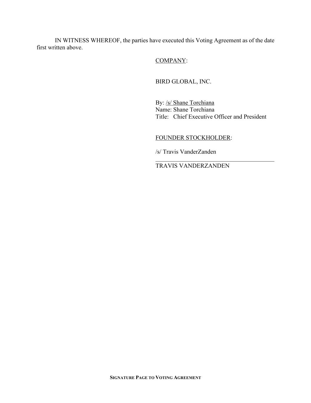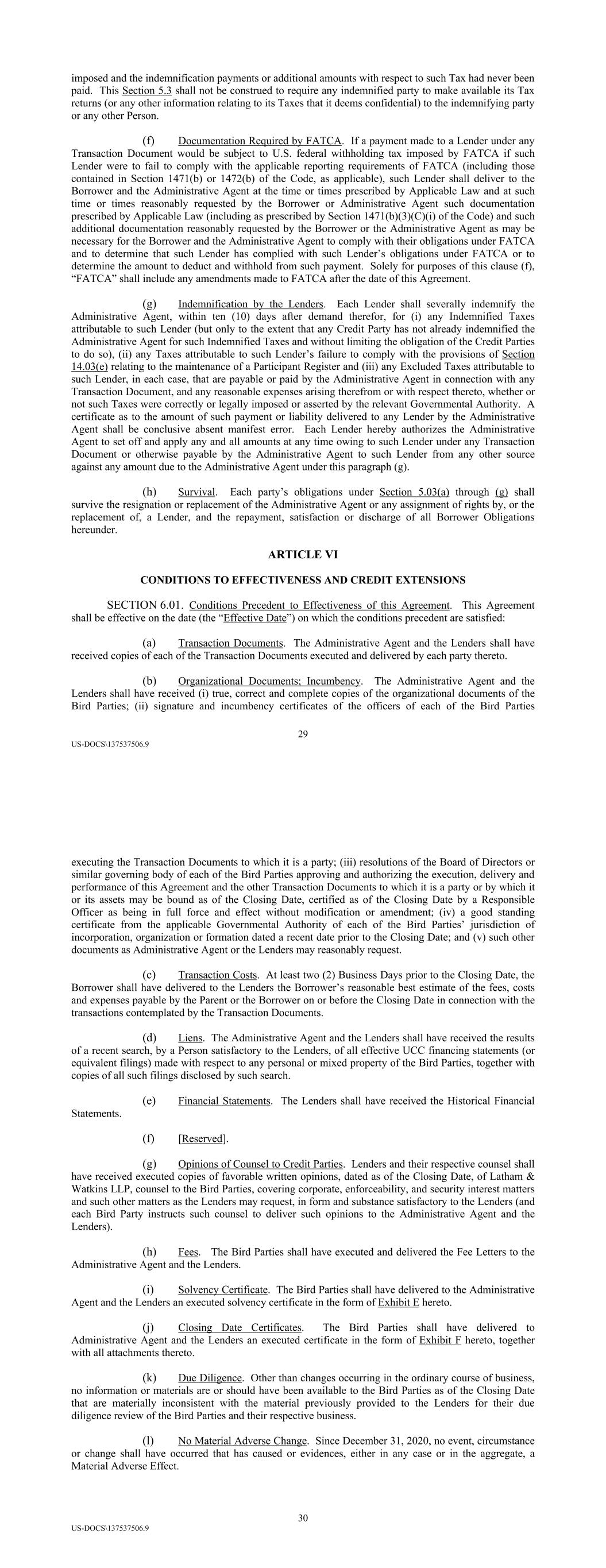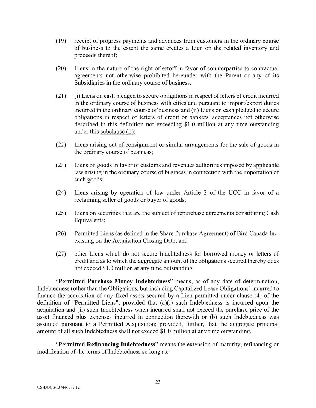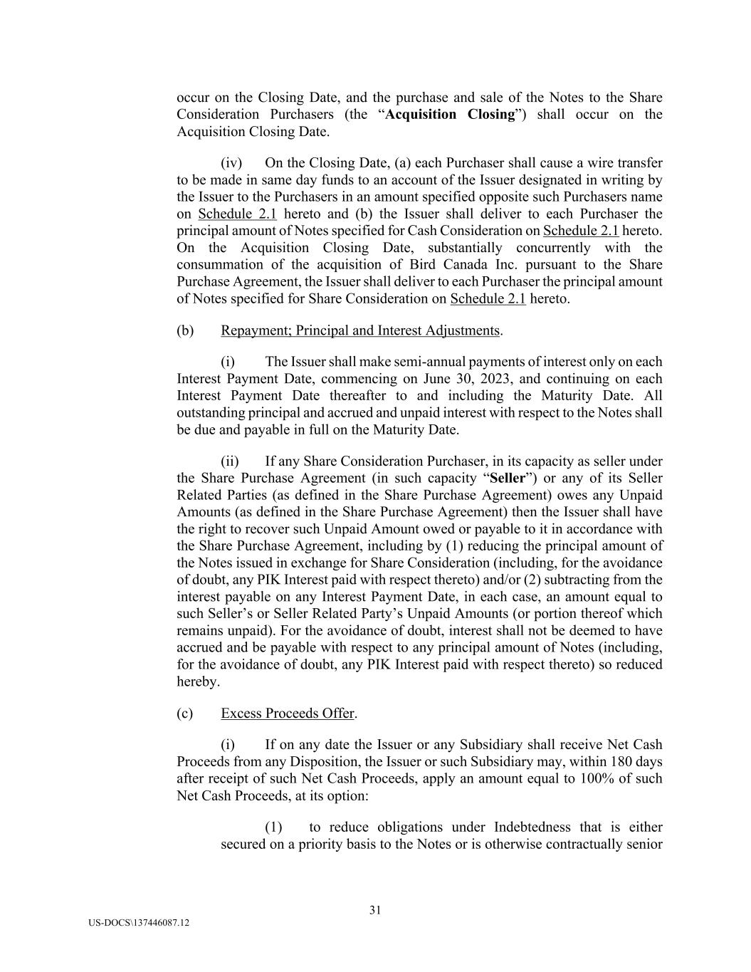The Share Purchase Agreement contains customary representations and warranties related to Bird Canada, the BC Sellers, the Purchaser and the Company. The Share Purchase Agreement contains customary indemnification provisions by the Purchaser, the Company and the BC Sellers with respect to breaches of representations and warranties and the performance of post-closing covenants. Indemnification claims will survive the closing for (i) with respect to breaches of general representations and warranties, 18 months, (ii) with respect to breaches of fundamental representations and warrants, 24 months, and (iii) with respect to post-closing covenants, in accordance with their terms or until fully performed.