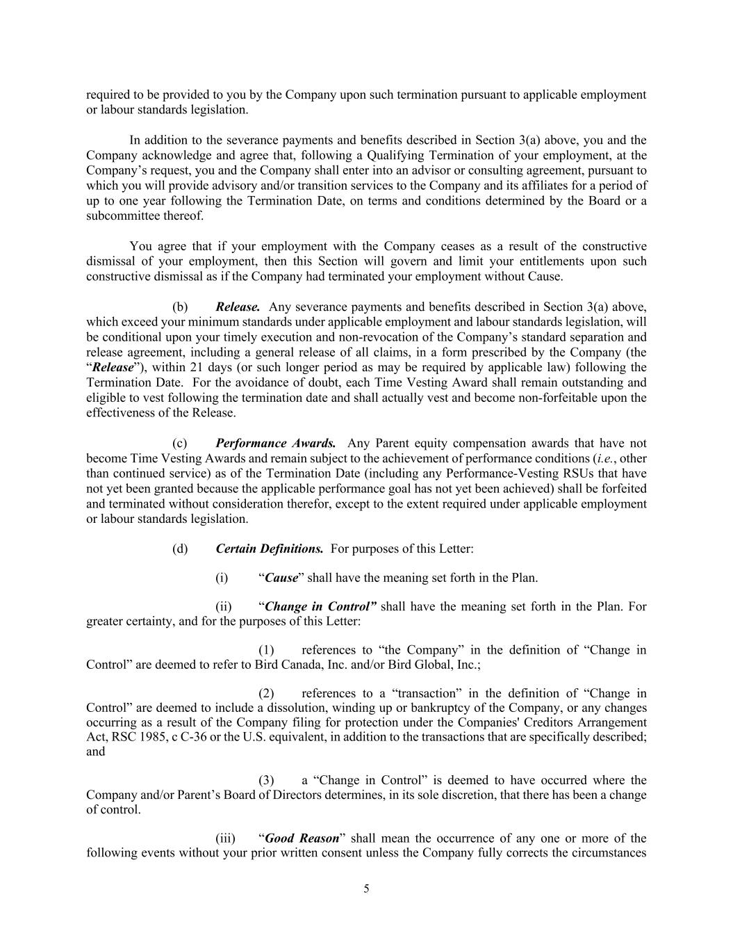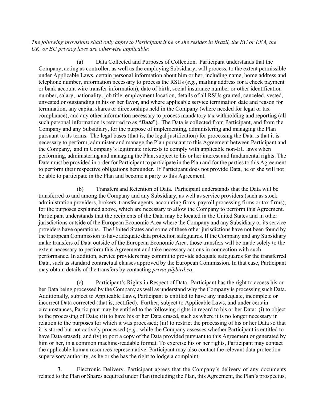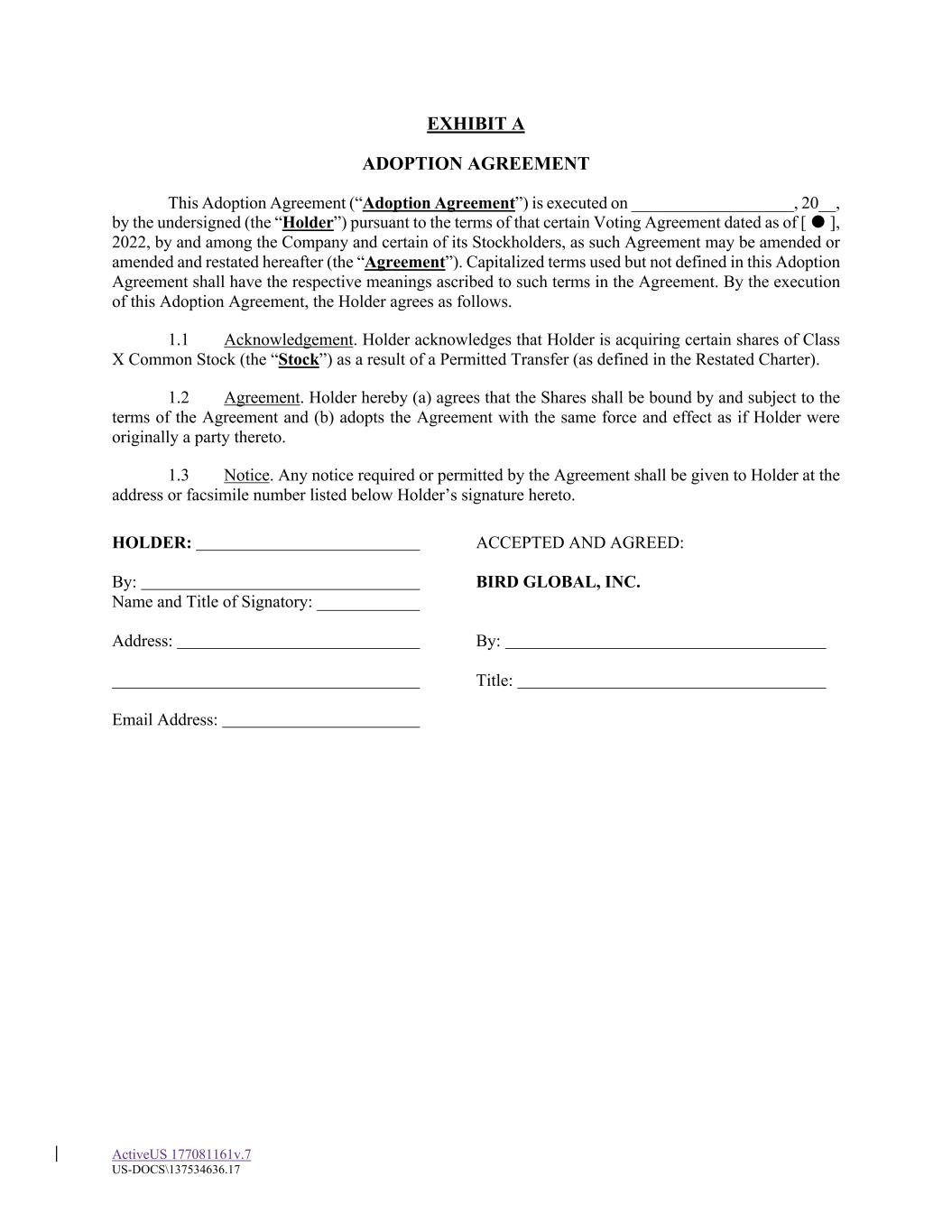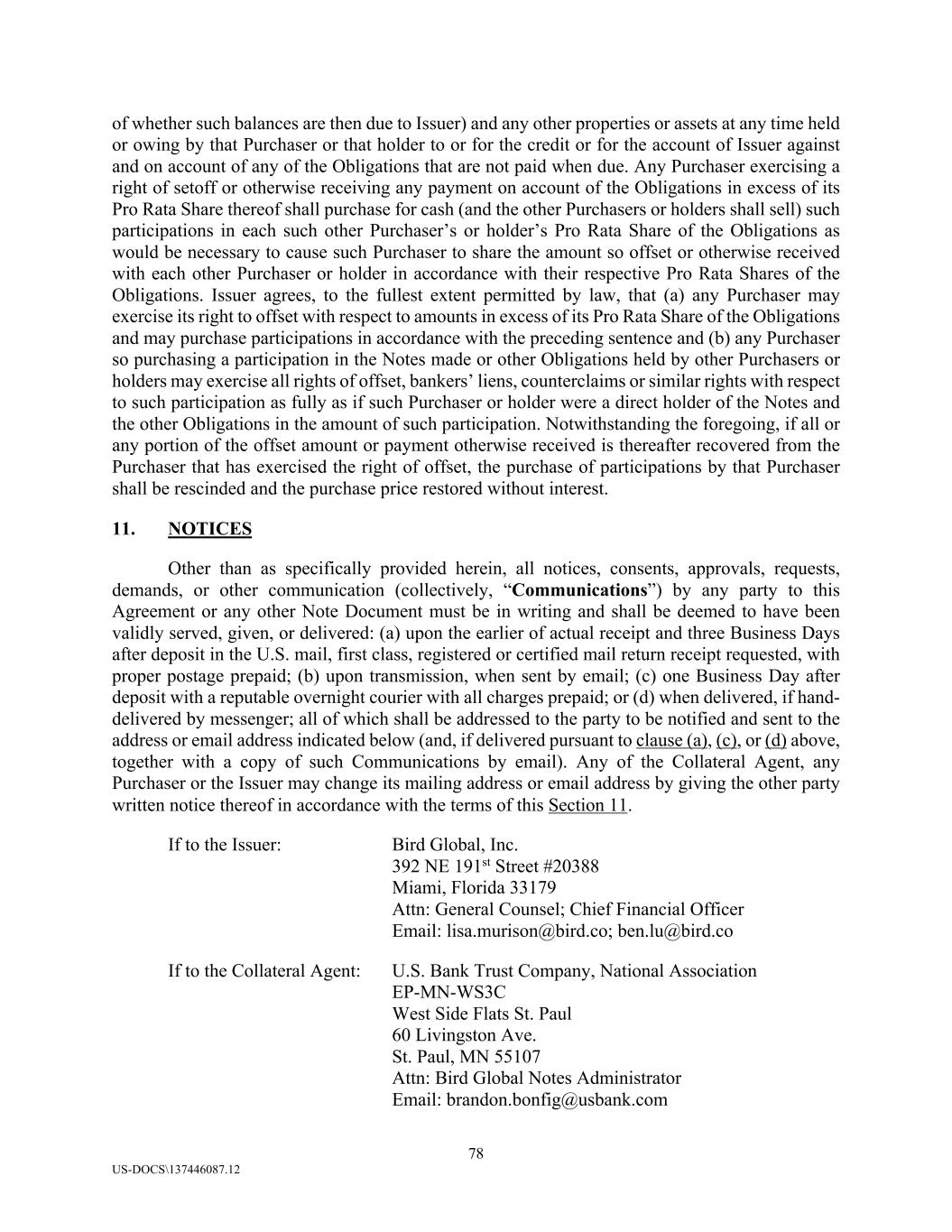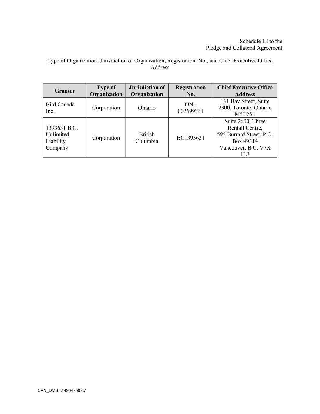 The Share Purchase Agreement contains customary representations and warranties related to Bird Canada, the BC Sellers, the Purchaser and the Company. The Share Purchase Agreement contains customary indemnification provisions by the Purchaser, the Company and the BC Sellers with respect to breaches of representations and warranties and the performance of post-closing covenants. Indemnification claims will survive the closing for (i) with respect to breaches of general representations and warranties, 18 months, (ii) with respect to breaches of fundamental representations and warrants, 24 months, and (iii) with respect to post-closing covenants, in accordance with their terms or until fully performed.