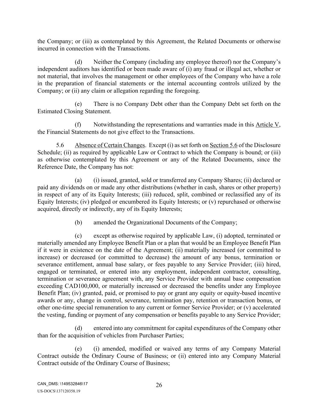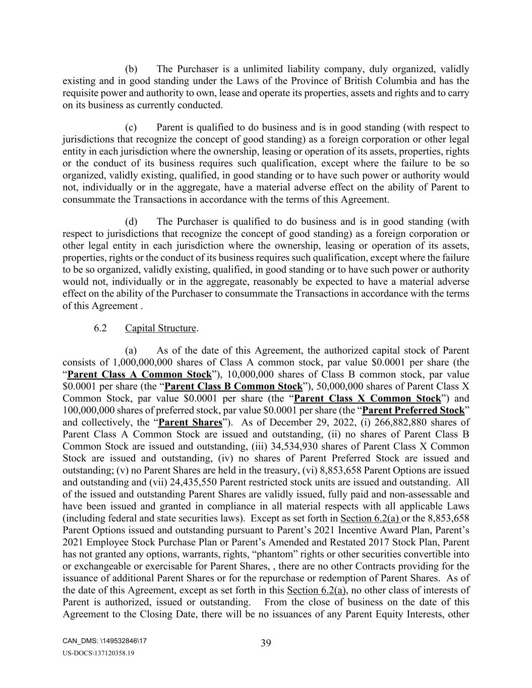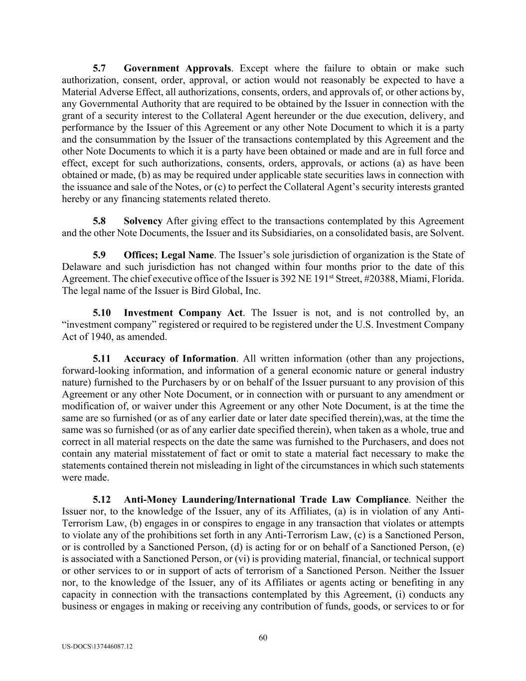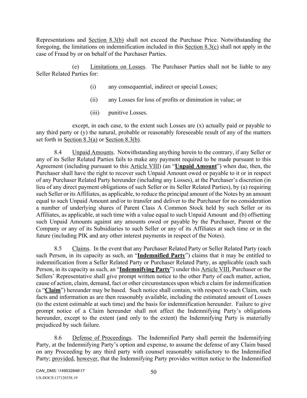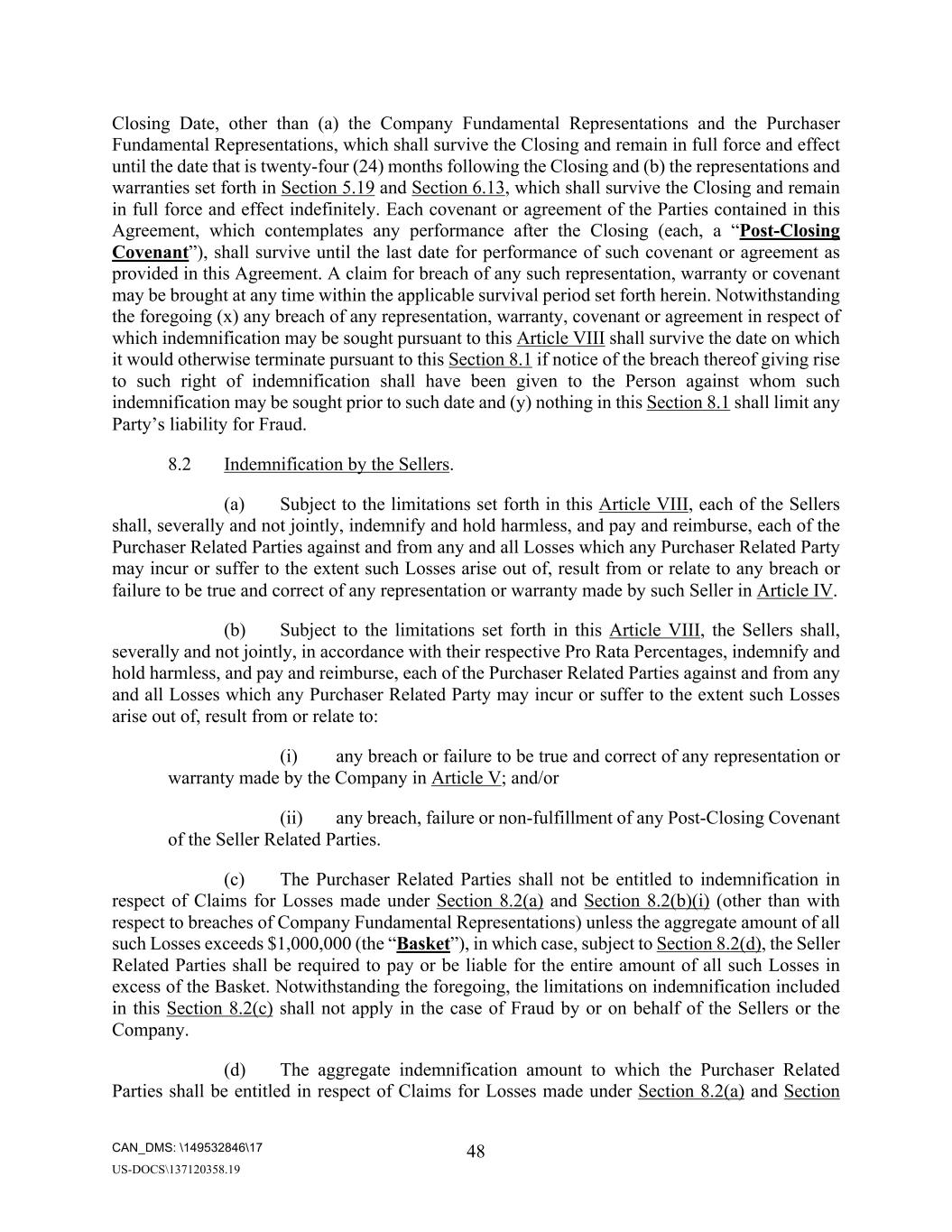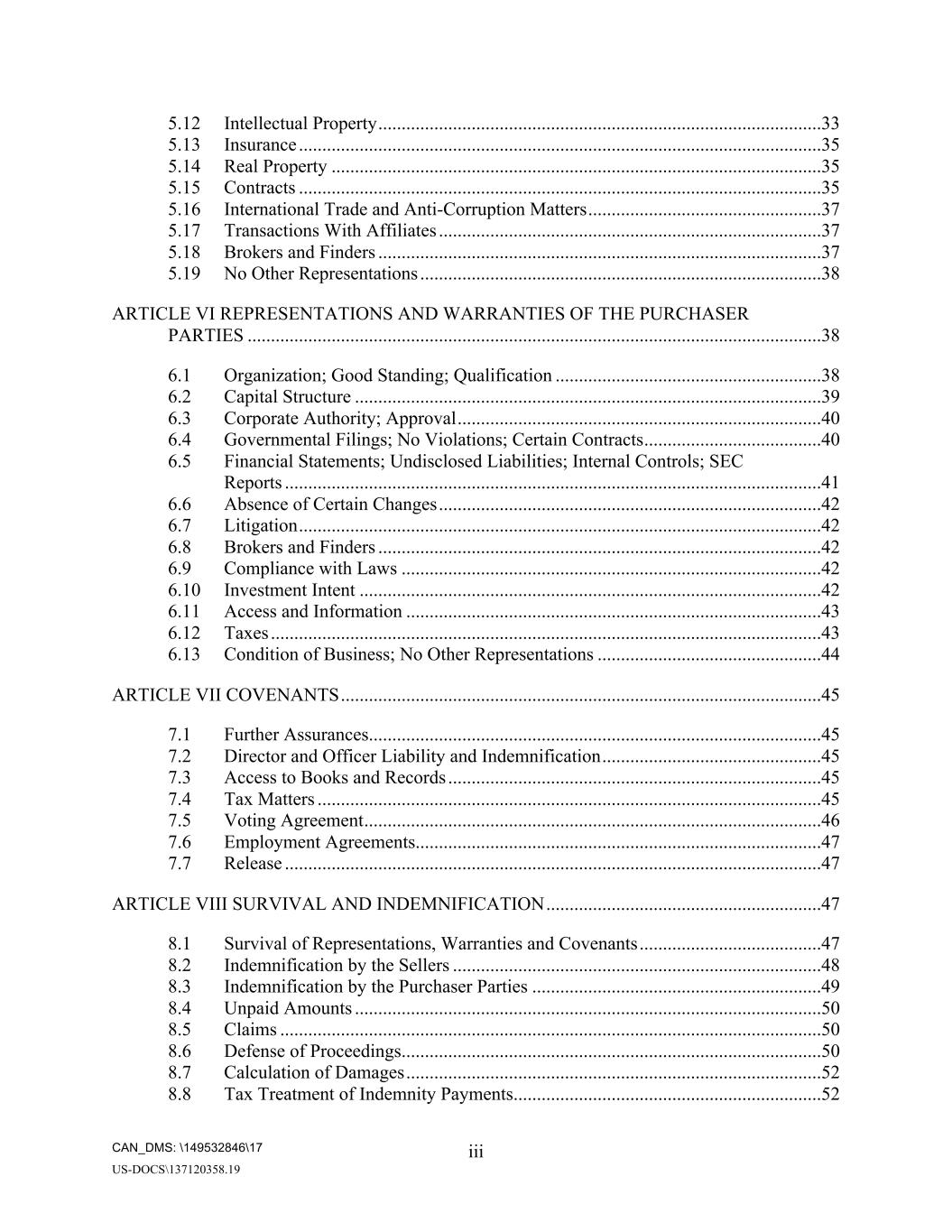 The Share Purchase Agreement contains customary representations and warranties related to Bird Canada, the BC Sellers, the Purchaser and the Company. The Share Purchase Agreement contains customary indemnification provisions by the Purchaser, the Company and the BC Sellers with respect to breaches of representations and warranties and the performance of post-closing covenants. Indemnification claims will survive the closing for (i) with respect to breaches of general representations and warranties, 18 months, (ii) with respect to breaches of fundamental representations and warrants, 24 months, and (iii) with respect to post-closing covenants, in accordance with their terms or until fully performed.