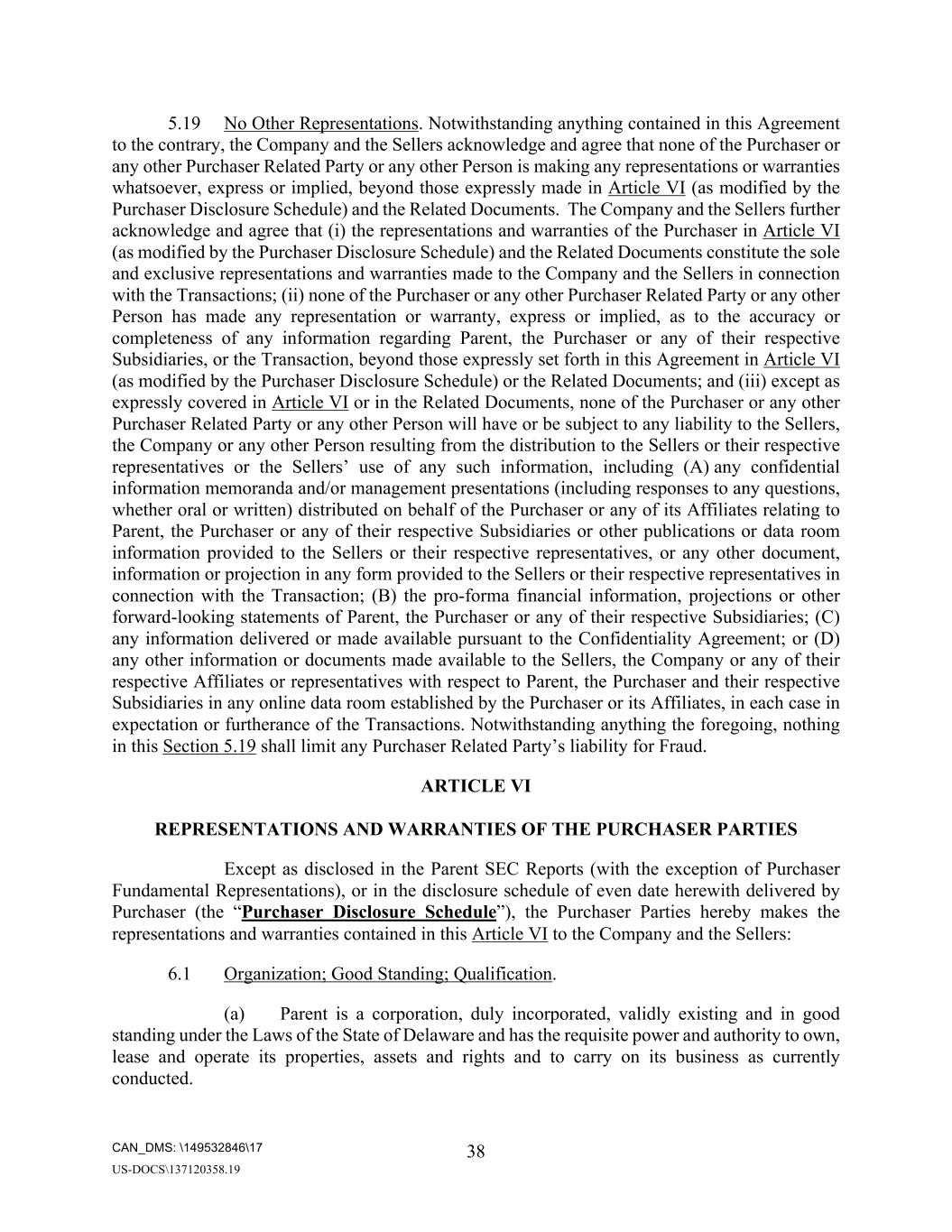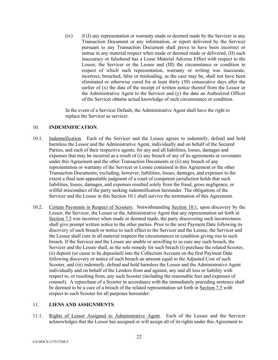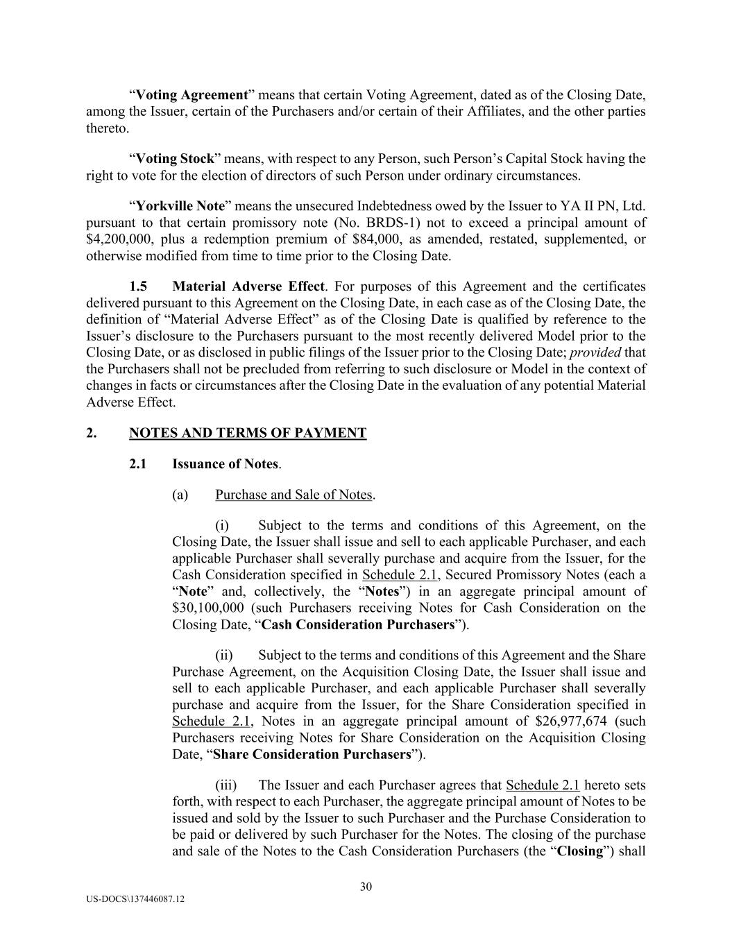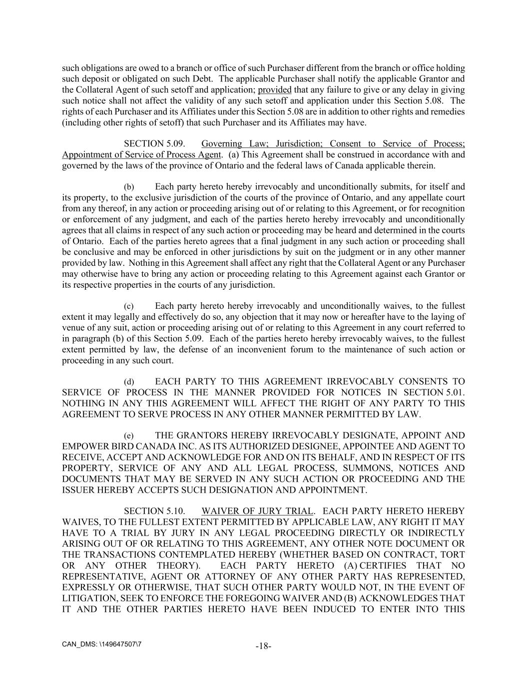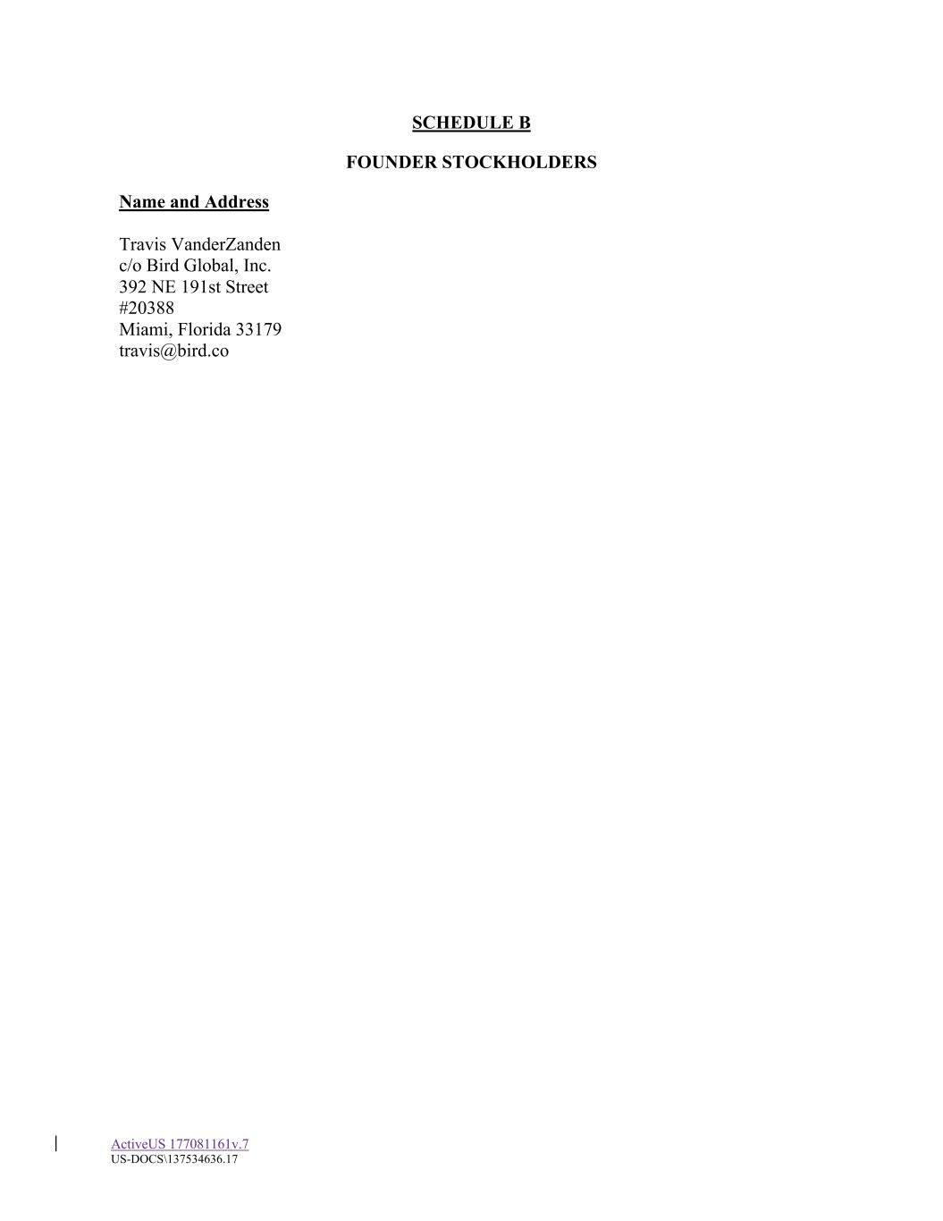The Share Purchase Agreement contains customary representations and warranties related to Bird Canada, the BC Sellers, the Purchaser and the Company. The Share Purchase Agreement contains customary indemnification provisions by the Purchaser, the Company and the BC Sellers with respect to breaches of representations and warranties and the performance of post-closing covenants. Indemnification claims will survive the closing for (i) with respect to breaches of general representations and warranties, 18 months, (ii) with respect to breaches of fundamental representations and warrants, 24 months, and (iii) with respect to post-closing covenants, in accordance with their terms or until fully performed.