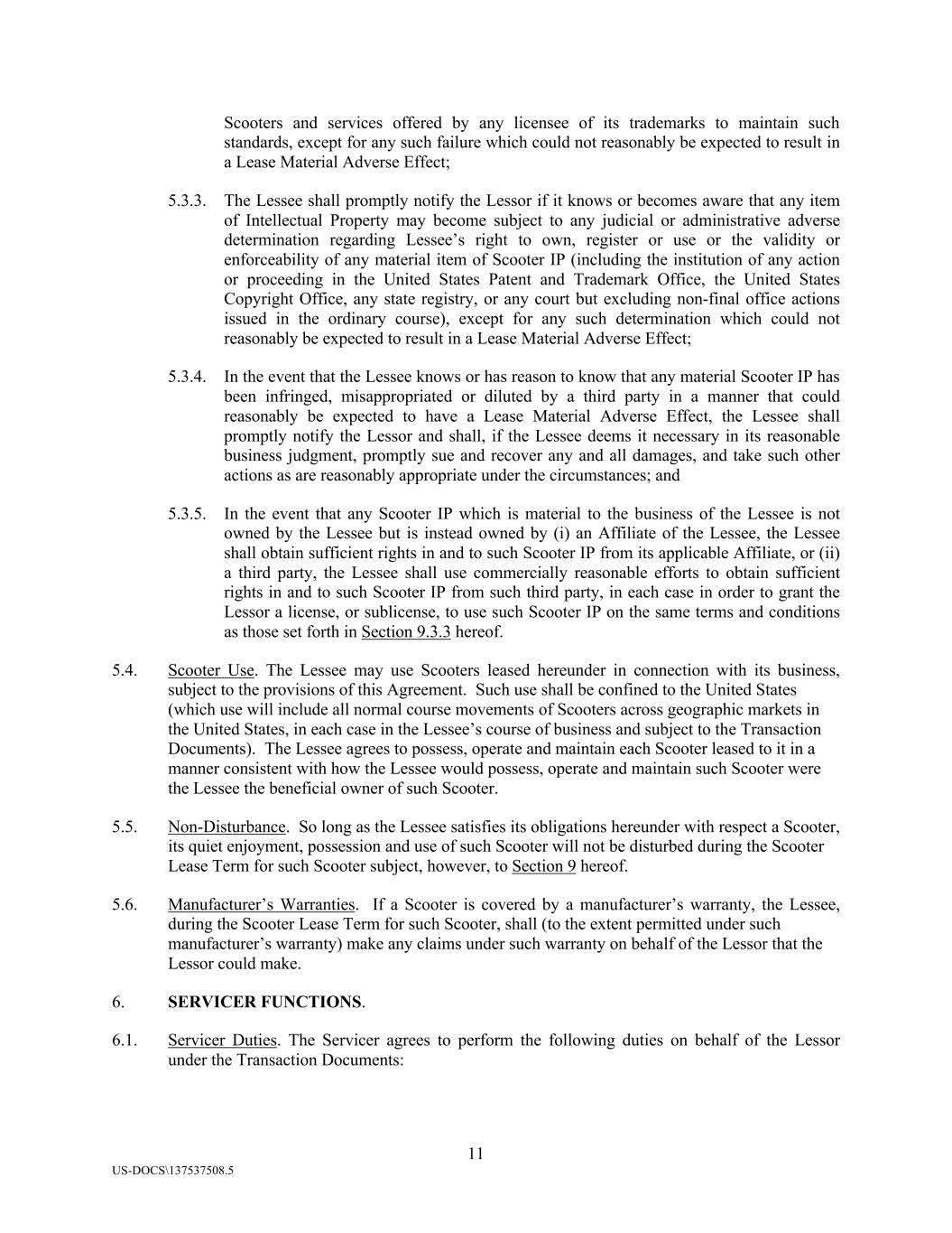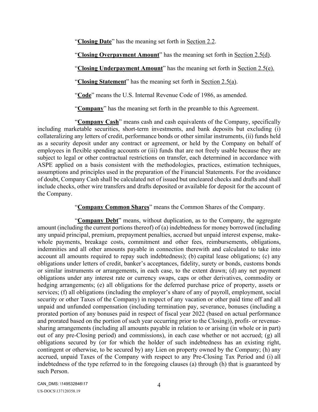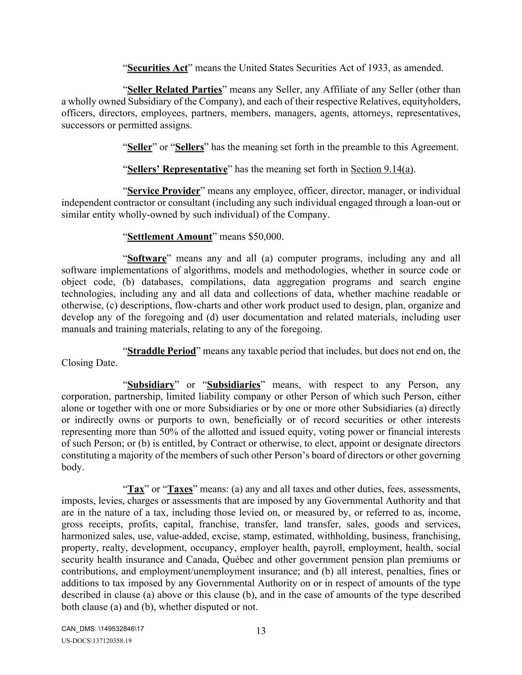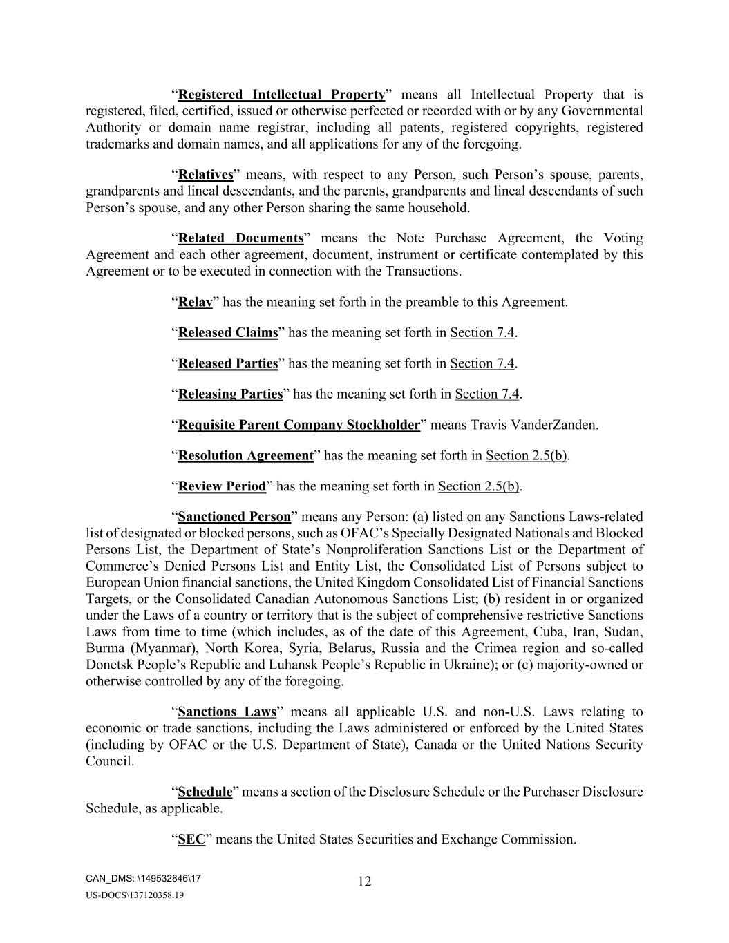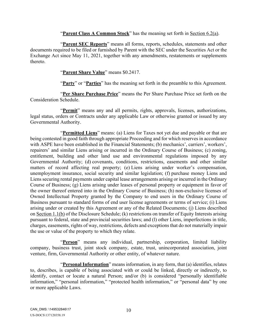 The Share Purchase Agreement contains customary representations and warranties related to Bird Canada, the BC Sellers, the Purchaser and the Company. The Share Purchase Agreement contains customary indemnification provisions by the Purchaser, the Company and the BC Sellers with respect to breaches of representations and warranties and the performance of post-closing covenants. Indemnification claims will survive the closing for (i) with respect to breaches of general representations and warranties, 18 months, (ii) with respect to breaches of fundamental representations and warrants, 24 months, and (iii) with respect to post-closing covenants, in accordance with their terms or until fully performed.