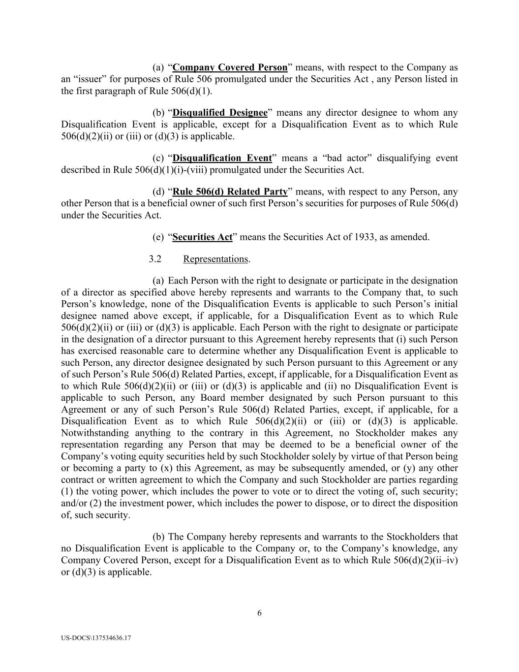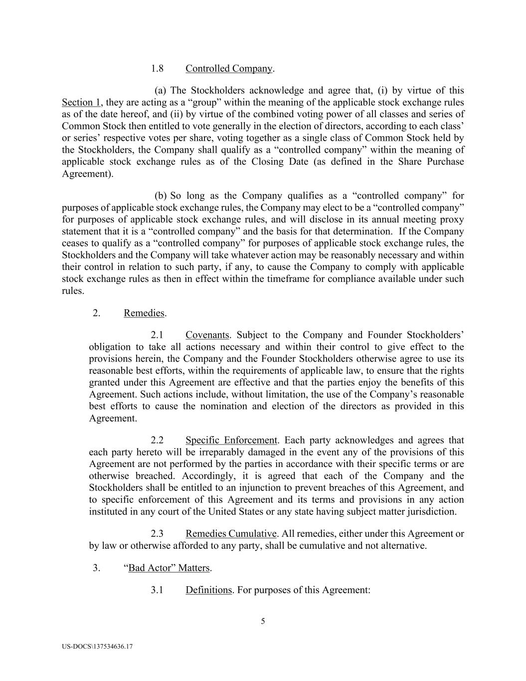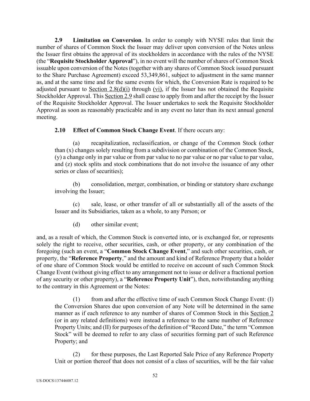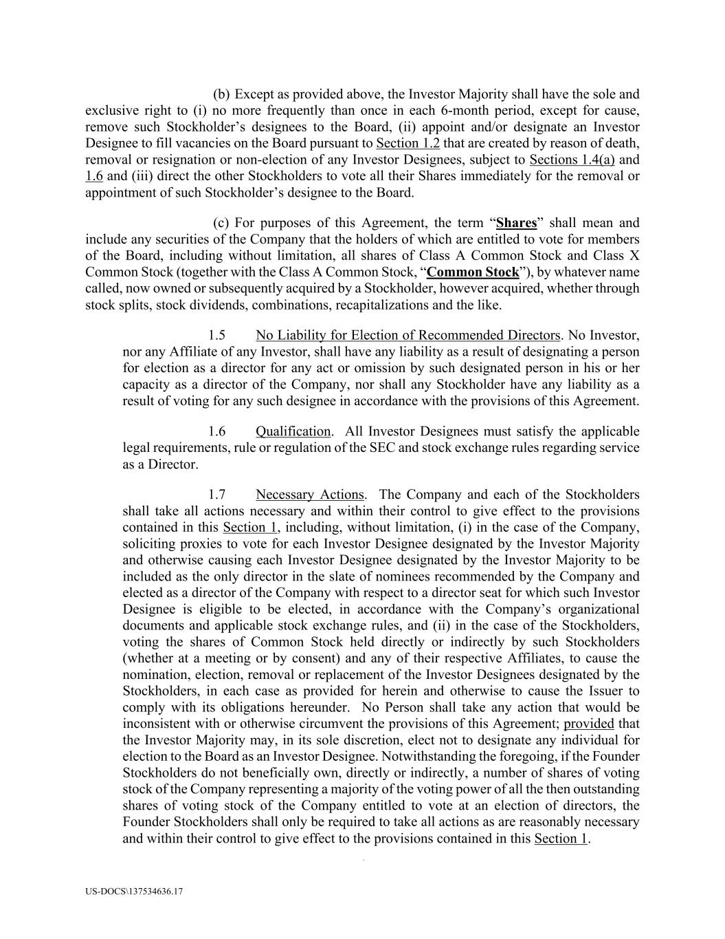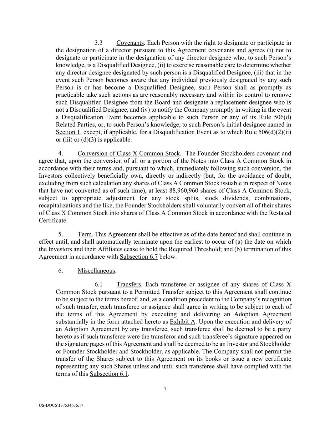 In addition, under the Voting Agreement, the Founder Stockholder agreed that he will voluntarily convert (in accordance with the terms of the Company’s Amended and Restated Certificate of Incorporation) into Class A Common Stock all of the shares of the Company’s Class X common stock, par value $0.0001 per share, that as of such time he beneficially owns, directly or indirectly, upon the conversion of all or a portion of the Notes into Class A Common Stock in accordance with their terms and, pursuant to which, immediately following such conversion, the Investors collectively beneficially own, directly or indirectly (but excluding from such calculation any shares of Class A Common Stock issuable in respect of Notes that have not been converted as of such time), at least 88,960,960 shares of Class A Common Stock, subject to appropriate adjustment for any stock splits, stock dividends, combinations, recapitalizations and the like.