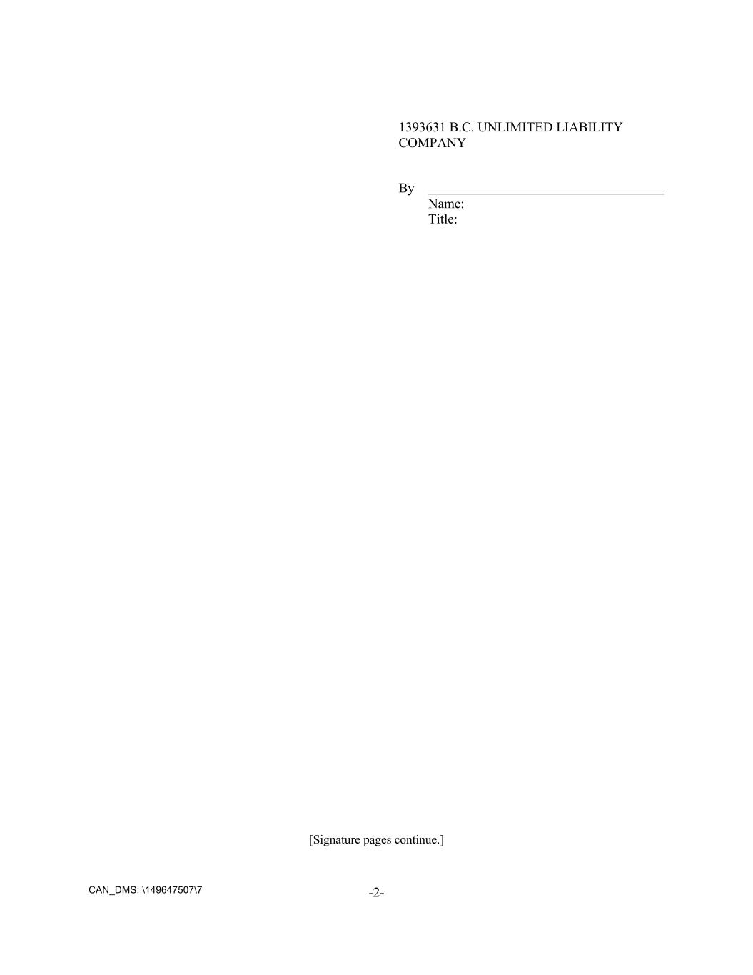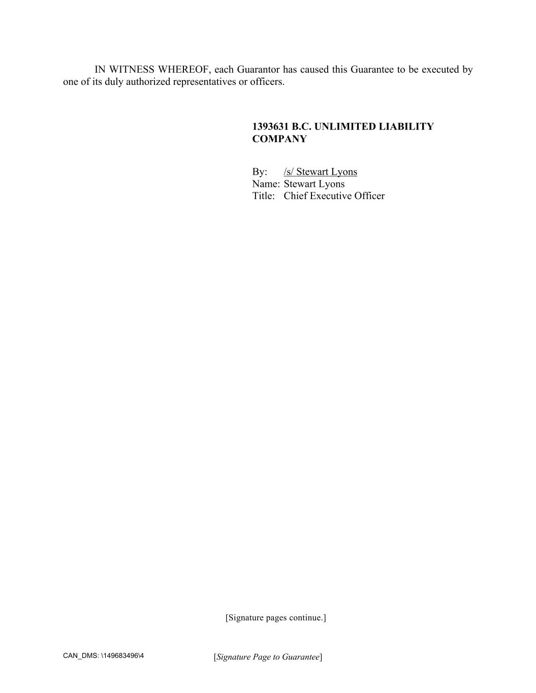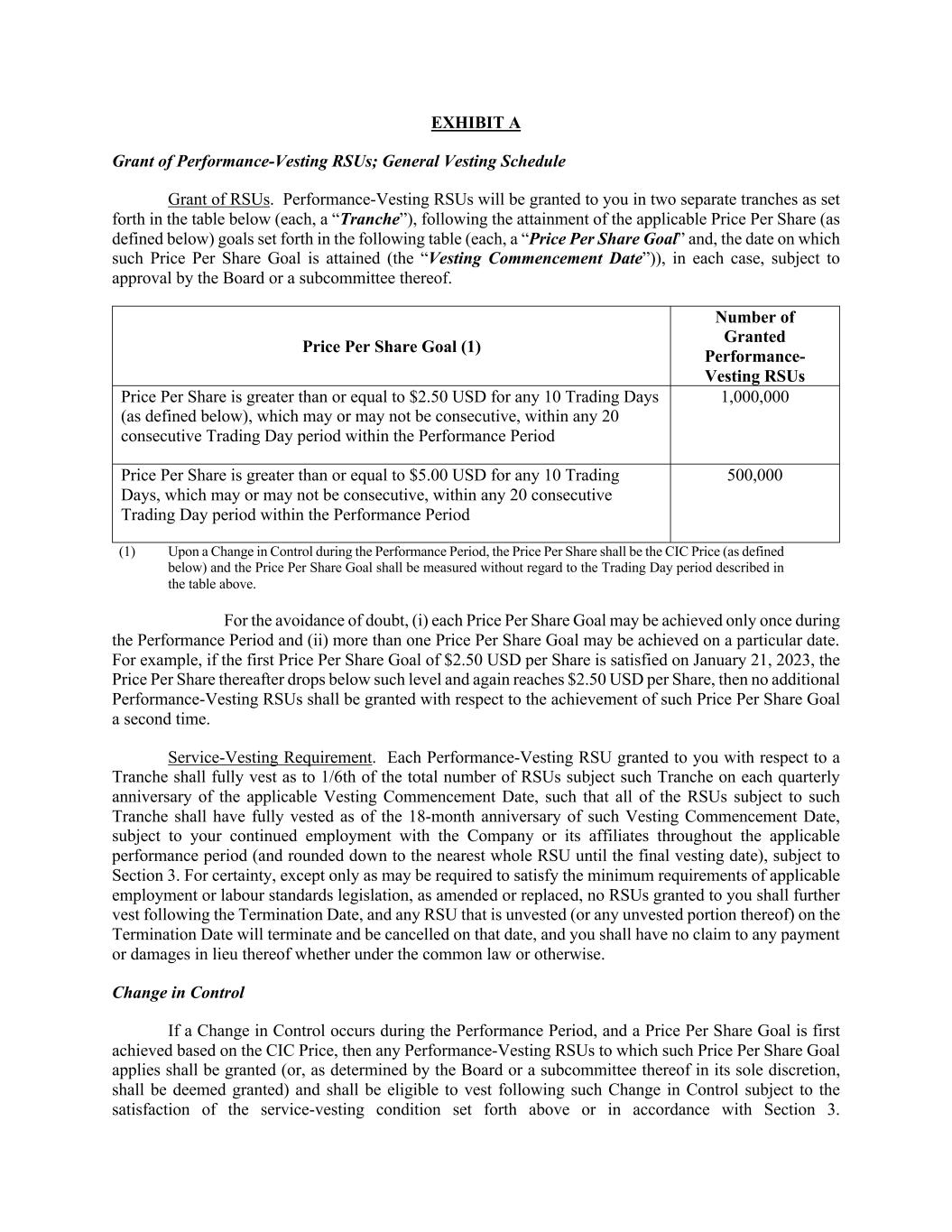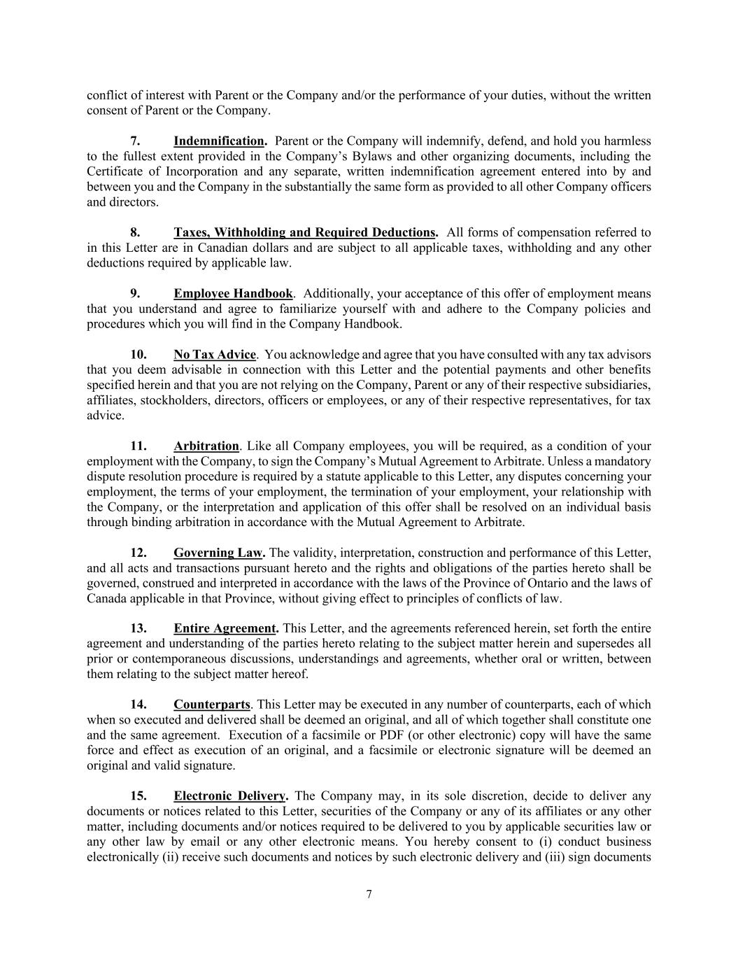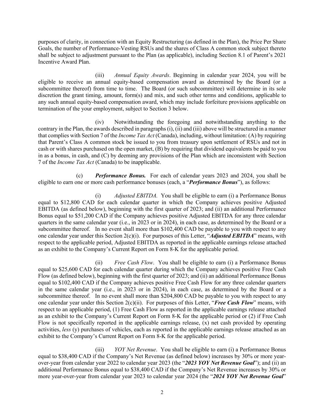 Under the Letter Agreements, each executive is entitled to receive an annual base salary of $682,000 CAD, pro-rated for any partial year of employment. In addition, during calendar years 2023 and 2024, the executives are eligible to earn annual and quarterly cash performance bonuses (each, a “performance bonus”) based on the achievement of adjusted EBITDA, free cash flow and net revenue goals. The maximum potential bonus opportunity for Messrs. Lyons and Washinushi for a single calendar year is equal to $550,400 CAD (for each of 2023 and 2024). In addition, Mr. Washinushi is entitled to receive a $100,000 CAD signing bonus, which must be repaid, in whole or in part, in connection with a termination for “cause” or without “good reason” (as defined in the applicable Letter Agreement) prior to the second anniversary of his employment start date.
