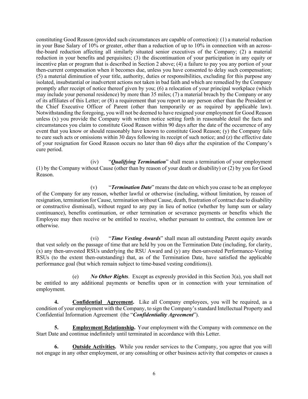 In addition, under the Letter Agreements, if an executive experiences a termination of employment without “cause” or by the executive for “good reason” (each, as defined in the applicable Letter Agreement), then the executive will receive:
