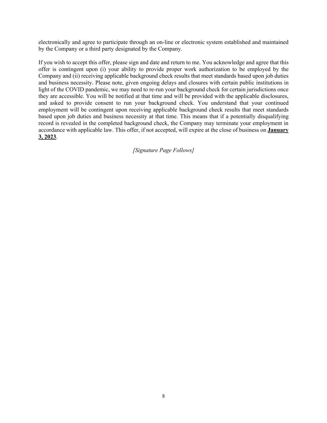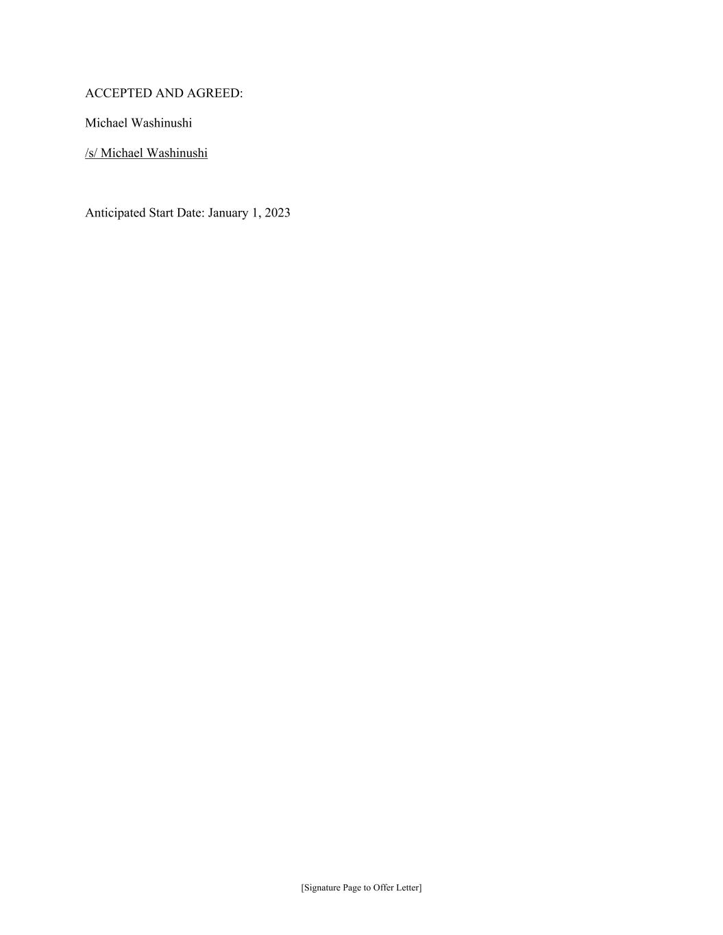 On December 29, 2022, in connection with their respective appointments, the Board approved entering into an Employment Letter Agreement (the “Letter Agreements”) with each of Messrs. Lyons and Washinushi (the “executives”). The material terms of the Letter Agreements are described below.