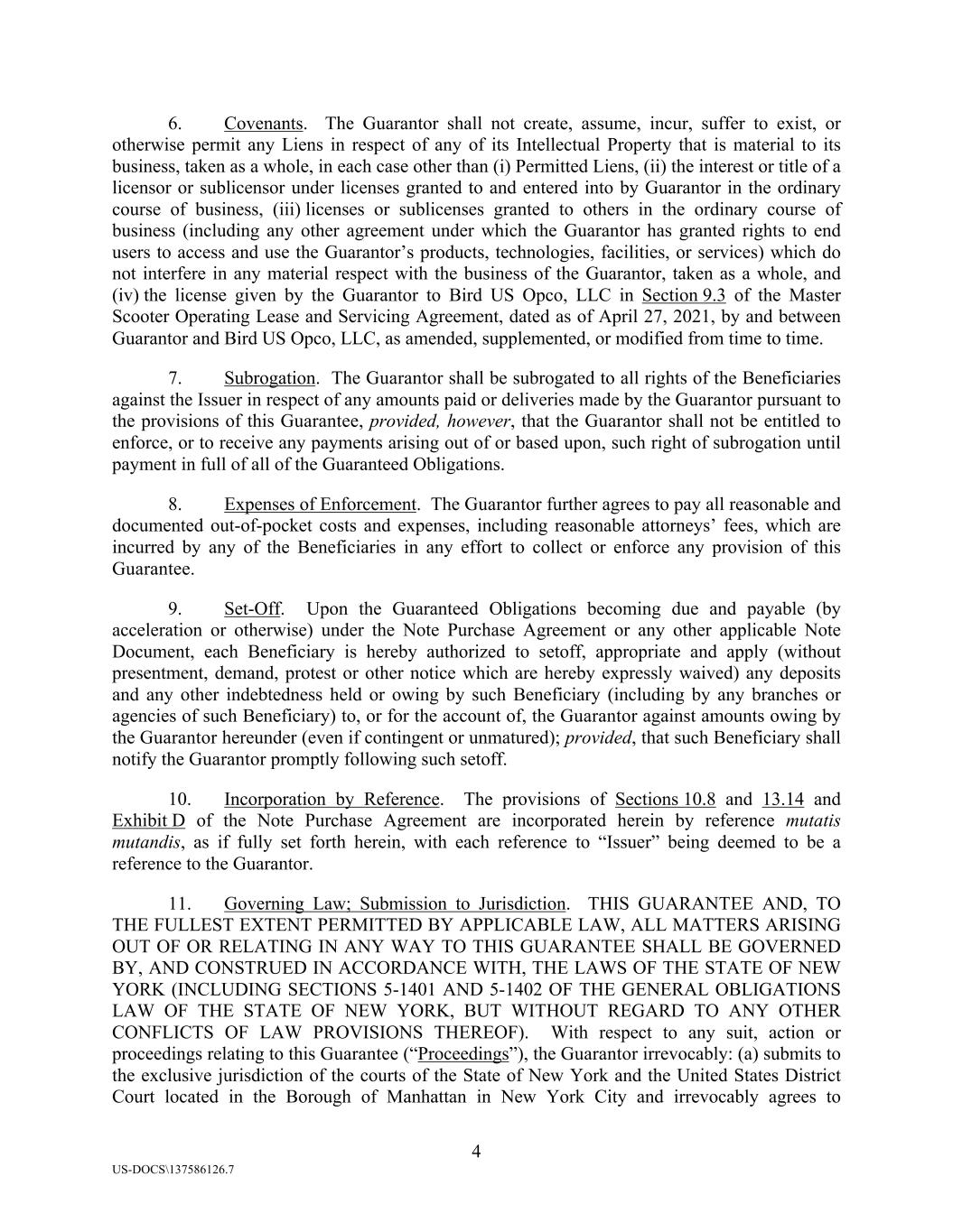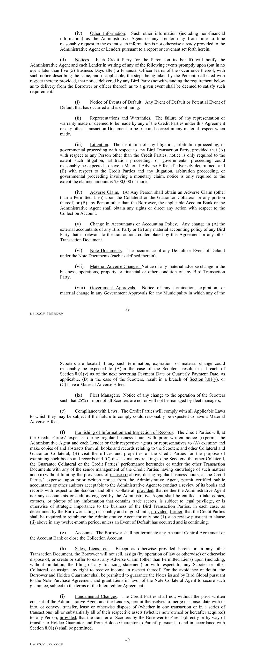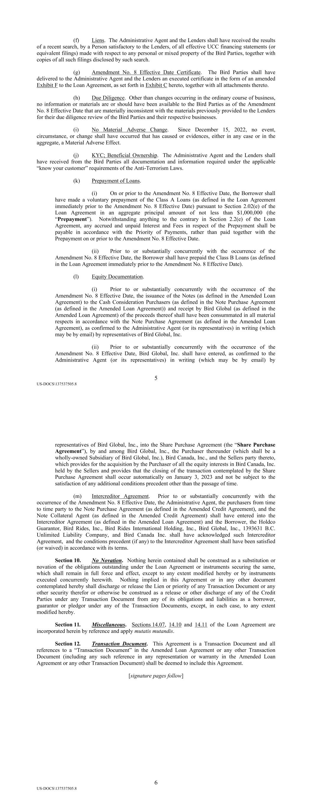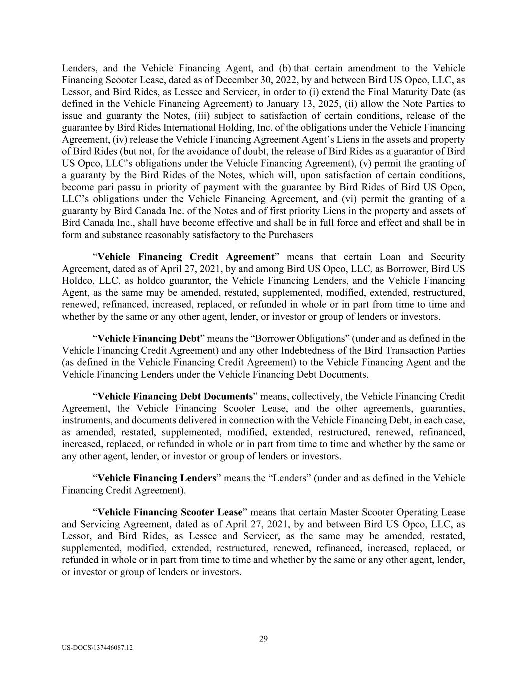 The foregoing descriptions of the Note Purchase Agreement, the Opco Guarantee, the Holdco Guarantee, the Bird Rides International Guarantee, the Bird Canada Guarantee, the Bird Rides Guarantee, the Canadian Pledge Agreement and the Canadian Collateral Agreement are not complete and are qualified in their entirety by reference to the full text of such