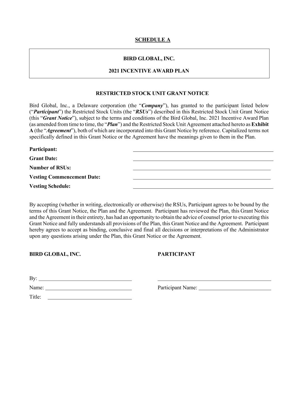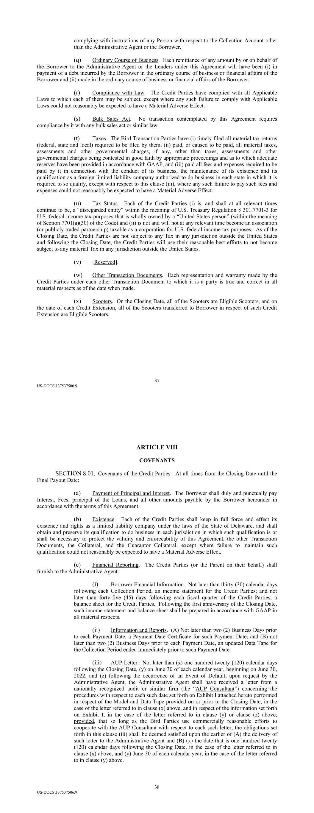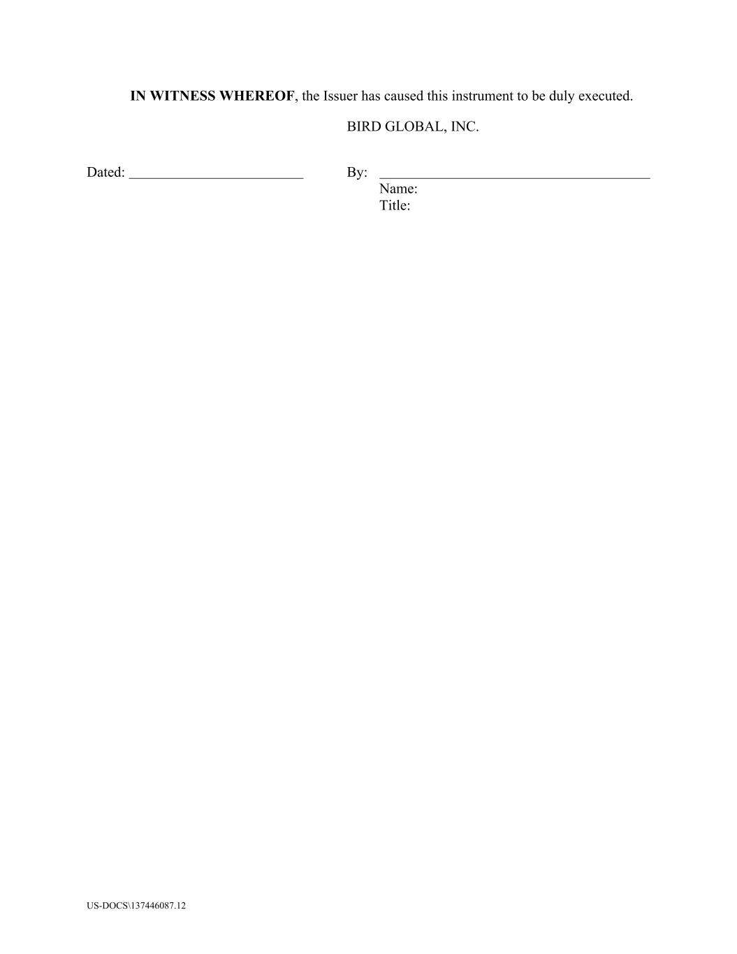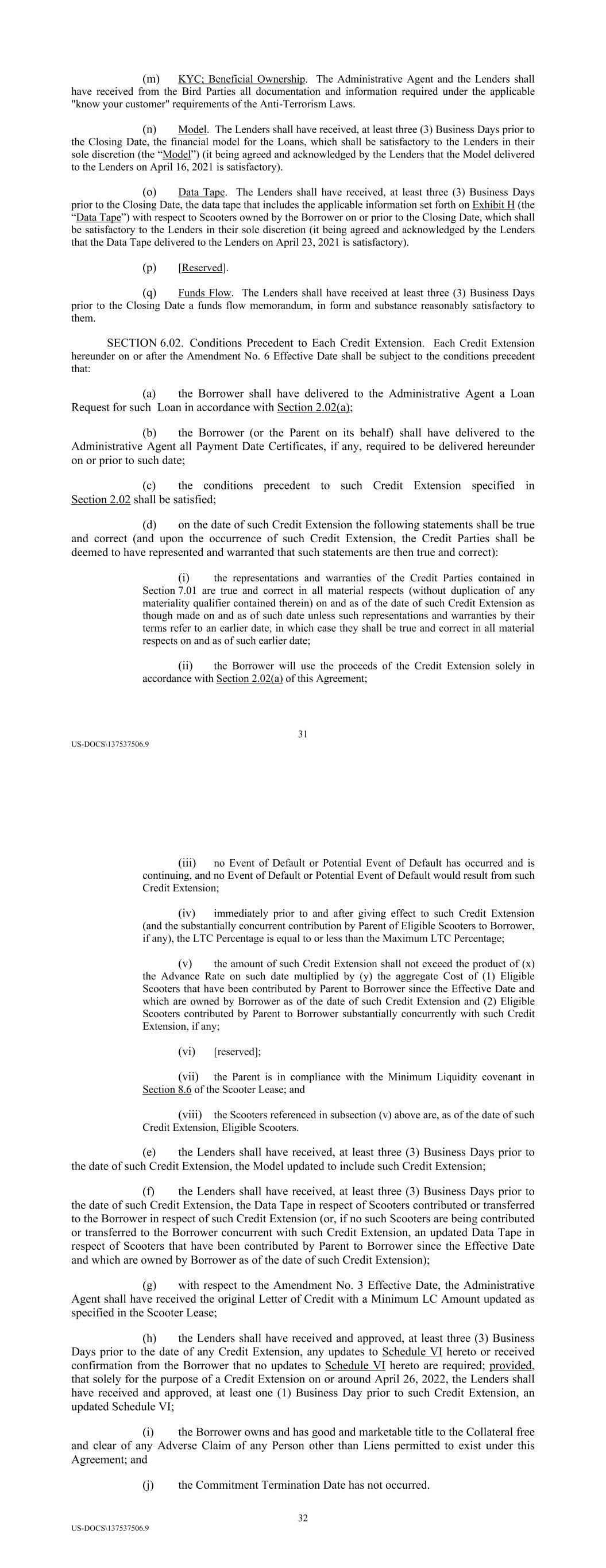 The foregoing descriptions of the Note Purchase Agreement, the Opco Guarantee, the Holdco Guarantee, the Bird Rides International Guarantee, the Bird Canada Guarantee, the Bird Rides Guarantee, the Canadian Pledge Agreement and the Canadian Collateral Agreement are not complete and are qualified in their entirety by reference to the full text of such
