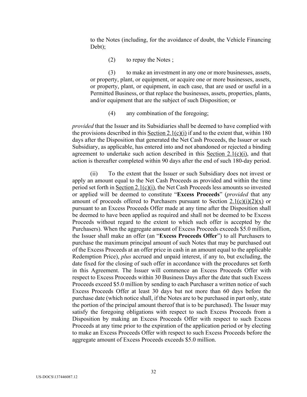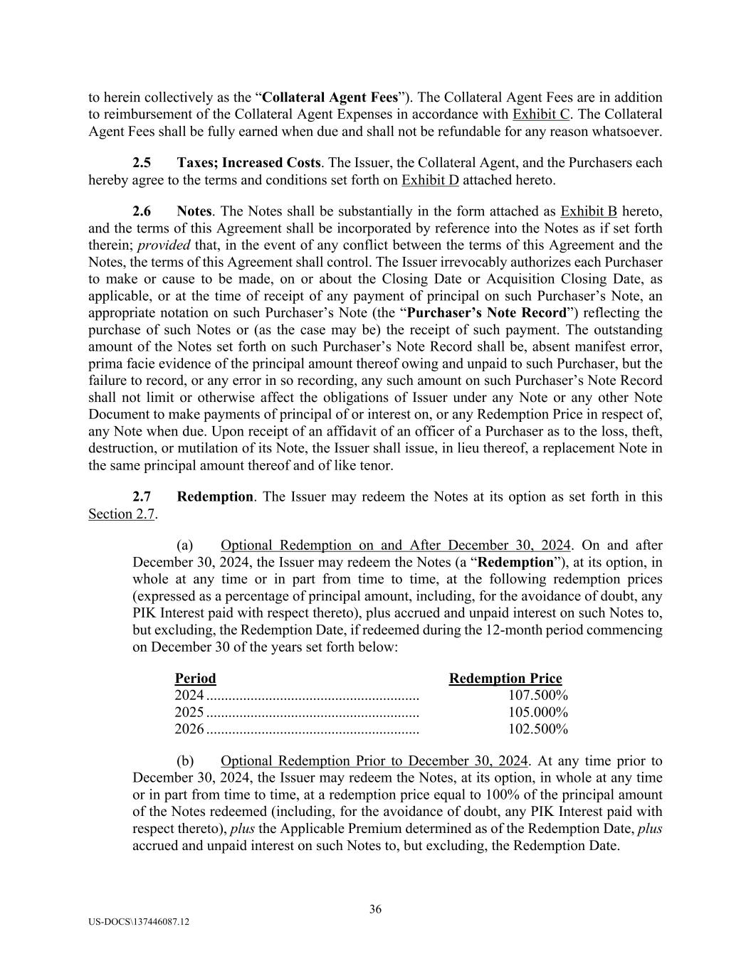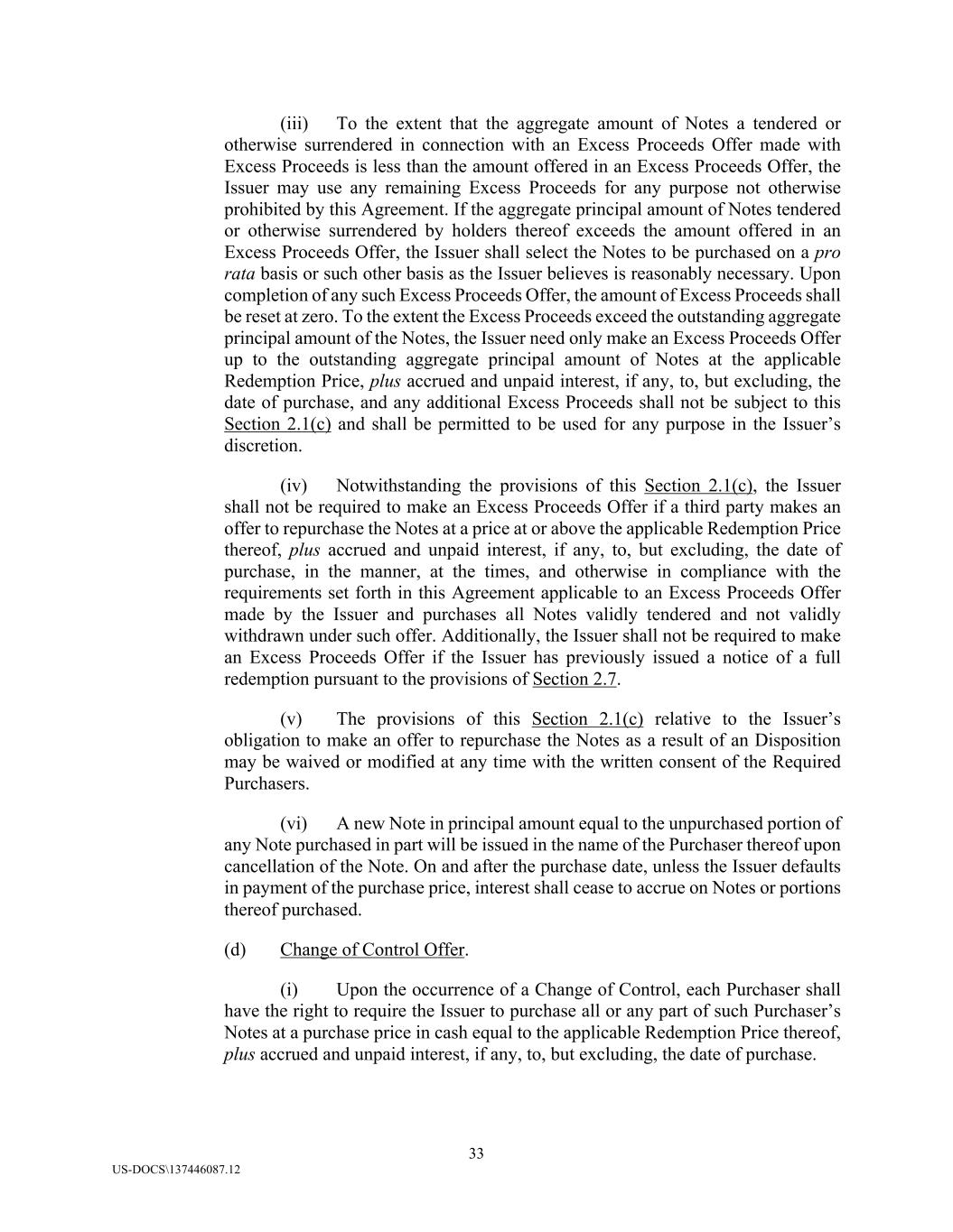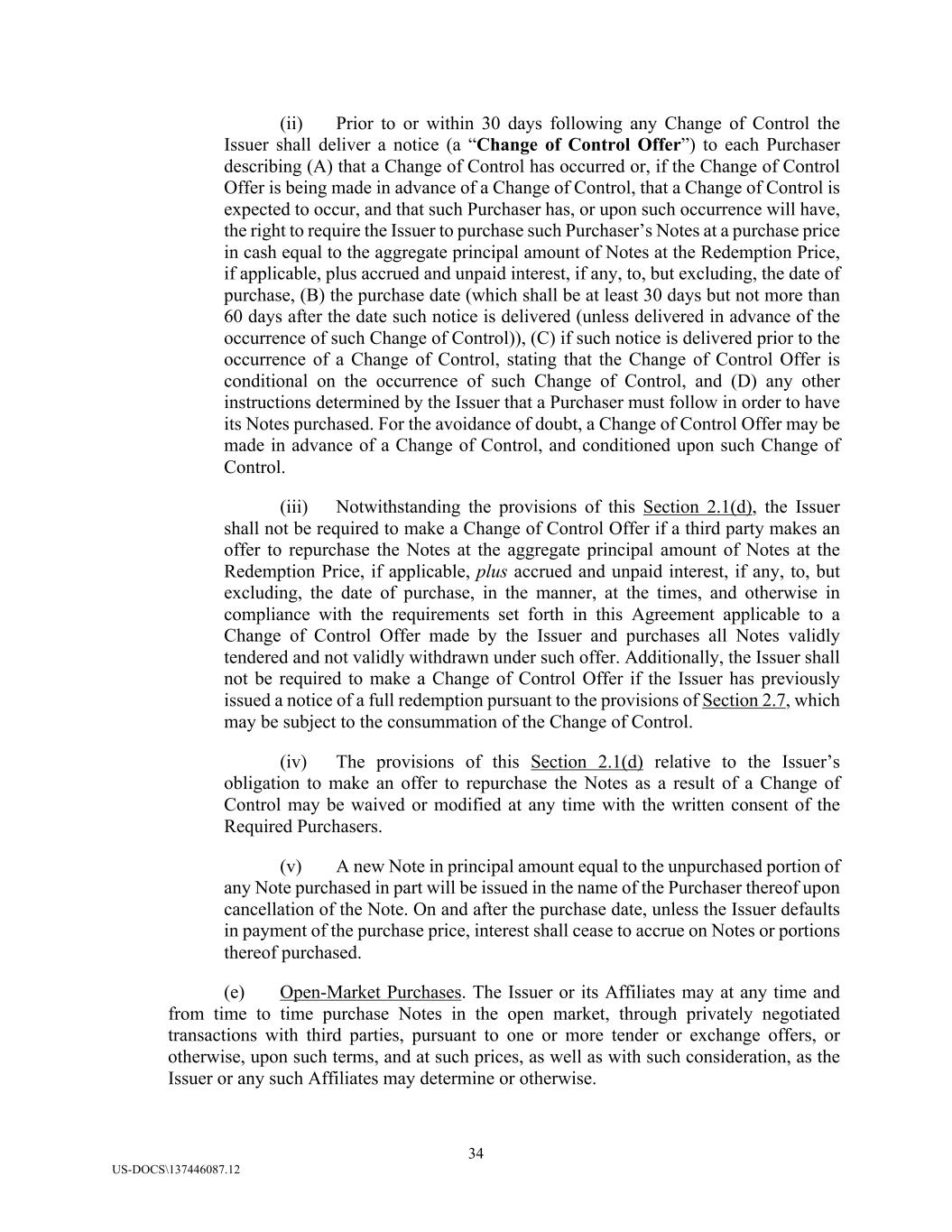 The Company will be required to offer to repurchase Notes from Note Purchasers at the applicable optional redemption price discussed above, together with accrued and unpaid interest, if any, to, but excluding, the applicable repurchase date, in certain circumstances, including following a significant asset disposition or a change of control.