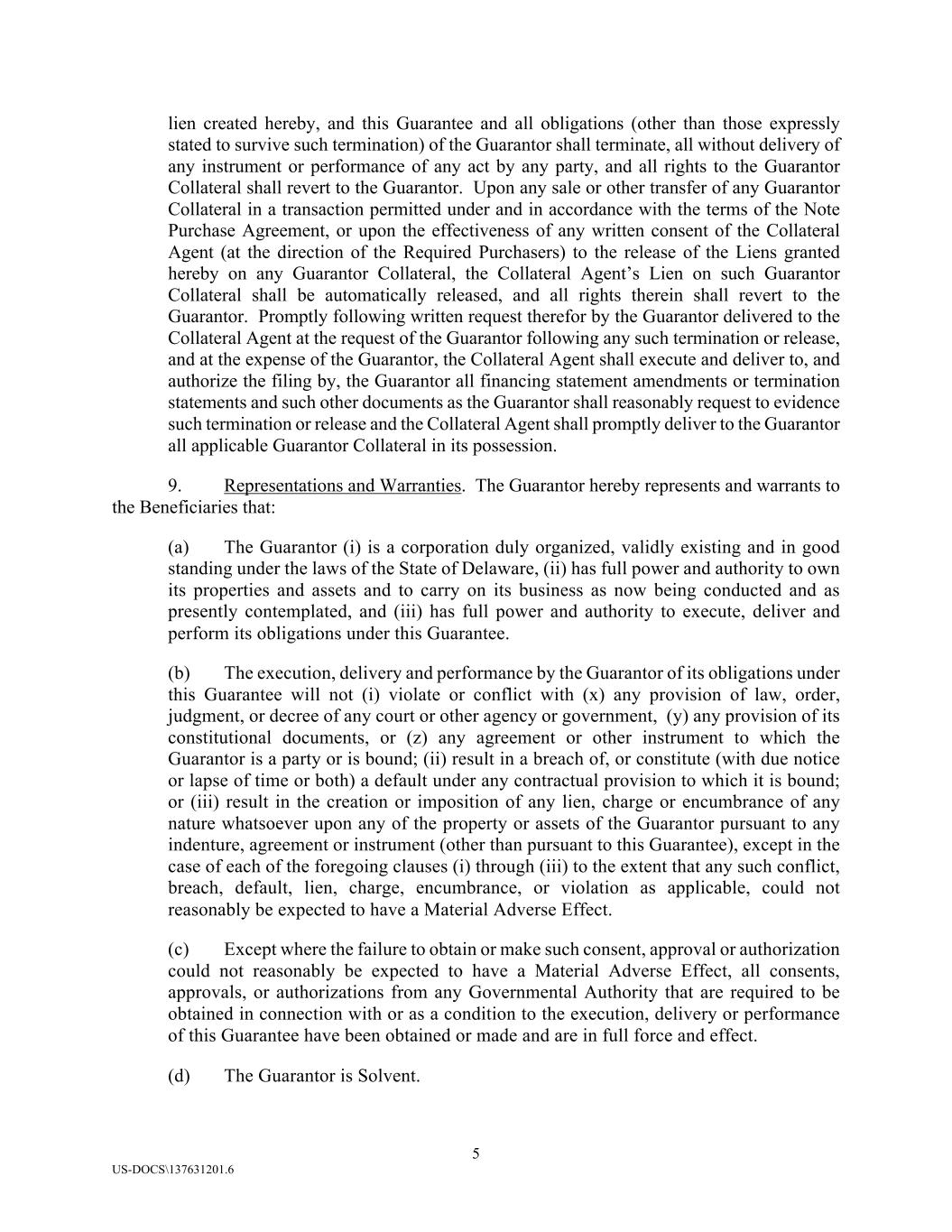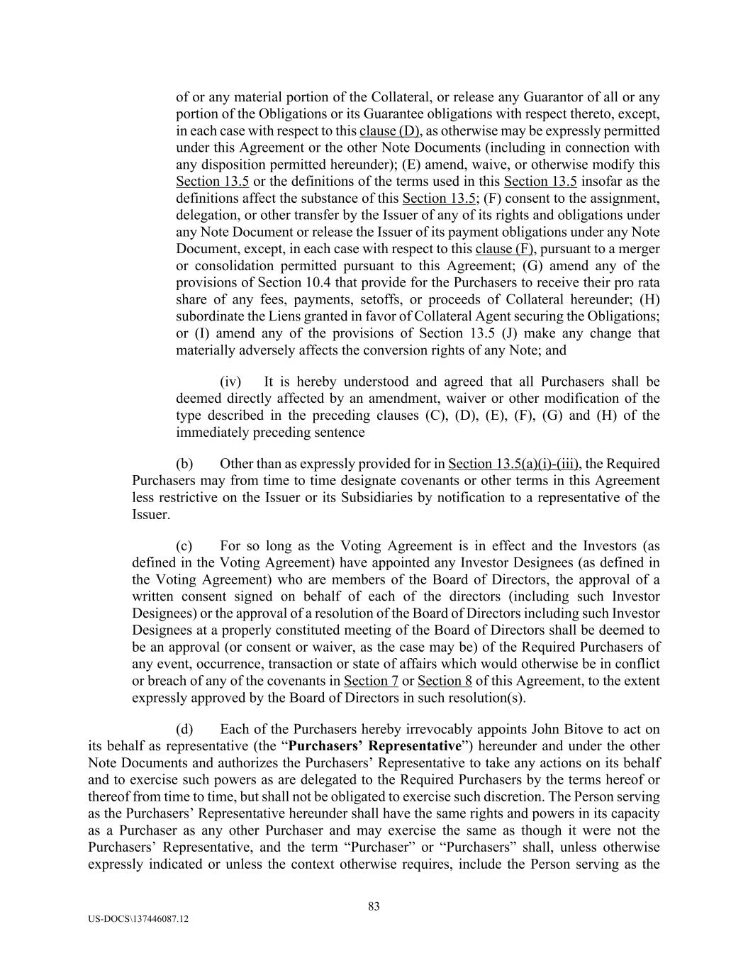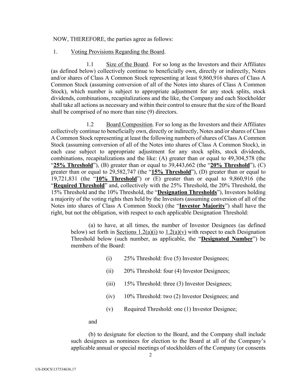 The Voting Agreement will terminate upon the earlier to occur of (a) the date on which the Investors and their affiliates cease to beneficially own, directly or indirectly, 9,860,916 shares of Class A Common Stock (assuming conversion of the Notes into shares of Class A Common Stock in accordance with their terms and subject to appropriate adjustment for any stock splits, stock dividends, combinations, recapitalizations and the like) and (b) mutual written agreement among the parties to the Voting Agreement.