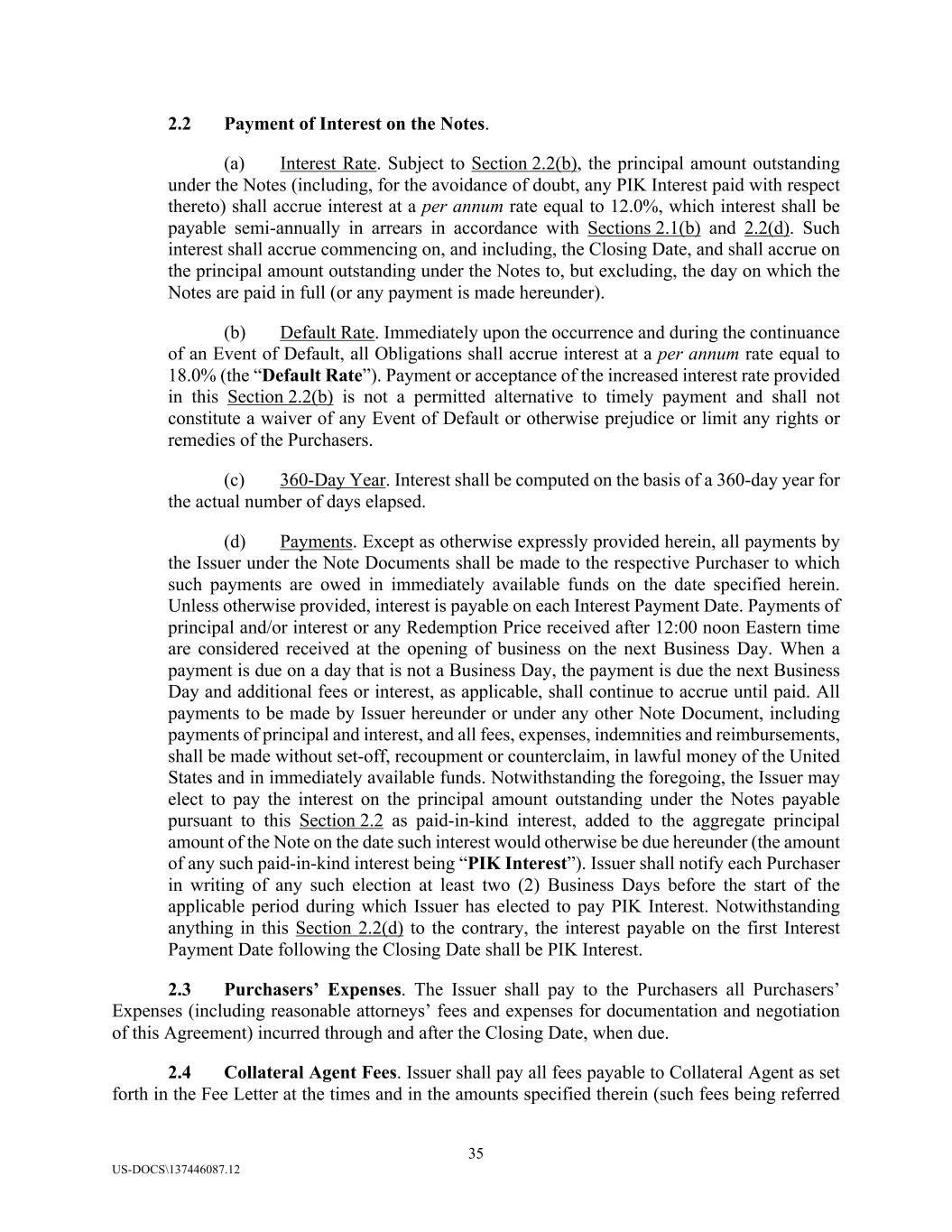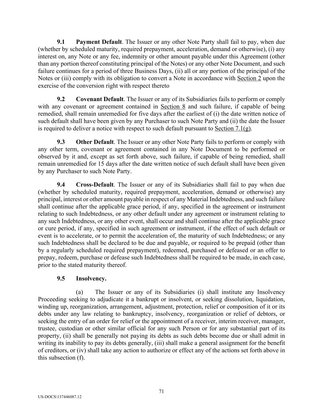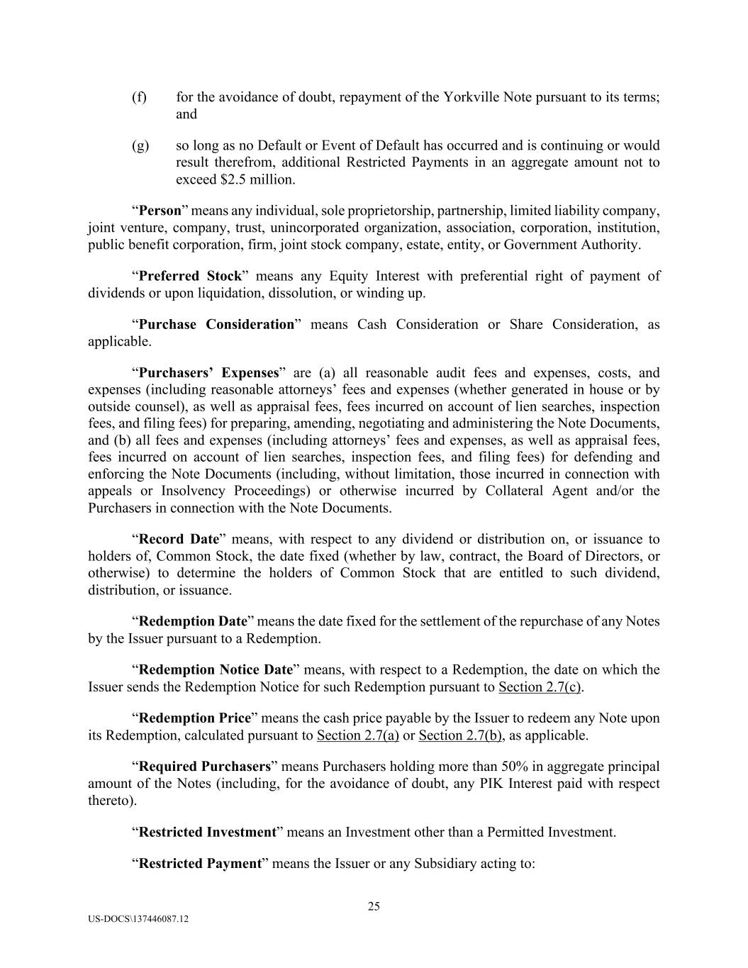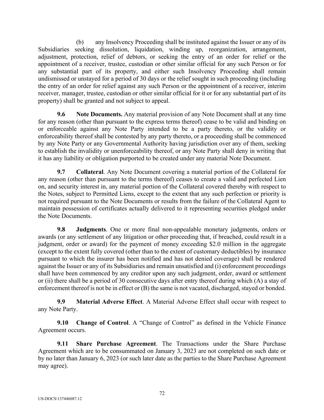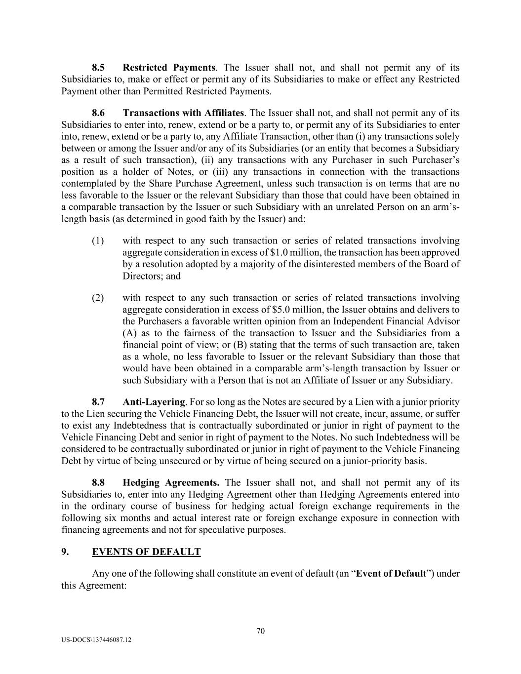 The Note Purchase Agreement contains covenants that limit the Company’s (and its subsidiaries’) ability to, among other things: (i) incur additional debt; (ii) pay dividends, redeem stock or make other distributions; (iii) make other restricted payments or investments; (iv) create liens on assets; (v) transfer or sell assets; (vi) engage in mergers or consolidations; (vii) engage in certain transactions with affiliates; (viii) incur indebtedness that is junior in priority to the Amended Loan Agreement and senior to the Note Purchase Agreement; and (ix) enter into certain hedging arrangements. Most of these restrictions are subject to certain minimum thresholds and exceptions. The Note Purchase Agreement also contains events of default (subject, in certain cases, to specified cure periods), after which the Notes be due and payable immediately at the applicable redemption price, including defaults related to payment compliance, covenant compliance, material adverse changes, bankruptcy and insolvency proceedings, cross-defaults to certain other agreements, judgments against the Company, change of control events and lien priority. Upon the occurrence and during the continuance of an event of default, interest will accrue at 18% per annum.