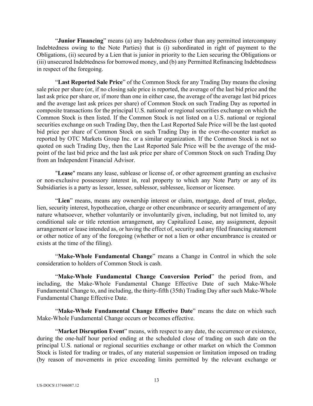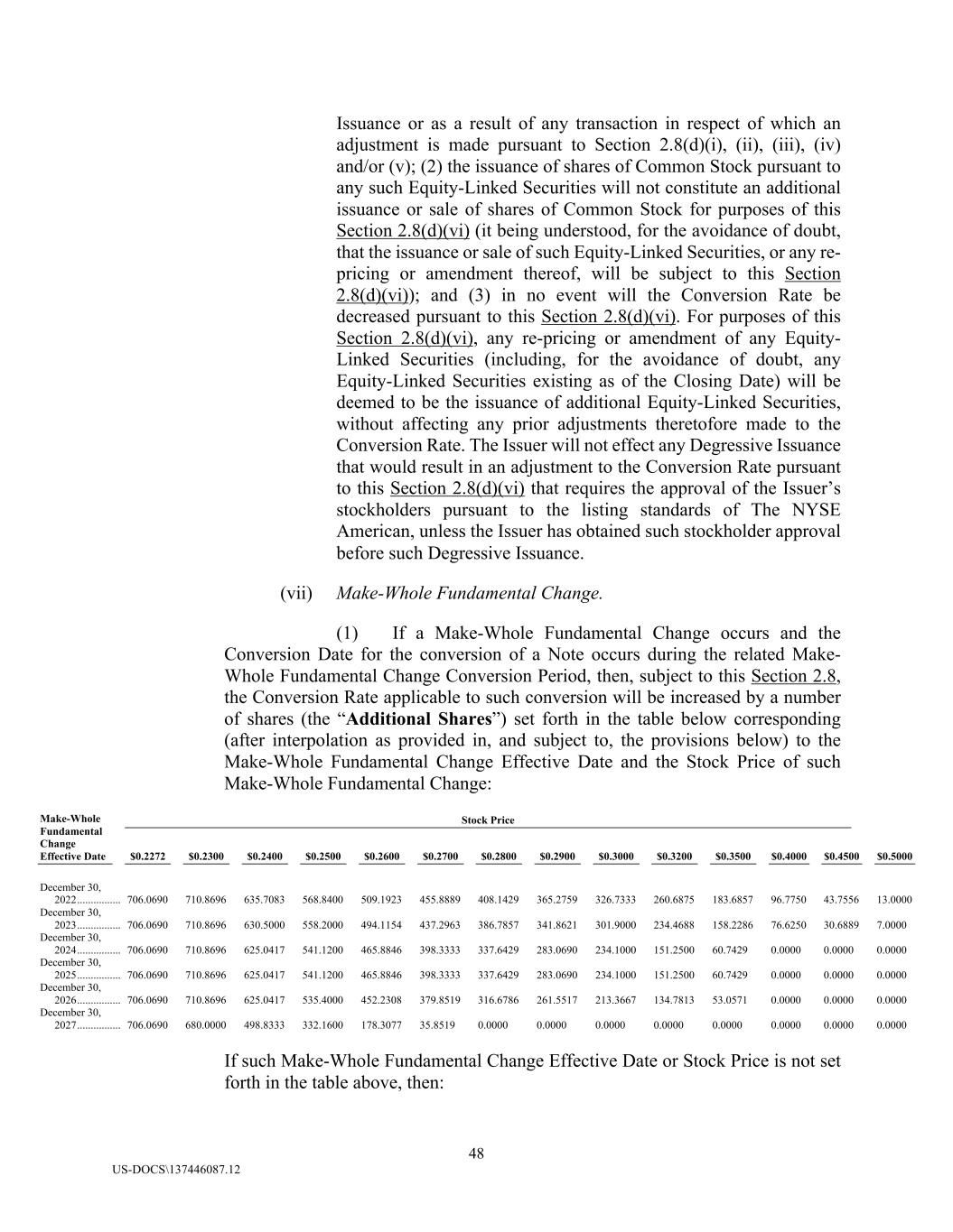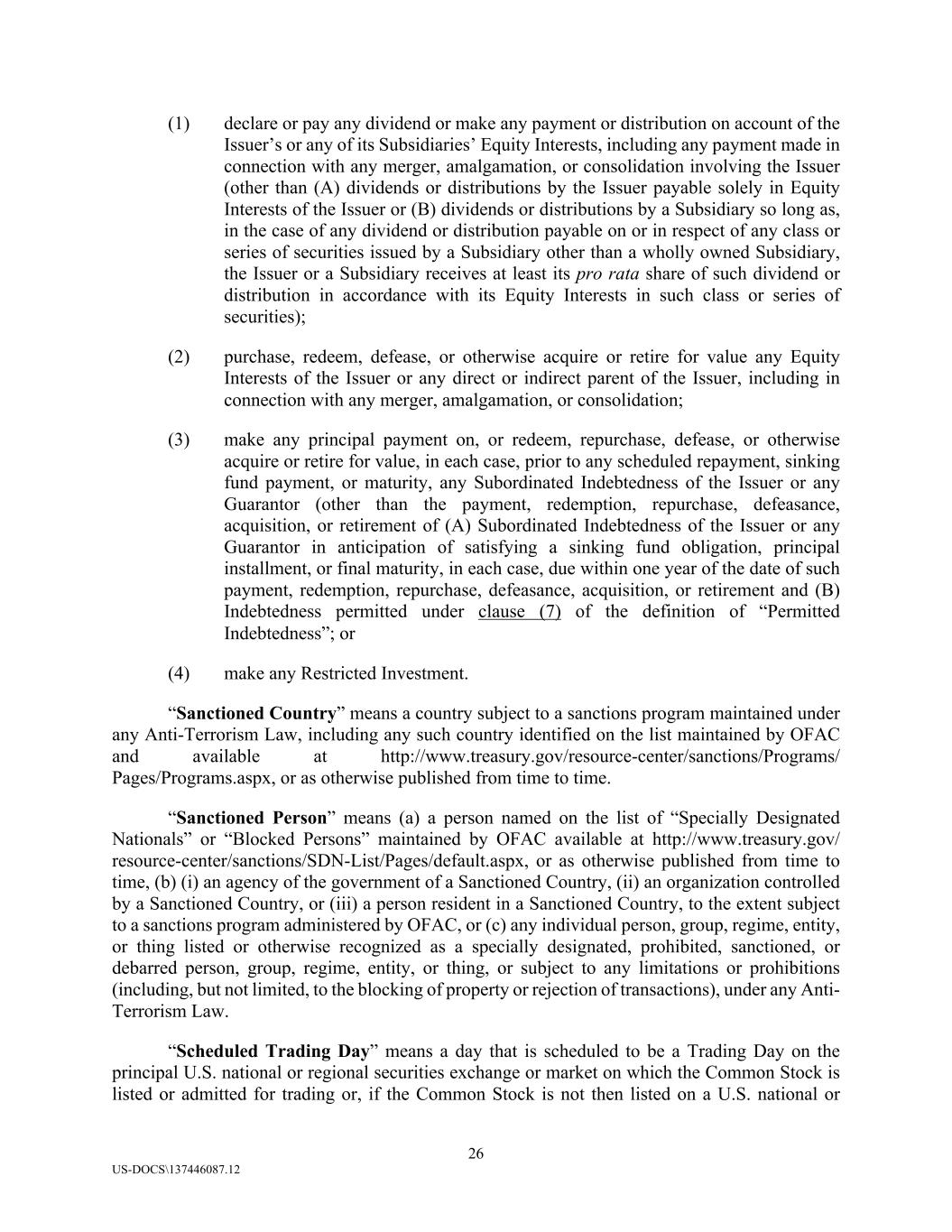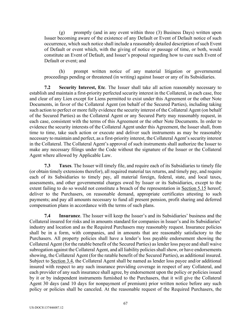 The Note Purchase Agreement contains covenants that limit the Company’s (and its subsidiaries’) ability to, among other things: (i) incur additional debt; (ii) pay dividends, redeem stock or make other distributions; (iii) make other restricted payments or investments; (iv) create liens on assets; (v) transfer or sell assets; (vi) engage in mergers or consolidations; (vii) engage in certain transactions with affiliates; (viii) incur indebtedness that is junior in priority to the Amended Loan Agreement and senior to the Note Purchase Agreement; and (ix) enter into certain hedging arrangements. Most of these restrictions are subject to certain minimum thresholds and exceptions. The Note Purchase Agreement also contains events of default (subject, in certain cases, to specified cure periods), after which the Notes be due and payable immediately at the applicable redemption price, including defaults related to payment compliance, covenant compliance, material adverse changes, bankruptcy and insolvency proceedings, cross-defaults to certain other agreements, judgments against the Company, change of control events and lien priority. Upon the occurrence and during the continuance of an event of default, interest will accrue at 18% per annum.