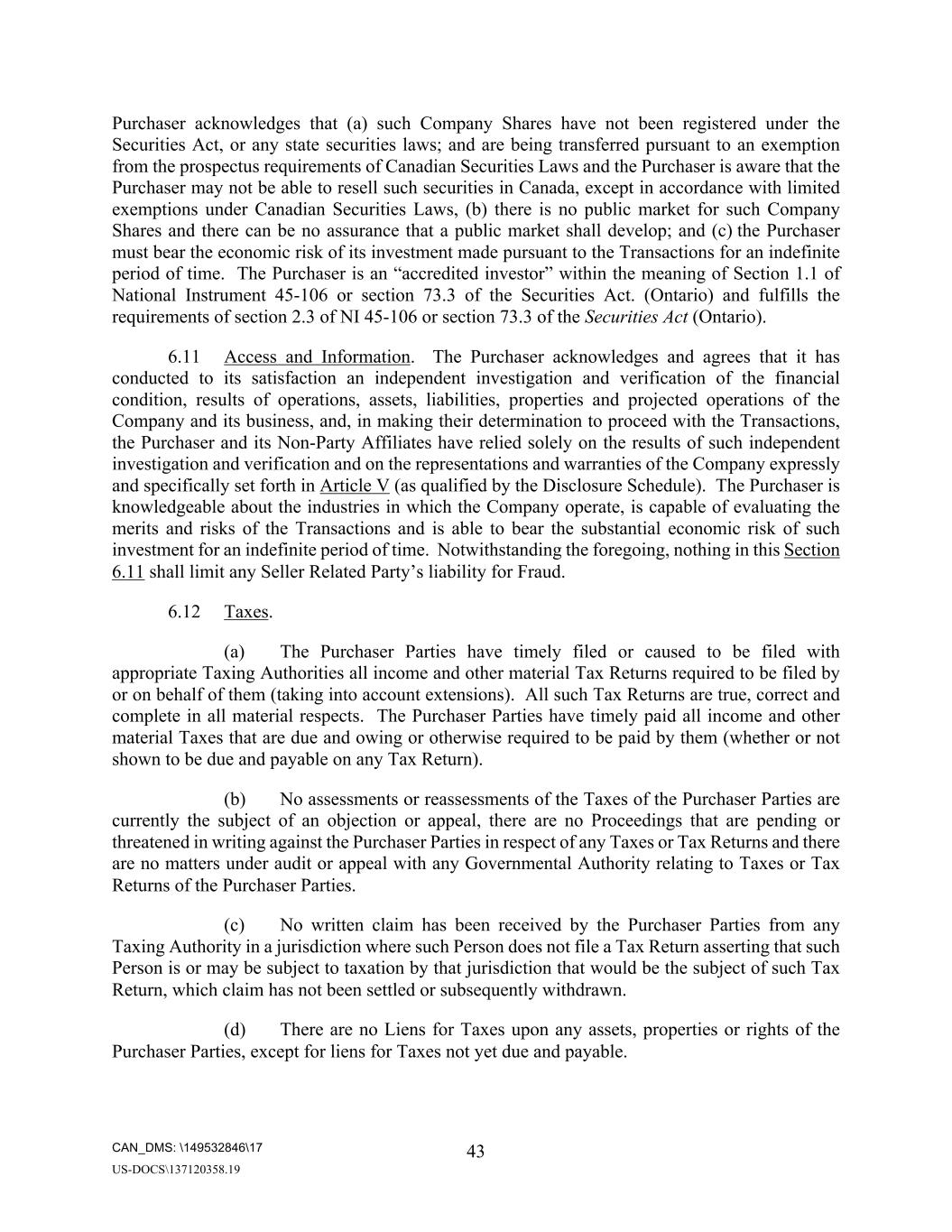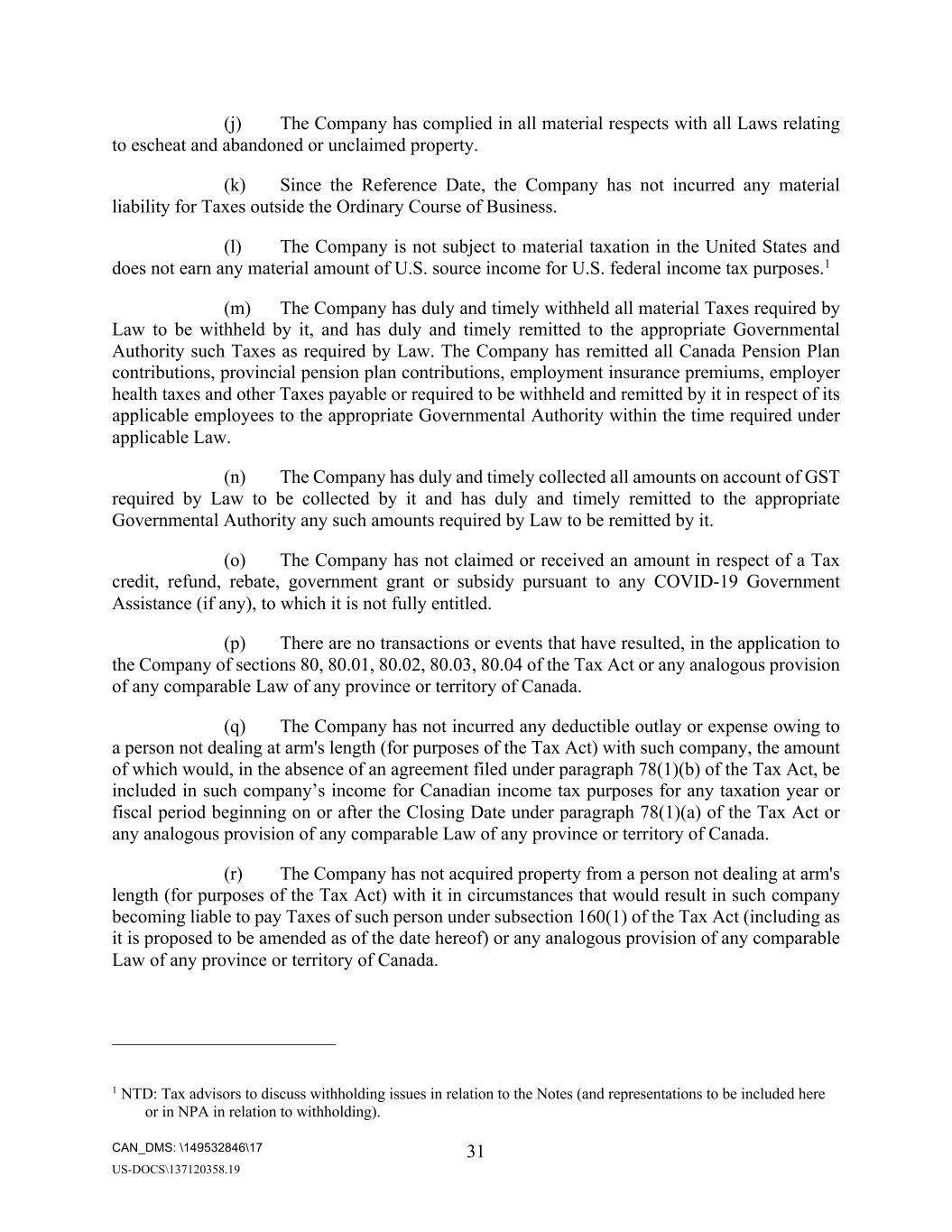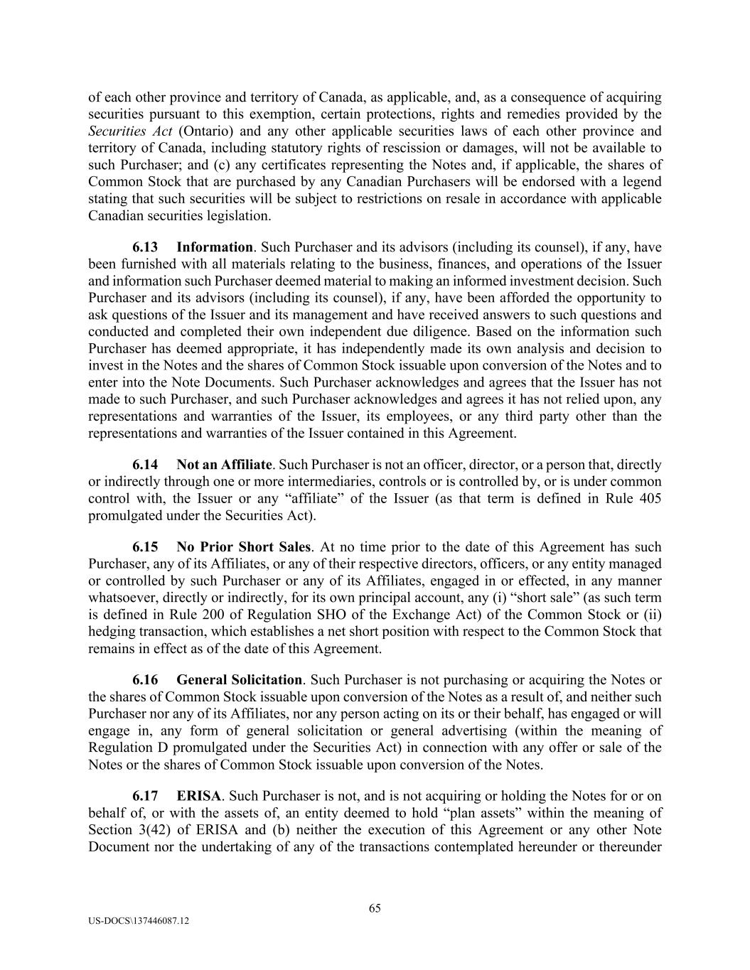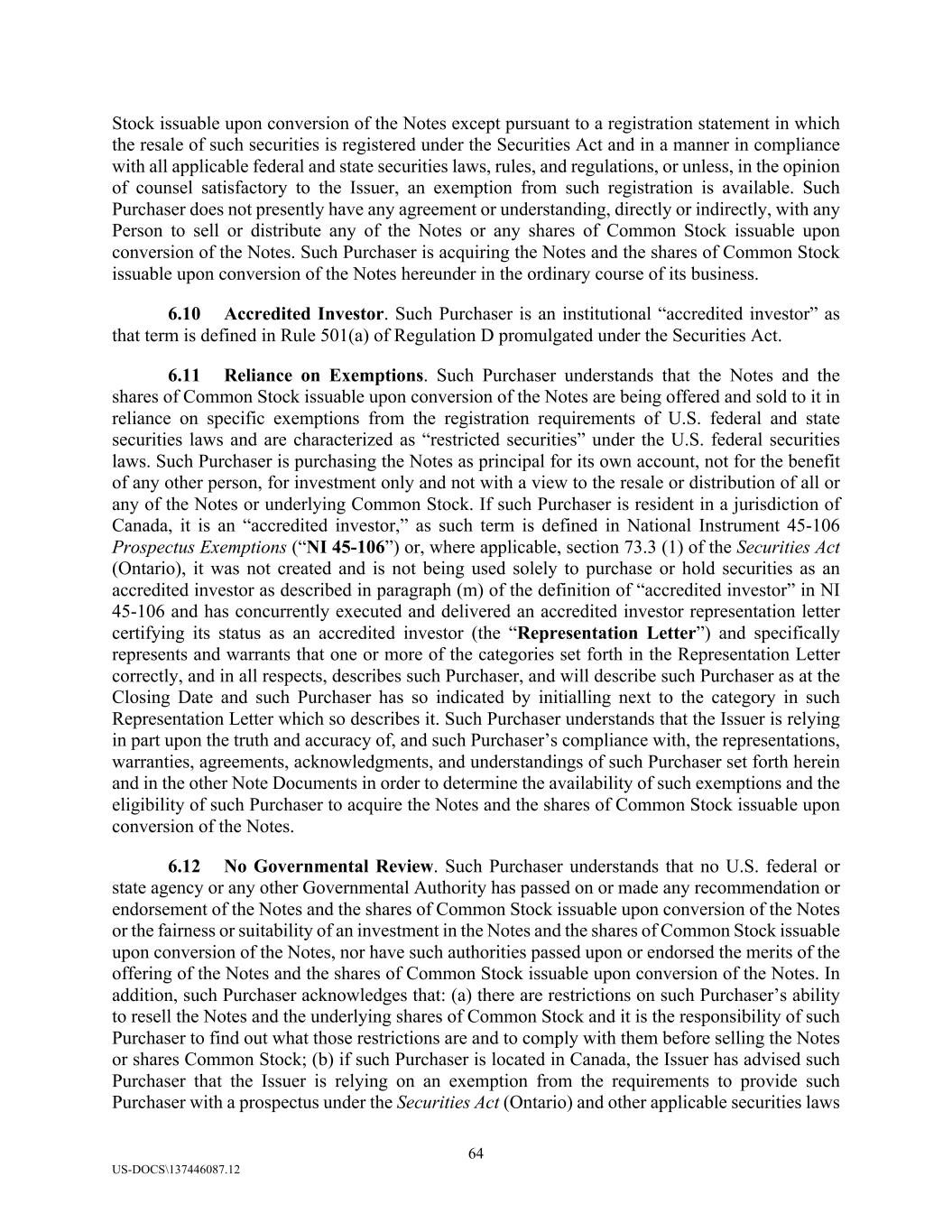 None of the Securities or the Preferred Share have been or will be registered under the Securities Act or may be offered or sold in the United States absent registration or an applicable exemption from registration requirements. The Company does not intend to file a shelf registration statement for the resale of the Securities or the Preferred Share. This filing does not constitute an offer to sell or the solicitation of an offer to buy any securities.