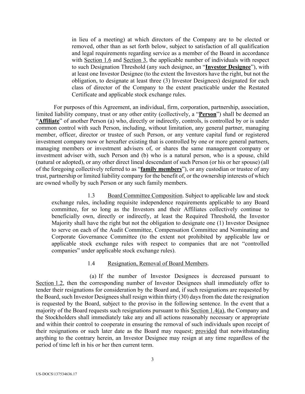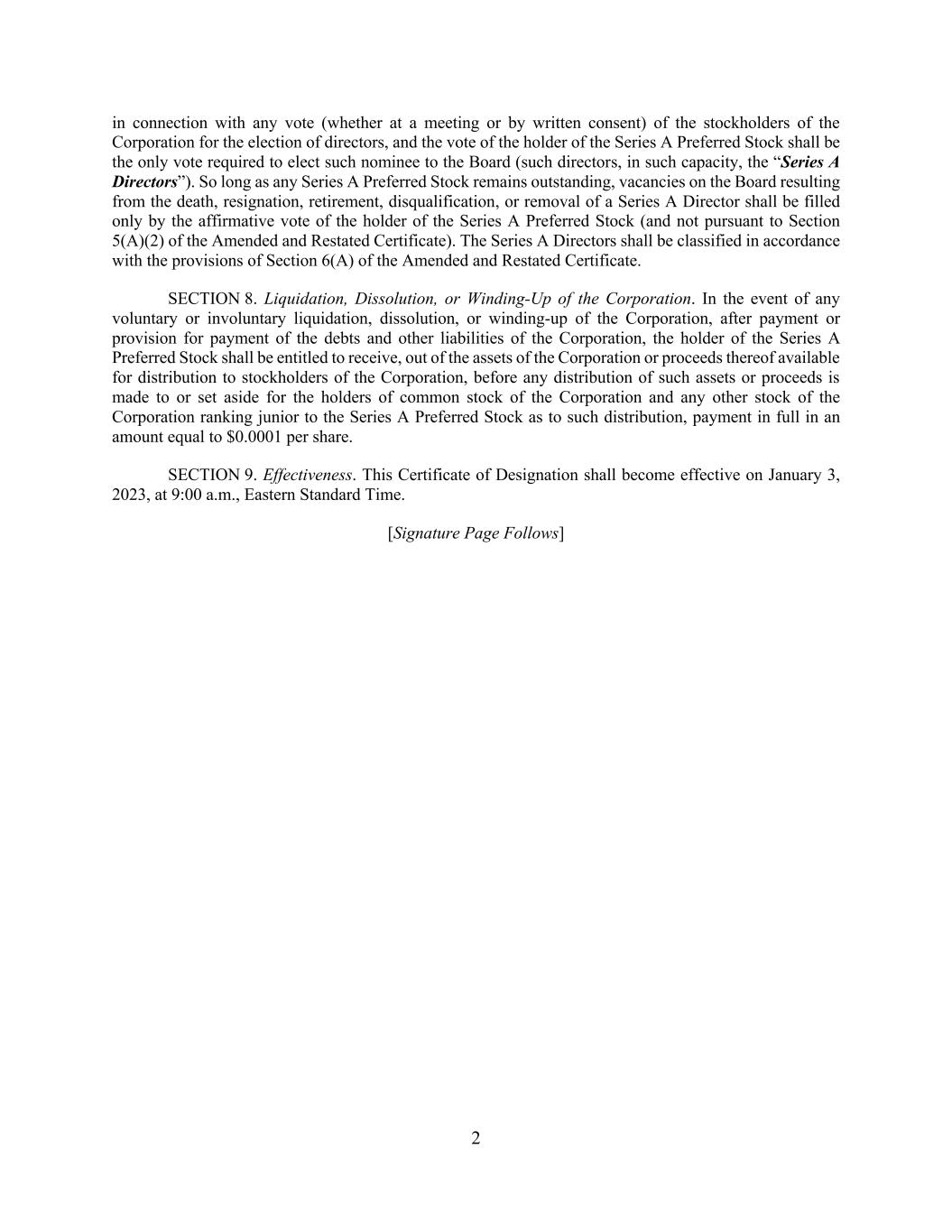 So long as the Preferred Share remains outstanding, the Preferred Holder will be entitled to nominate five directors for election to the Board in connection with any vote (whether at a meeting or by written consent) of the stockholders of the Company for the election of directors, and the vote of the Preferred Holder will be the only vote required to elect such nominee to the Board (such directors, in such capacity, the “Series A Directors”). So long as the Preferred Share remains outstanding, vacancies on the Board resulting from the death, resignation, retirement, disqualification or removal of a Series A Director will be filled only by the affirmative vote of the Preferred Holder (and not pursuant to Section 5(A)(2) of the Company’s certificate of incorporation).