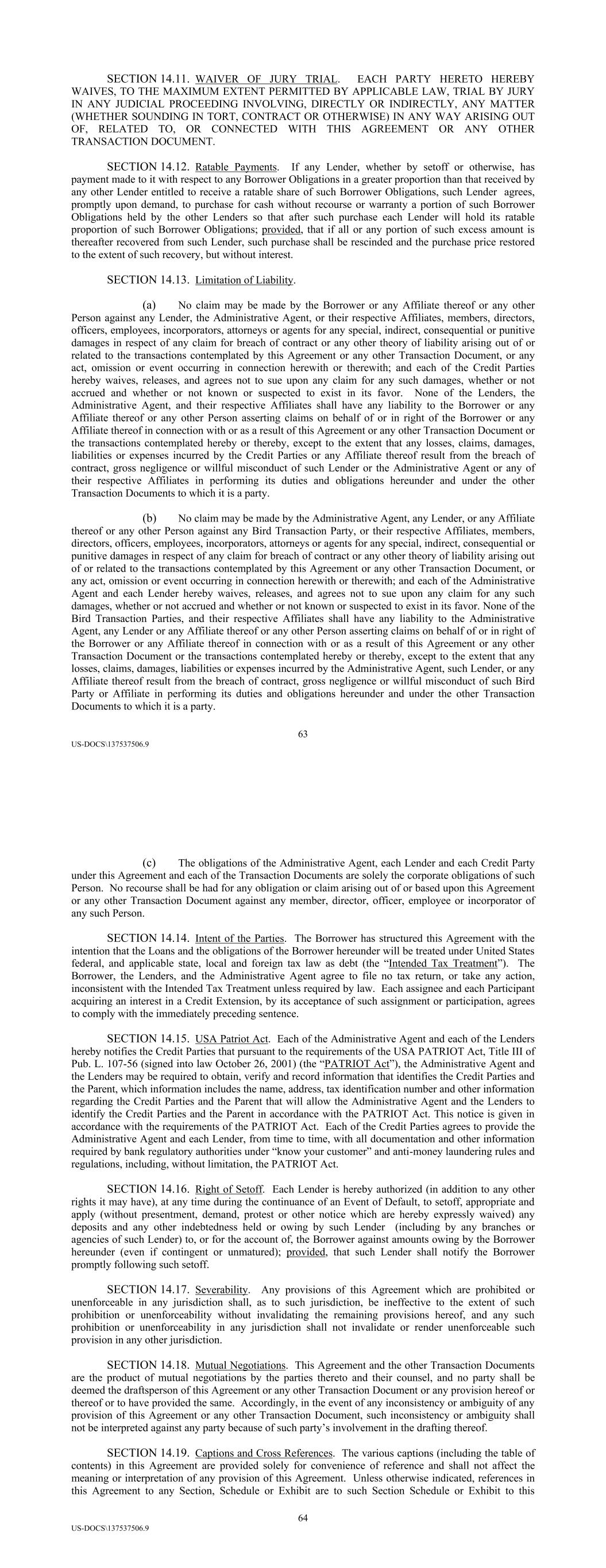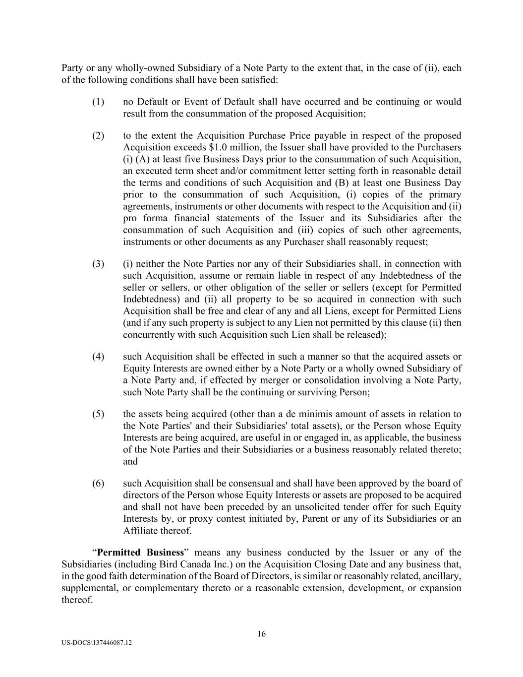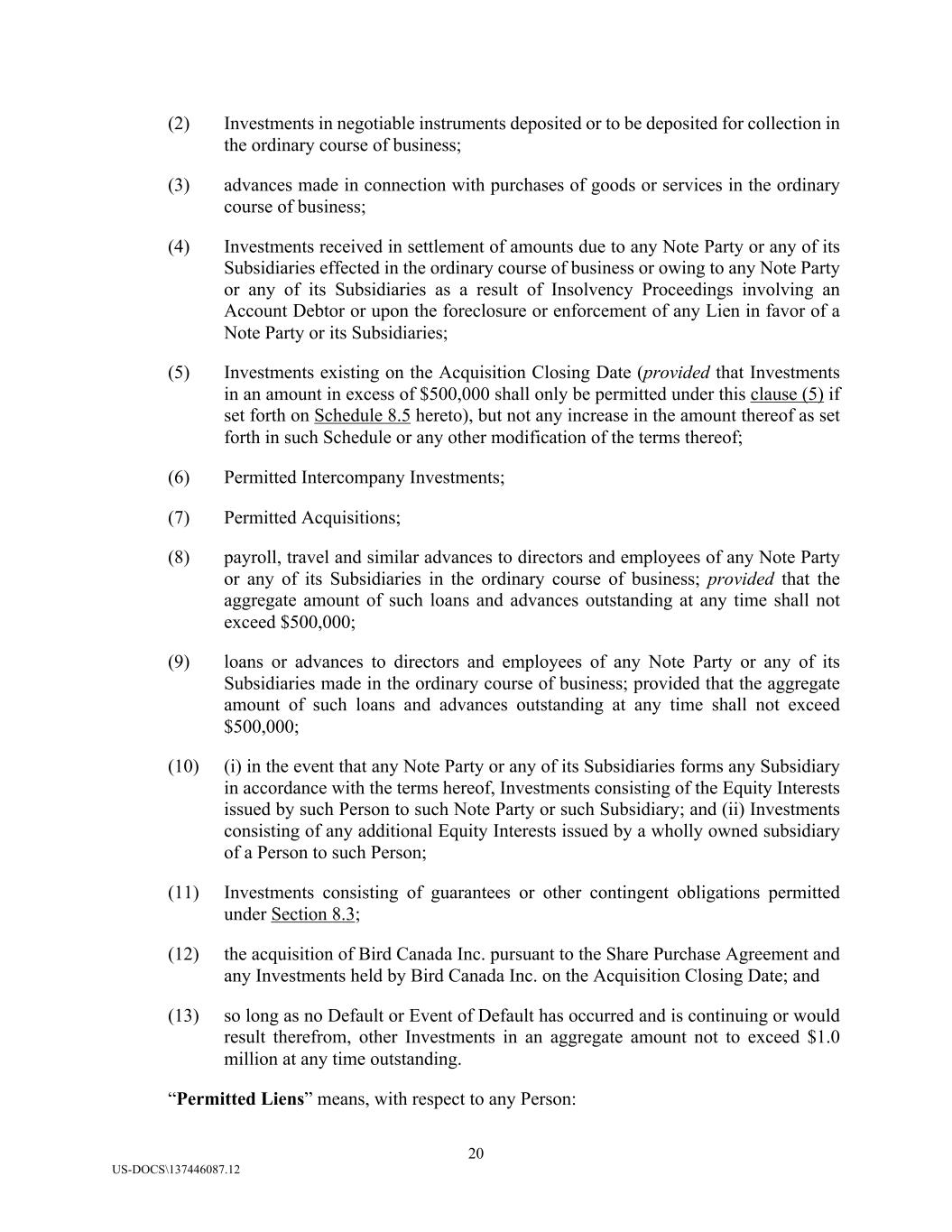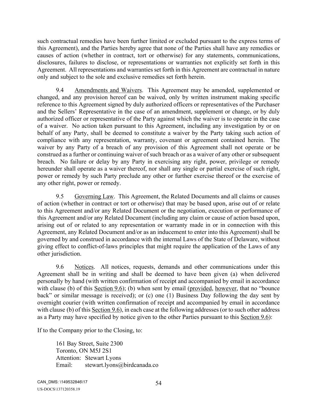 The foregoing description of the Share Purchase Agreement is not complete and is qualified in its entirety by reference to the full text of the Share Purchase Agreement, a copy of which is filed as Exhibit 2.1 to this Current Report and is incorporated by reference herein. The Share Purchase Agreement is included to provide security holders with information regarding its terms. It is not intended to provide any other factual information about the Company, the Purchaser, Bird Canada or the BC Sellers. In particular, the assertions embodied in representations and warranties by the Company, the Purchaser, Bird Canada or the BC Sellers contained in the Share Purchase Agreement are subject to important qualifications and limitations agreed to by the parties in connection with negotiating such agreement, including being qualified by confidential information in the disclosure schedules provided by the parties in connection with the execution of the Share Purchase Agreement, and are subject to standards of materiality applicable to the contractive parties that may differ from those applicable to security holders. The confidential disclosures contain information that modifies, qualifies and creates exceptions to the representations and warranties set forth in the Share Purchase Agreement. Moreover, certain representations and warranties in the Share Purchase Agreement were used for the purpose of allocating risk between the parties, rather than establishing matters as facts. Accordingly, security holders should not rely on the representations and warranties in the Share Purchase Agreement as characterizations of the actual state of facts about the Company, the Purchaser, Bird Canada or the BC Sellers. Moreover, information concerning the subject matter of the representations and warranties may change after the date of the Share Purchase Agreement, which subsequent information may or may not be fully reflected in the Company’s public disclosures.