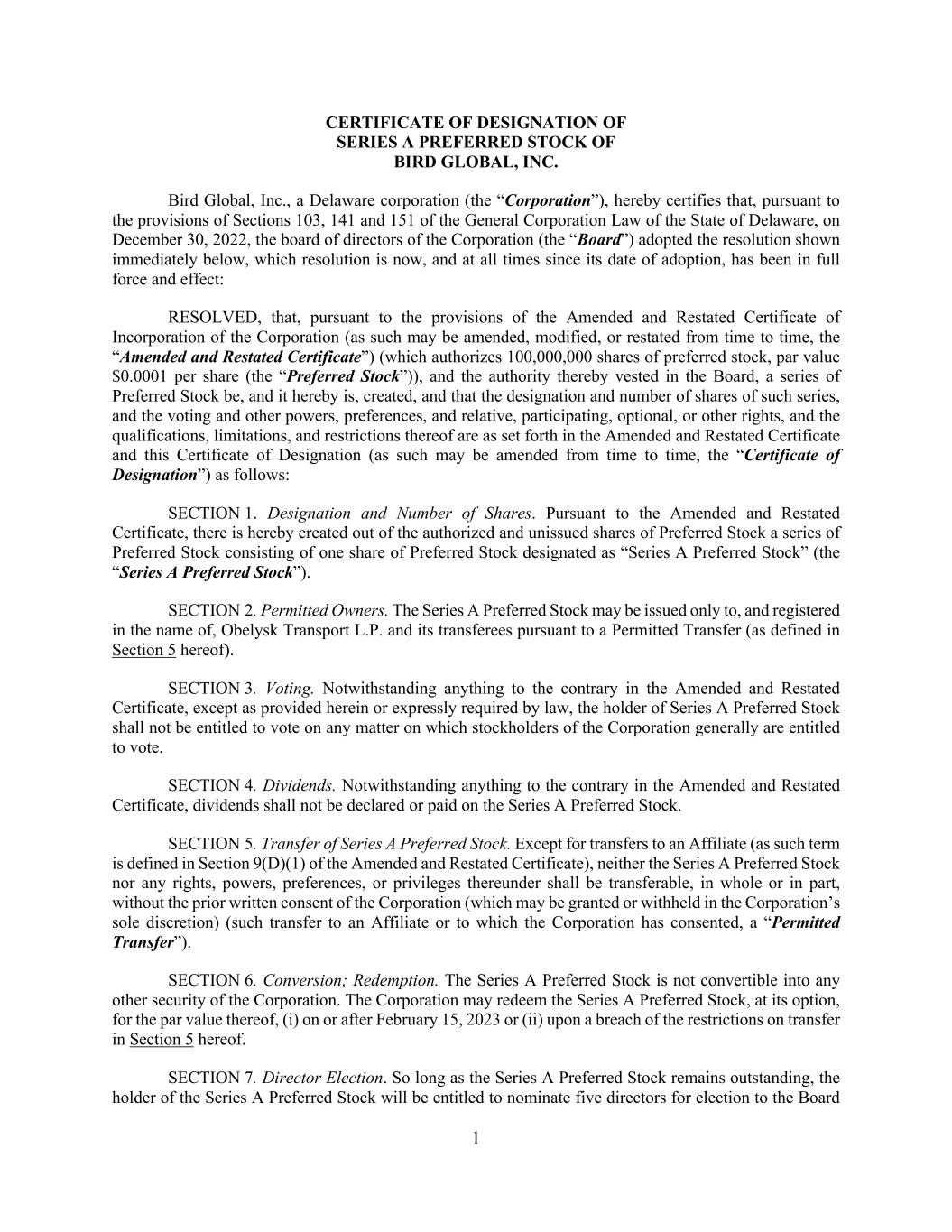 On the Closing Date, the Company filed a certificate of designation (the “Certificate of Designation”) with the Secretary of State of the State of Delaware establishing the rights, preferences, privileges, qualifications, restrictions and limitations of a series of its preferred stock designated as the Series A Preferred Stock, par value $0.0001 per share (the “Series A Preferred Stock”), with a liquidation preference of $0.0001 per share. On the Acquisition Closing Date, the Company issued one share (the “Preferred Share”) of Series A Preferred Stock to Obelysk Transport L.P., a shareholder of Bird Canada prior to the Acquisition, as a representative of the Investors (including its permitted transferees, the “Preferred Holder”). The Certificate of Designation became effective on the Acquisition Closing Date.
