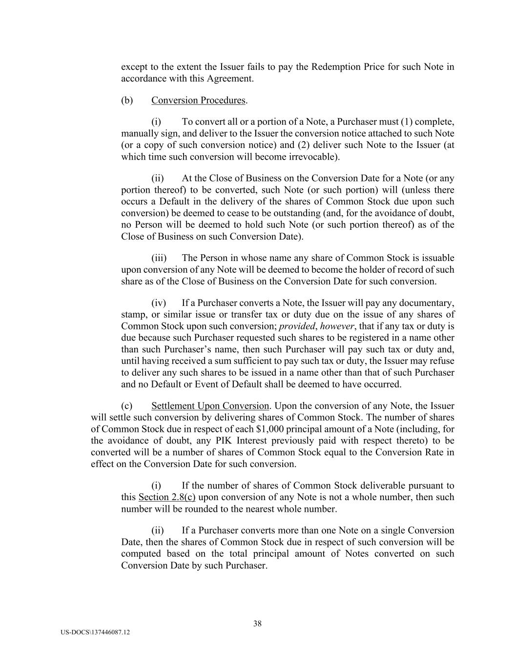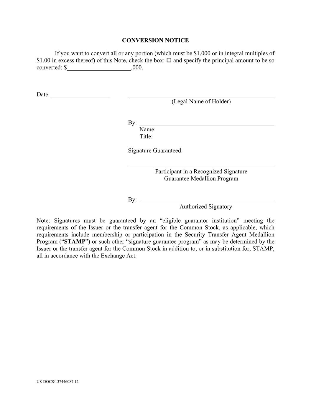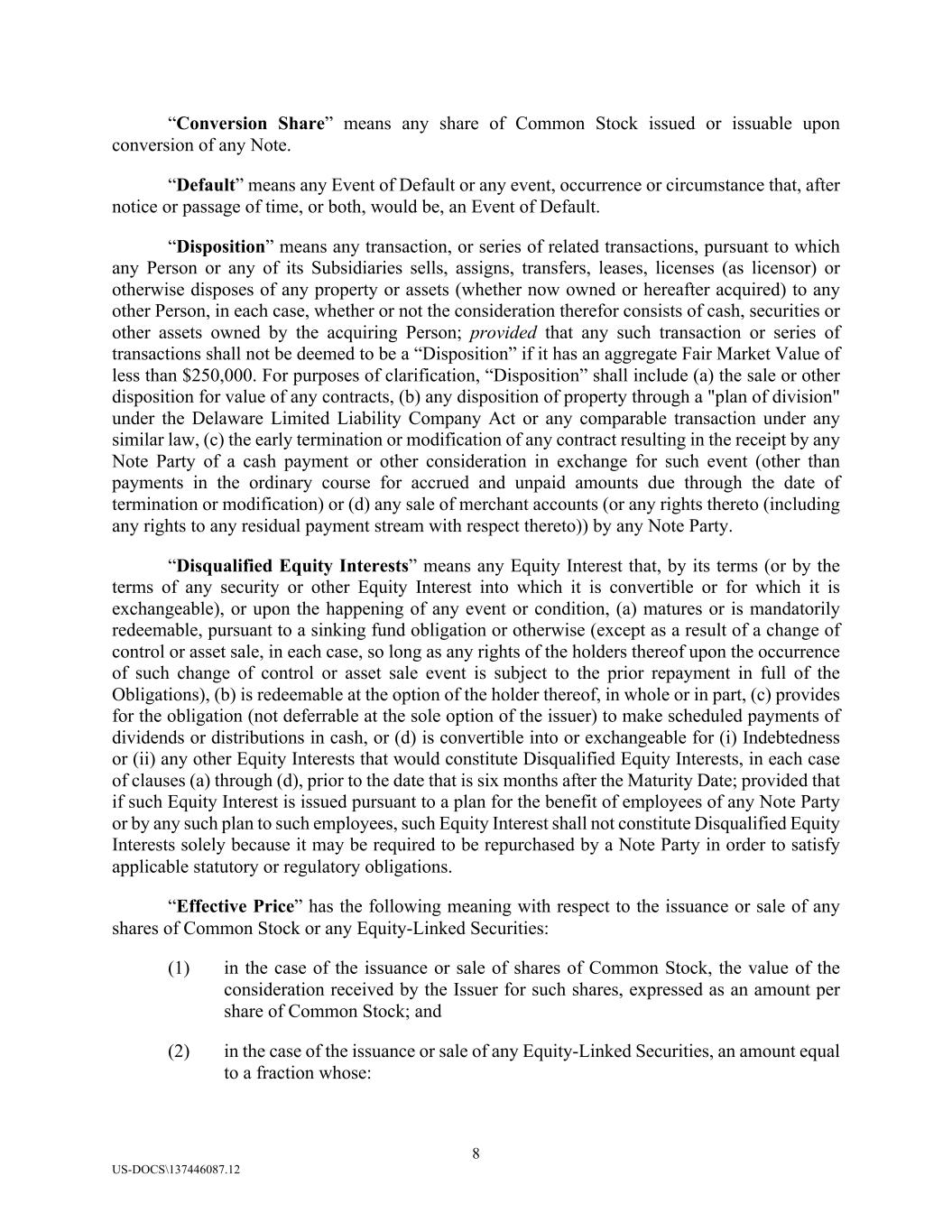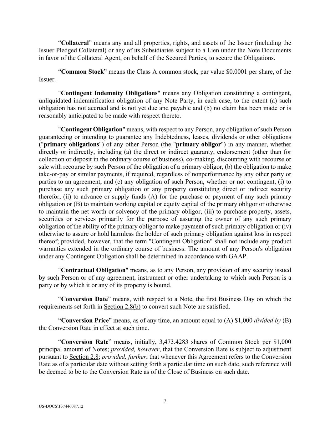 The Note Purchasers are entitled to convert the Notes into shares of the Company’s Class A common stock, par value $0.0001 per share (the “Class A Common Stock”), at any time at a conversion rate of 3,473.4283 shares of Class A Common Stock per $1,000 principal amount of the Notes, equivalent to a conversion price of approximately $0.2879 per share, subject to specified anti-dilution adjustments, including adjustments for the Company’s issuance of Class A Common Stock below the conversion price. In addition, following certain corporate events that occur prior to the maturity date, the Company will, in certain circumstances, increase the conversion rate for a holder who elects to convert its Notes in connection with such corporate event up to a maximum of 710.8696 shares per $1,000 principal amount of Notes. In certain circumstances, conversion will be limited unless the Company obtains stockholder approval to issue such shares.