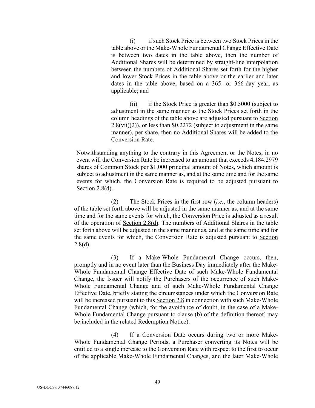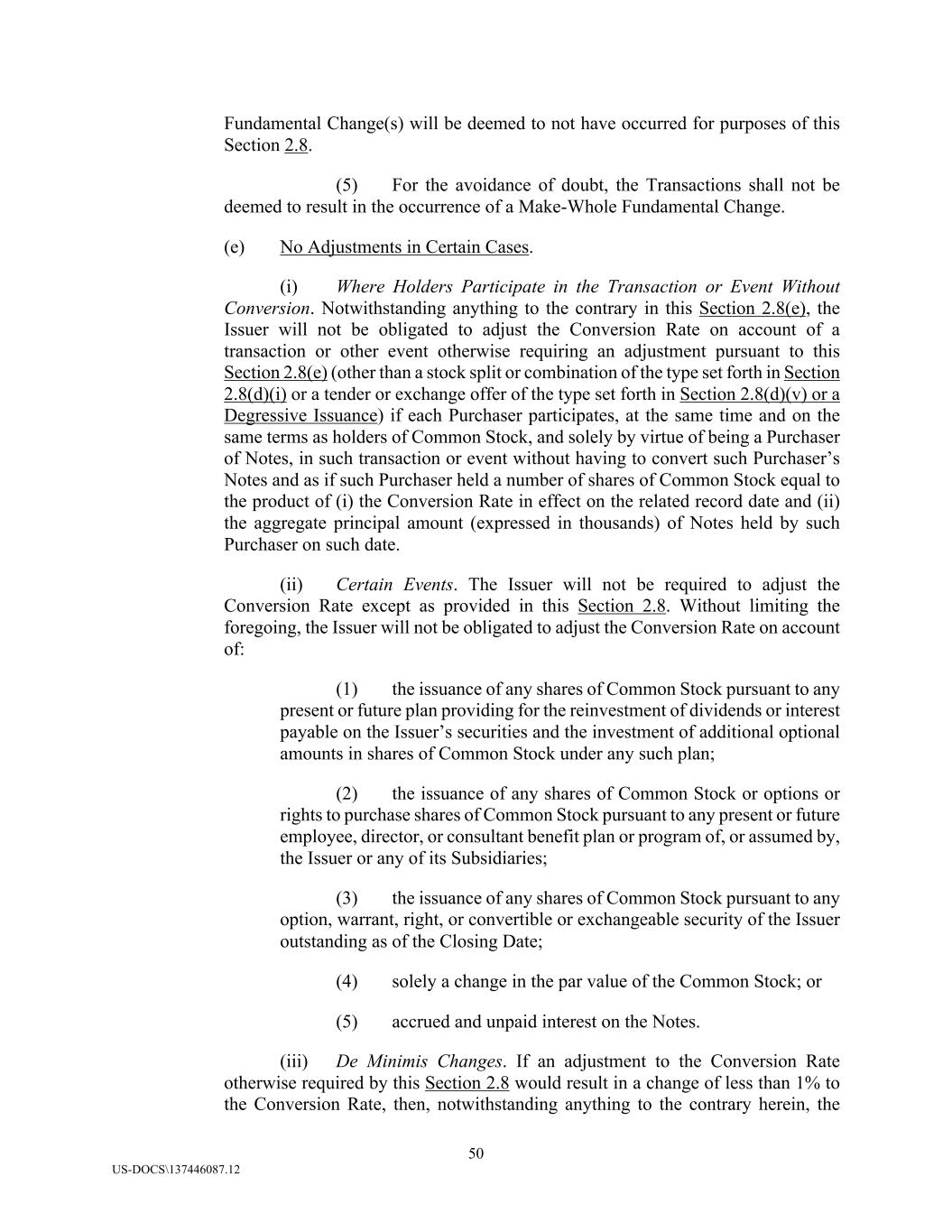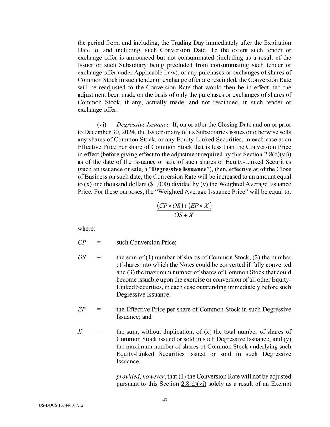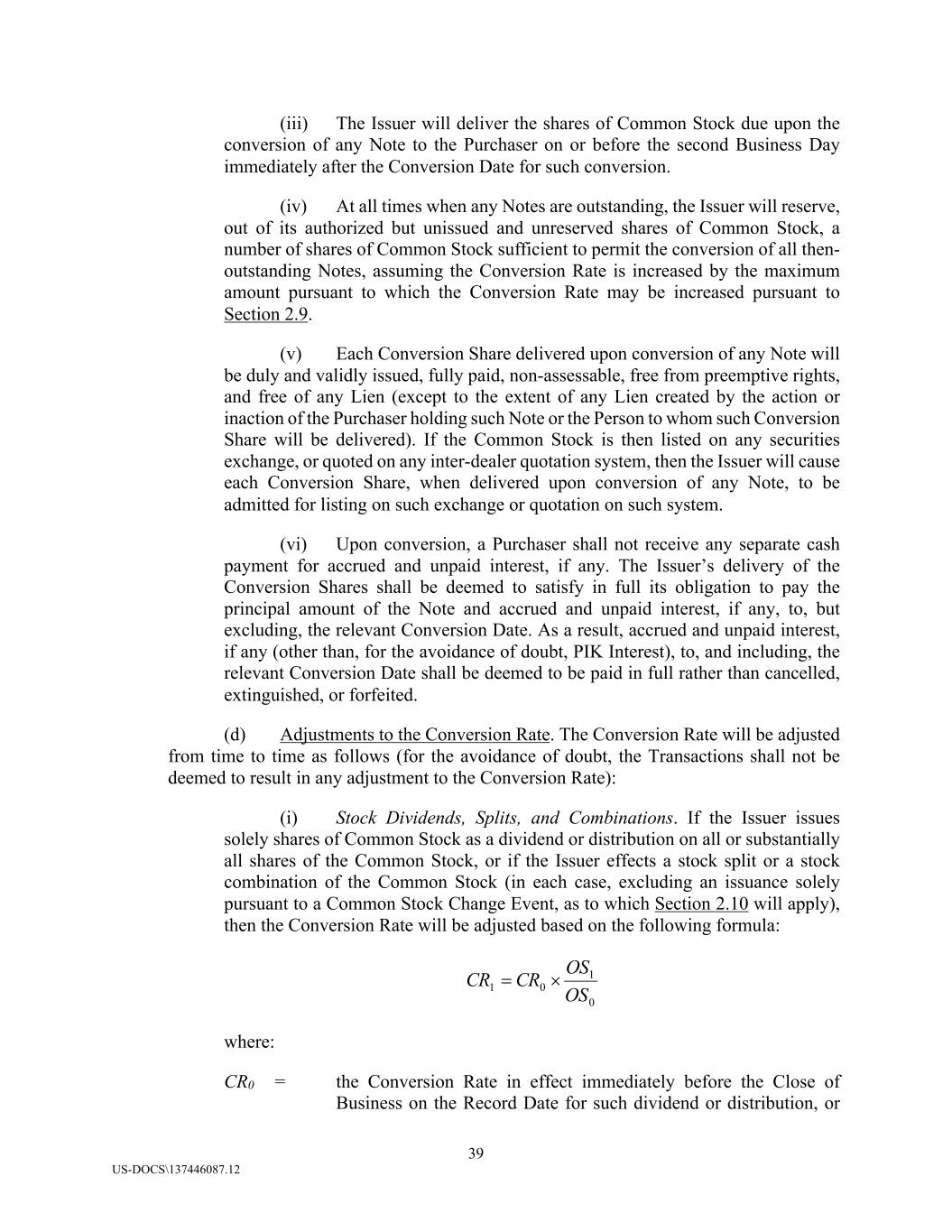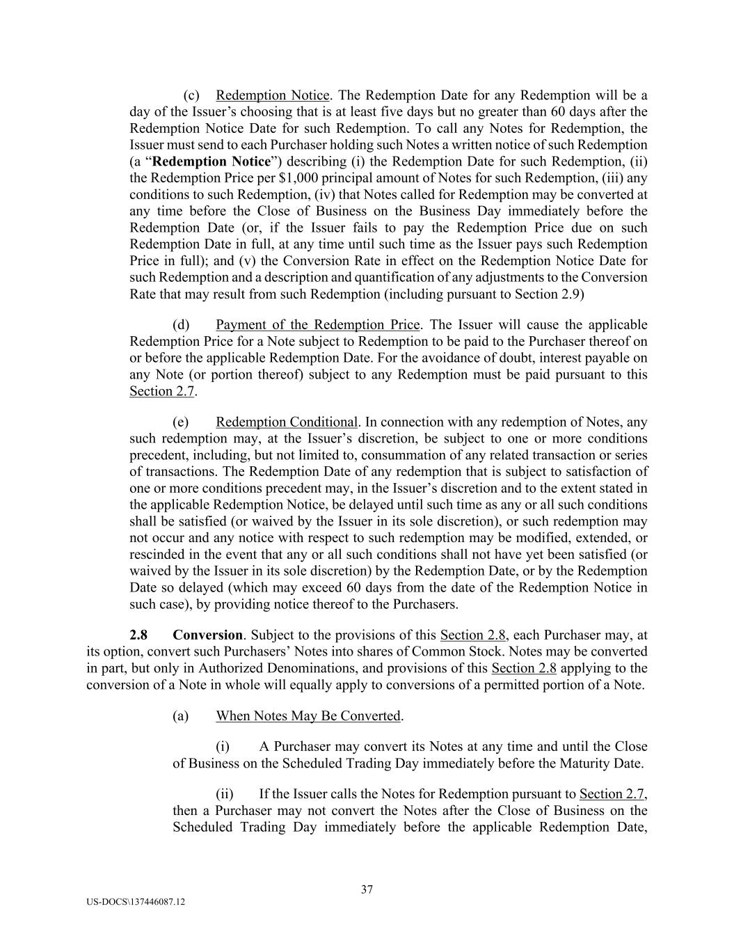 The Note Purchasers are entitled to convert the Notes into shares of the Company’s Class A common stock, par value $0.0001 per share (the “Class A Common Stock”), at any time at a conversion rate of 3,473.4283 shares of Class A Common Stock per $1,000 principal amount of the Notes, equivalent to a conversion price of approximately $0.2879 per share, subject to specified anti-dilution adjustments, including adjustments for the Company’s issuance of Class A Common Stock below the conversion price. In addition, following certain corporate events that occur prior to the maturity date, the Company will, in certain circumstances, increase the conversion rate for a holder who elects to convert its Notes in connection with such corporate event up to a maximum of 710.8696 shares per $1,000 principal amount of Notes. In certain circumstances, conversion will be limited unless the Company obtains stockholder approval to issue such shares.