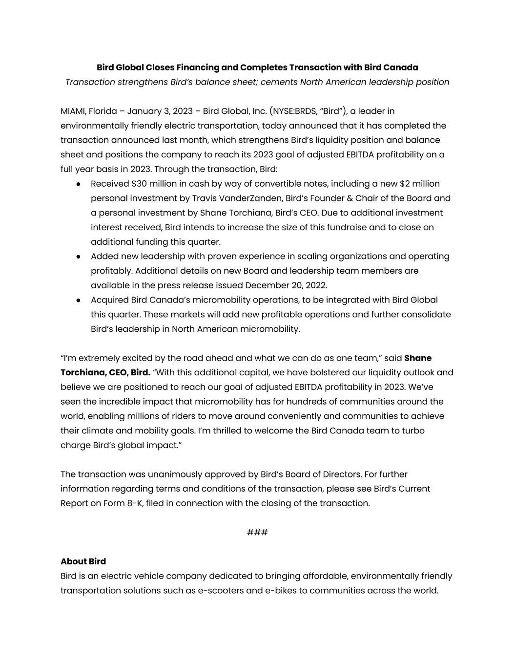 On December 30, 2022 (the “Closing Date”) and effective as of January 3, 2023 (the “Acquisition Closing Date”), Bird Global, Inc. (the “Company”) entered into a share purchase agreement (the “Share Purchase Agreement”) with 1393631 B.C. Unlimited Liability Company, a British Columbia ULC and indirect wholly owned subsidiary of the Company (the “Purchaser”), Bird Canada Inc. (“Bird Canada”), certain sellers party thereto (the “BC Sellers”) and John Bitove, as seller’s representative. Pursuant to the Share Purchase Agreement, among other things, the Purchaser acquired from the BC Sellers 100% of the issued and outstanding shares of Bird Canada in exchange for the issuance by the Company to the BC Sellers of an aggregate principal amount of $26,977,675 of its 12.0% Convertible Senior Secured Notes due 2027 (the “Notes”), 18,204,365 shares of the Company’s Class A common stock, par value $0.0001 per share (the “Class A Common Stock”), and a nominal amount of cash consideration (the “Acquisition”).