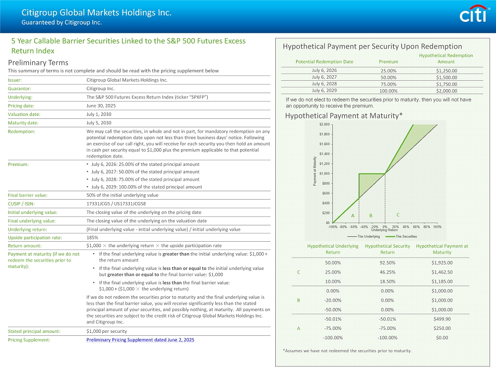Preliminary Terms This summary of terms is not complete and should be read with the pricing supplement below Citigroup Global Markets Holdings Inc. Issuer: Citigroup Inc. Guarantor: The S&P 500 Futures Excess Return Index (ticker “ SPXFP ”) Underlying: June 30, 2025 Pricing date: July 1, 2030 Valuation date: July 5, 2030 Maturity date: We may call the securities, in whole and not in part, for mandatory redemption on any potential redemption date upon not less than three business days’ notice. Following an exercise of our call right, you will receive for each security you then hold an amount in cash per security equal to $1,000 plus the premium applicable to that potential redemption date. Redemption: • July 6, 2026 : 25.00% of the stated principal amount • July 6, 2027 : 50.00% of the stated principal amount • July 6, 2028 : 75.00% of the stated principal amount • July 6, 2029 : 100.00% of the stated principal amount Premium: 50% of the initial underlying value Final barrier value: 17331JCG5 / US17331JCG58 CUSIP / ISIN: The closing value of the underlying on the pricing date Initial underlying value: T he closing value of the underlying on the valuation date Final underlying value: (Final underlying value - initial underlying value) / initial underlying value Underlying return: 185% Upside participation rate: $1,000 × the underlying return × the upside participation rate Return amount: • If the final underlying value is greater than the initial underlying value: $1,000 + the return amount • If the final underlying value is less than or equal to the initial underlying value but greater than or equal to the final barrier value: $1,000 • If the final underlying value is less than the final barrier value: $1,000 + ($1,000 × the underlying return) If we do not redeem the securities prior to maturity and the final underlying value is less than the final barrier value, you will receive significantly less than the stated principal amount of your securities, and possibly nothing, at maturity. All payments on the securities are subject to the credit risk of Citigroup Global Markets Holdings Inc. and Citigroup Inc. Payment at maturity (if we do not redeem the securities prior to maturity): $1,000 per security Stated principal amount: Preliminary Pricing Supplement dated June 2, 2025 Pricing Supplement: Citigroup Global Markets Holdings Inc. Guaranteed by Citigroup Inc. 5 Year Callable Barrier Securities Linked to the S&P 500 Futures Excess Return Index Hypothetical Payment at Maturity* Hypothetical Payment at Maturity Hypothetical Security Return Hypothetical Underlying Return $1,925.00 92.50% 50.00% C $1,462.50 46.25% 25.00% $1,185.00 18.50% 10.00% $1,000.00 0.00% 0.00% B $1,000.00 0.00% - 20.00% $1,000.00 0.00% - 50.00% $499.90 - 50.01% - 50.01% A $250.00 - 75.00% - 75.00% $0.00 - 100.00% - 100.00% Hypothetical Redemption Amount Premium Potential Redemption Date $1,250.00 25.00% July 6, 2026 $1,500.00 50.00% July 6, 2027 $1,750.00 75.00% July 6, 2028 $2,000.00 100.00% July 6, 2029 Hypothetical Payment per Security Upon Redemption If we do not elect to redeem the securities prior to maturity, then you will not have an opportunity to receive the premium. *Assumes we have not redeemed the securities prior to maturity.