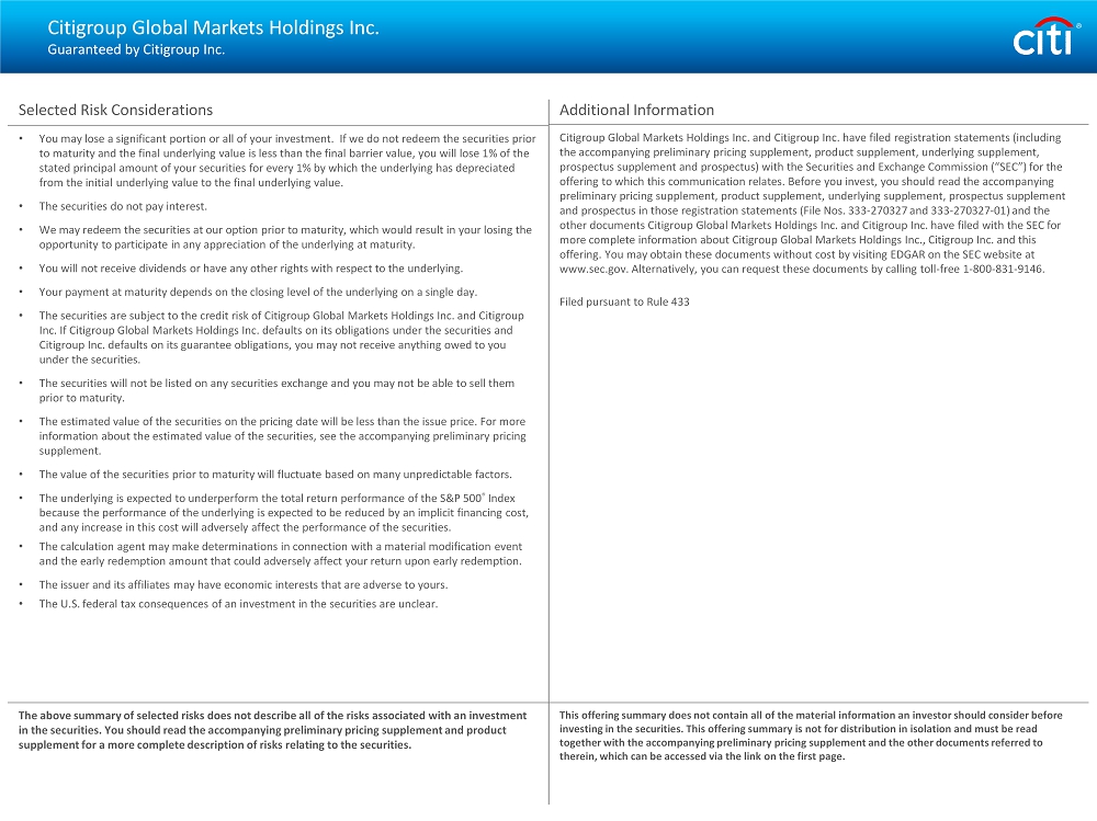 Citigroup Global Markets Holdings Inc. Guaranteed by Citigroup Inc. Selected Risk Considerations • You may lose a significant portion or all of your investment. If we do not redeem the securities prior to maturity and the final underlying value is less than the final barrier value, you will lose 1% of the stated principal amount of your securities for every 1% by which the underlying has depreciated from the initial underlying value to the final underlying value. • The securities do not pay interest. • We may redeem the securities at our option prior to maturity, which would result in your losing the opportunity to participate in any appreciation of the underlying at maturity. • You will not receive dividends or have any other rights with respect to the underlying. • Your payment at maturity depends on the closing level of the underlying on a single day. • The securities are subject to the credit risk of Citigroup Global Markets Holdings Inc. and Citigroup Inc. If Citigroup Global Markets Holdings Inc. defaults on its obligations under the securities and Citigroup Inc. defaults on its guarantee obligations, you may not receive anything owed to you under the securities. • The securities will not be listed on any securities exchange and you may not be able to sell them prior to maturity. • The estimated value of the securities on the pricing date will be less than the issue price. For more information about the estimated value of the securities, see the accompanying preliminary pricing supplement. • The value of the securities prior to maturity will fluctuate based on many unpredictable factors. • The underlying is expected to underperform the total return performance of the S&P 500 ® Index because the performance of the underlying is expected to be reduced by an implicit financing cost, and any increase in this cost will adversely affect the performance of the securities. • The calculation agent may make determinations in connection with a material modification event and the early redemption amount that could adversely affect your return upon early redemption. • The issuer and its affiliates may have economic interests that are adverse to yours. • The U.S. federal tax consequences of an investment in the securities are unclear. The above summary of selected risks does not describe all of the risks associated with an investment in the securities. You should read the accompanying preliminary pricing supplement and product supplement for a more complete description of risks relating to the securities. Additional Information Citigroup Global Markets Holdings Inc. and Citigroup Inc. have filed registration statements (including the accompanying preliminary pricing supplement, product supplement, underlying supplement, prospectus supplement and prospectus) with the Securities and Exchange Commission (“SEC”) for the offering to which this communication relates. Before you invest, you should read the accompanying preliminary pricing supplement, product supplement, underlying supplement, prospectus supplement and prospectus in those registration statements (File Nos. 333 - 270327 and 333 - 270327 - 01) and the other documents Citigroup Global Markets Holdings Inc. and Citigroup Inc. have filed with the SEC for more complete information about Citigroup Global Markets Holdings Inc., Citigroup Inc. and this offering. You may obtain these documents without cost by visiting EDGAR on the SEC website at www.sec.gov. Alternatively, you can request these documents by calling toll - free 1 - 800 - 831 - 9146. Filed pursuant to Rule 433 This offering summary does not contain all of the material information an investor should consider before investing in the securities. This offering summary is not for distribution in isolation and must be read together with the accompanying preliminary pricing supplement and the other documents referred to therein, which can be accessed via the link on the first page.