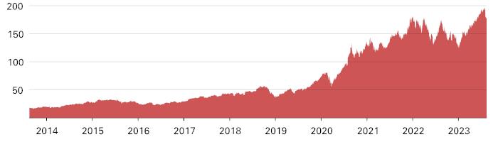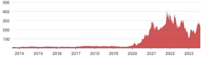 The following graph sets forth the historical performance of TSLA based on the daily historical closing values from August 15, 2013 through August 15, 2023. We obtained the closing values below from the Bloomberg Professional® service. We have not undertaken any independent review of, or made any due diligence inquiry with respect to, the information obtained from the Bloomberg Professional® service.![]() |