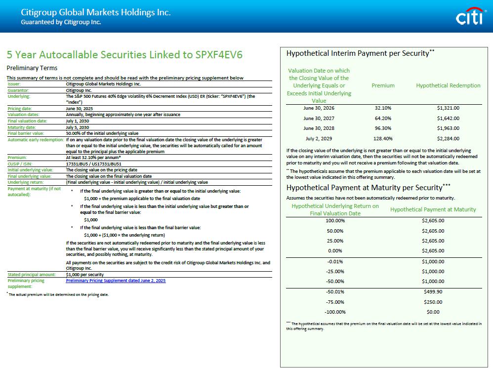 Citigroup Global Markets Holdings Inc. Guaranteed by Citigroup Inc. 5 Year Autocallable Securities Linked to SPXF4EV6 Preliminary Terms This summary of terms is not complete and should be read with the preliminary pricing supplement below Citigroup Global Markets Holdings Inc. Issuer: Citigroup Inc. Guarantor: The S&P 500 Futures 40% Edge Volatility 6% Decrement Index (USD) ER (ticker: “SPXF4EV6”) (the “Index”) Underlying: June 30, 2025 Pricing date: Annually, beginning approximately one year after issuance Valuation dates: July 1, 2030 Final valuation date: July 5, 2030 Maturity date: 50.00% of the initial underlying value Final barrier value: If on any valuation date prior to the final valuation date the closing value of the underlying is greater than or equal to the initial underlying value, the securities will be automatically called for an amount equal to the principal plus the applicable premium Automatic early redemption: At least 32.10% per annum* Premium: 17331JBU5 / US17331JBU51 CUSIP / ISIN: The closing value on the pricing date Initial underlying value: The closing value on the final valuation date Final underlying value: (Final underlying value - initial underlying value) / initial underlying value Underlying return: • If the final underlying value is greater than or equal to the initial underlying value: $1,000 + the premium applicable to the final valuation date • If the final underlying value is less than the initial underlying value but greater than or equal to the final barrier value: $1,000 • If the final underlying value is less than the final barrier value: $ 1 , 000 + ( $ 1 , 000 п the underlying return) If the securities are not automatically redeemed prior to maturity and the final underlying value is less than the final barrier value, you will receive significantly less than the stated principal amount of your securities, and possibly nothing, at maturity . All payments on the securities are subject to the credit risk of Citigroup Global Markets Holdings Inc . and Citigroup Inc . Payment at maturity (if not autocalled): $1,000 per security Stated principal amount: Preliminary Pricing Supplement dated June 2, 2025 Preliminary pricing supplement: * The actual premium will be determined on the pricing date. Hypothetical Interim Payment per Security ** Pr Valuation Date on which the Closing Value of the Underlying Equals or Exceeds Initial Underlying Value 32.10% June 30, 2026 64.20% June 30, 2027 96.30% June 30, 2028 128.4 July 2, 2029 If the closing value of the underlying is not greater than or equal to the initial underlying value on any interim valuation date, then the securities will not be automatically redeemed prior to maturity and you will not receive a premium following that valuation date. ** The hypotheticals assume that the premium applicable to each valuation date will be set at the lowest value indicated in this offering summary. Hypothetical Payment at Maturity per Security *** Assumes the securities have not been automatically redeemed prior to maturity. Hypothetical Payment Hypothetical Underlying Return on Final Valuation Date 100.00% 50.00% 25.00% 0.00% - 0.01% - 25.00% - 50.00% - 50.01% - 75.00% - 100.00% *** The hypothetical assumes that the premium on the final valuation date will be set at the lowest value indicated in this offering summary.