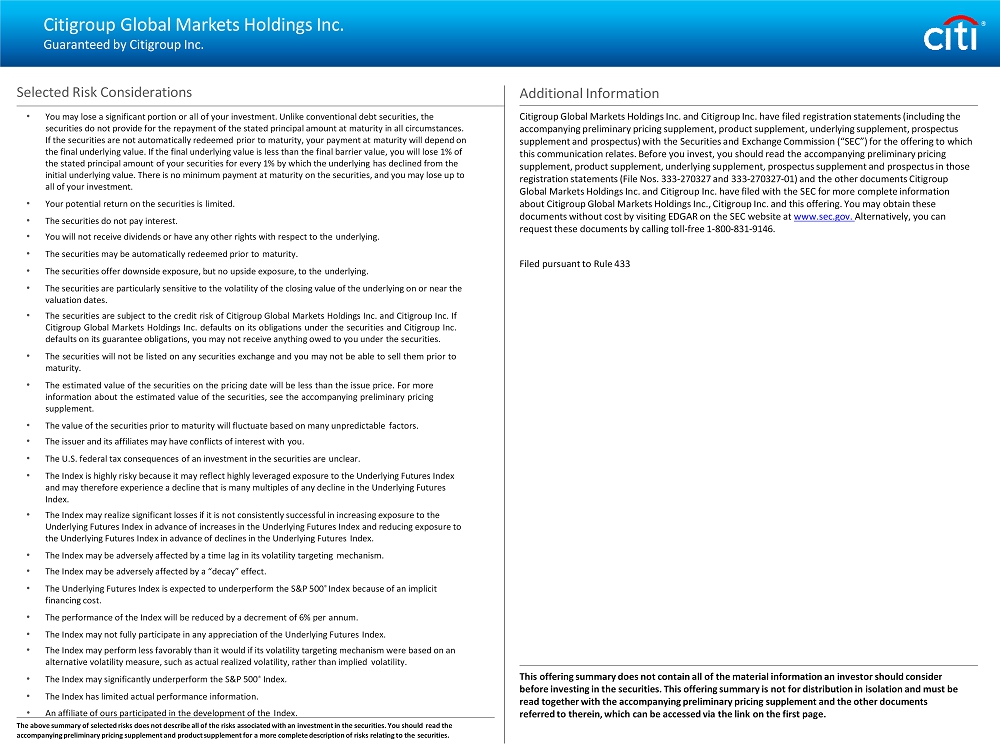 Citigroup Global Markets Holdings Inc. Guaranteed by Citigroup Inc. Selected Risk Considerations • You may lose a significant portion or all of your investment. Unlike conventional debt securities, the securities do not provide for the repayment of the stated principal amount at maturity in all circumstances. If the securities are not automatically redeemed prior to maturity, your payment at maturity will depend on the final underlying value. If the final underlying value is less than the final barrier value, you will lose 1% of the stated principal amount of your securities for every 1% by which the underlying has declined from the initial underlying value. There is no minimum payment at maturity on the securities, and you may lose up to all of your investment. • Your potential return on the securities is limited. • The securities do not pay interest. • You will not receive dividends or have any other rights with respect to the underlying. • The securities may be automatically redeemed prior to maturity. • The securities offer downside exposure, but no upside exposure, to the underlying. • The securities are particularly sensitive to the volatility of the closing value of the underlying on or near the valuation dates. • The securities are subject to the credit risk of Citigroup Global Markets Holdings Inc . and Citigroup Inc . If Citigroup Global Markets Holdings Inc . defaults on its obligations under the securities and Citigroup Inc . defaults on its guarantee obligations, you may not receive anything owed to you under the securities . • The securities will not be listed on any securities exchange and you may not be able to sell them prior to maturity . • The estimated value of the securities on the pricing date will be less than the issue price . For more information about the estimated value of the securities, see the accompanying preliminary pricing supplement . • The value of the securities prior to maturity will fluctuate based on many unpredictable factors . • The issuer and its affiliates may have conflicts of interest with you . • The U . S . federal tax consequences of an investment in the securities are unclear . • The Index is highly risky because it may reflect highly leveraged exposure to the Underlying Futures Index and may therefore experience a decline that is many multiples of any decline in the Underlying Futures Index. • The Index may realize significant losses if it is not consistently successful in increasing exposure to the Underlying Futures Index in advance of increases in the Underlying Futures Index and reducing exposure to the Underlying Futures Index in advance of declines in the Underlying Futures Index. • The Index may be adversely affected by a time lag in its volatility targeting mechanism. • The Index may be adversely affected by a “decay” effect. • The Underlying Futures Index is expected to underperform the S&P 500 ® Index because of an implicit financing cost. • The performance of the Index will be reduced by a decrement of 6% per annum. • The Index may not fully participate in any appreciation of the Underlying Futures Index. • The Index may perform less favorably than it would if its volatility targeting mechanism were based on an alternative volatility measure, such as actual realized volatility, rather than implied volatility. • The Index may significantly underperform the S&P 500 ® Index. • The Index has limited actual performance information. • An affiliate of ours participated in the development of the Index. The above summary of selected risks does not describe all of the risks associated with an investment in the securities. You should read the accompanying preliminary pricing supplement and product supplement for a more complete description of risks relating to the securities. Additional Information Citigroup Global Markets Holdings Inc. and Citigroup Inc. have filed registration statements (including the accompanying preliminary pricing supplement, product supplement, underlying supplement, prospectus supplement and prospectus) with the Securities and Exchange Commission (“SEC”) for the offering to which this communication relates. Before you invest, you should read the accompanying preliminary pricing supplement, product supplement, underlying supplement, prospectus supplement and prospectus in those registration statements (File Nos. 333 - 270327 and 333 - 270327 - 01) and the other documents Citigroup Global Markets Holdings Inc. and Citigroup Inc. have filed with the SEC for more complete information about Citigroup Global Markets Holdings Inc., Citigroup Inc. and this offering. You may obtain these documents without cost by visiting EDGAR on the SEC website at www.sec.gov. Alternatively, you can request these documents by calling toll - free 1 - 800 - 831 - 9146. Filed pursuant to Rule 433 This offering summary does not contain all of the material information an investor should consider before investing in the securities. This offering summary is not for distribution in isolation and must be read together with the accompanying preliminary pricing supplement and the other documents referred to therein, which can be accessed via the link on the first page.