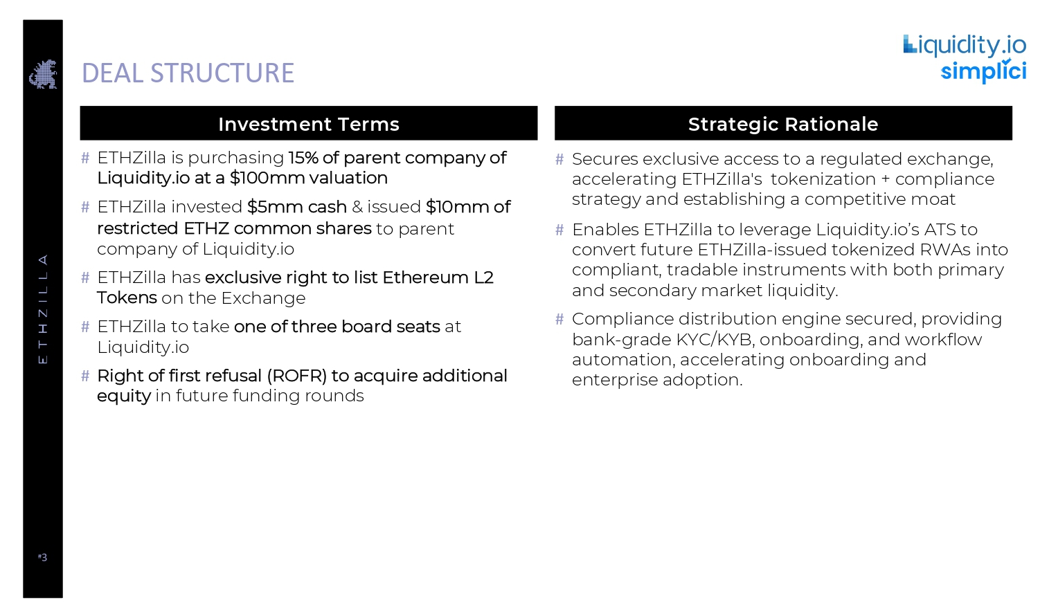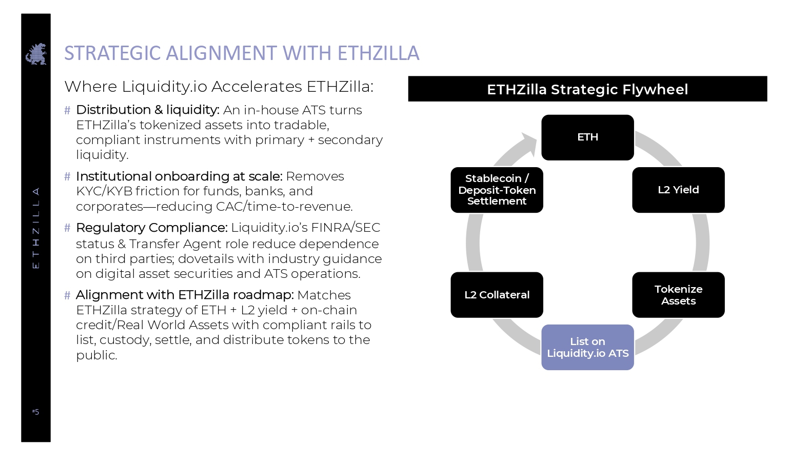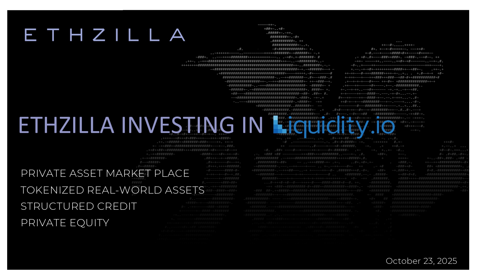On October 22, 2025, ETHZilla Corporation (the “Company”, “we” and “us”), entered into a Purchase and Subscription Agreement (the “Purchase Agreement”) with Satschel, Inc., a Delaware corporation (“Satschel”). Satschel owns Liquidity.io, a regulated broker-dealer and operator of a Digital Alternative Trading System (ATS) platform (the “Platform”).