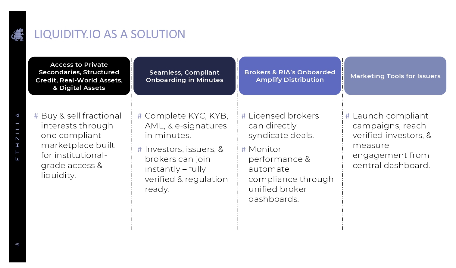 Liquidity.io delivers a fully regulated marketplace for trading private assets, combining Securities and Exchange Commission (SEC)-licensed exchange infrastructure with Ethereum L2 tokenization. The Platform enables institutional and accredited investors to access private secondaries, structured credit, and real-world assets (RWAs) through a single compliant marketplace with instant settlement and liquidity.