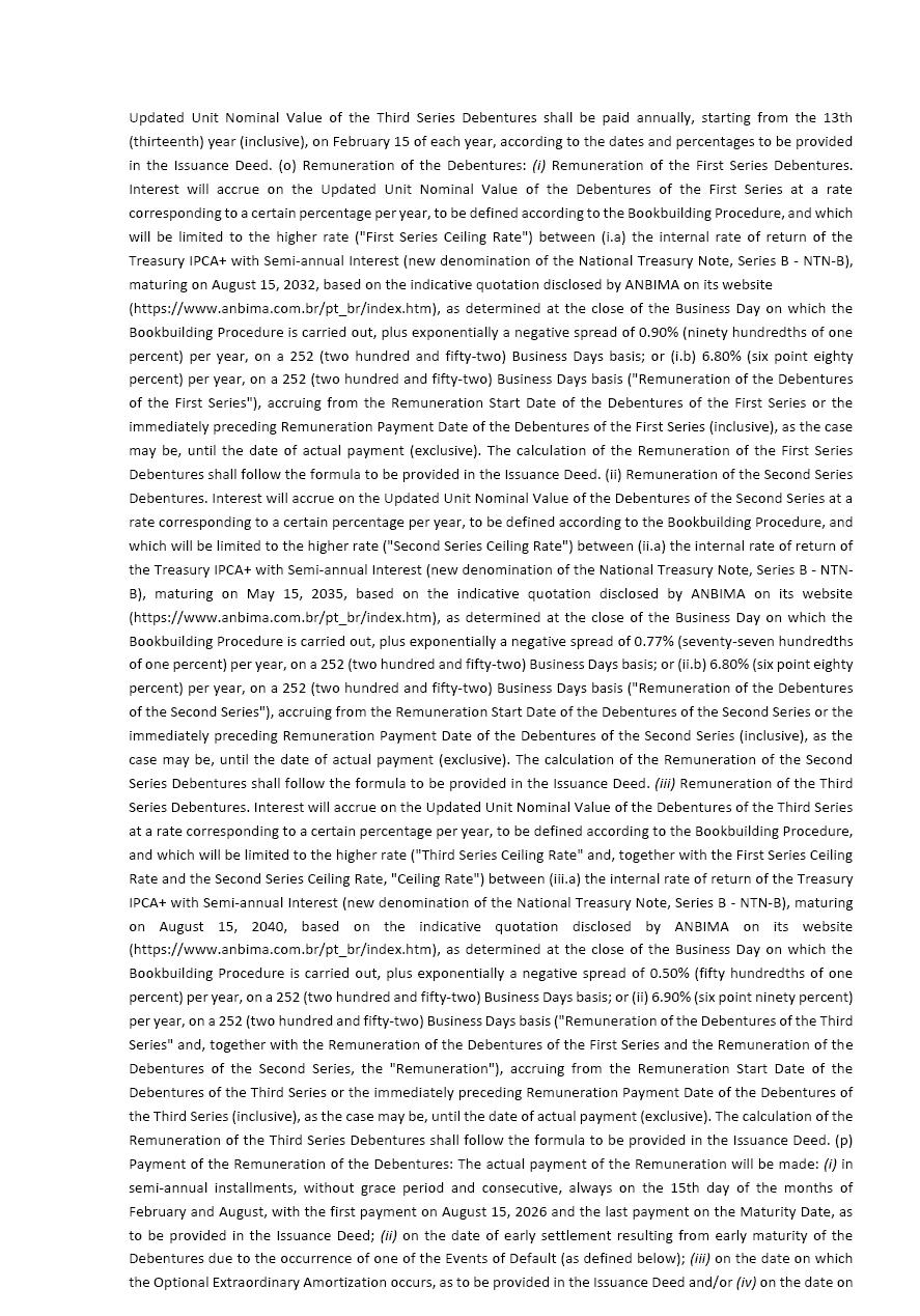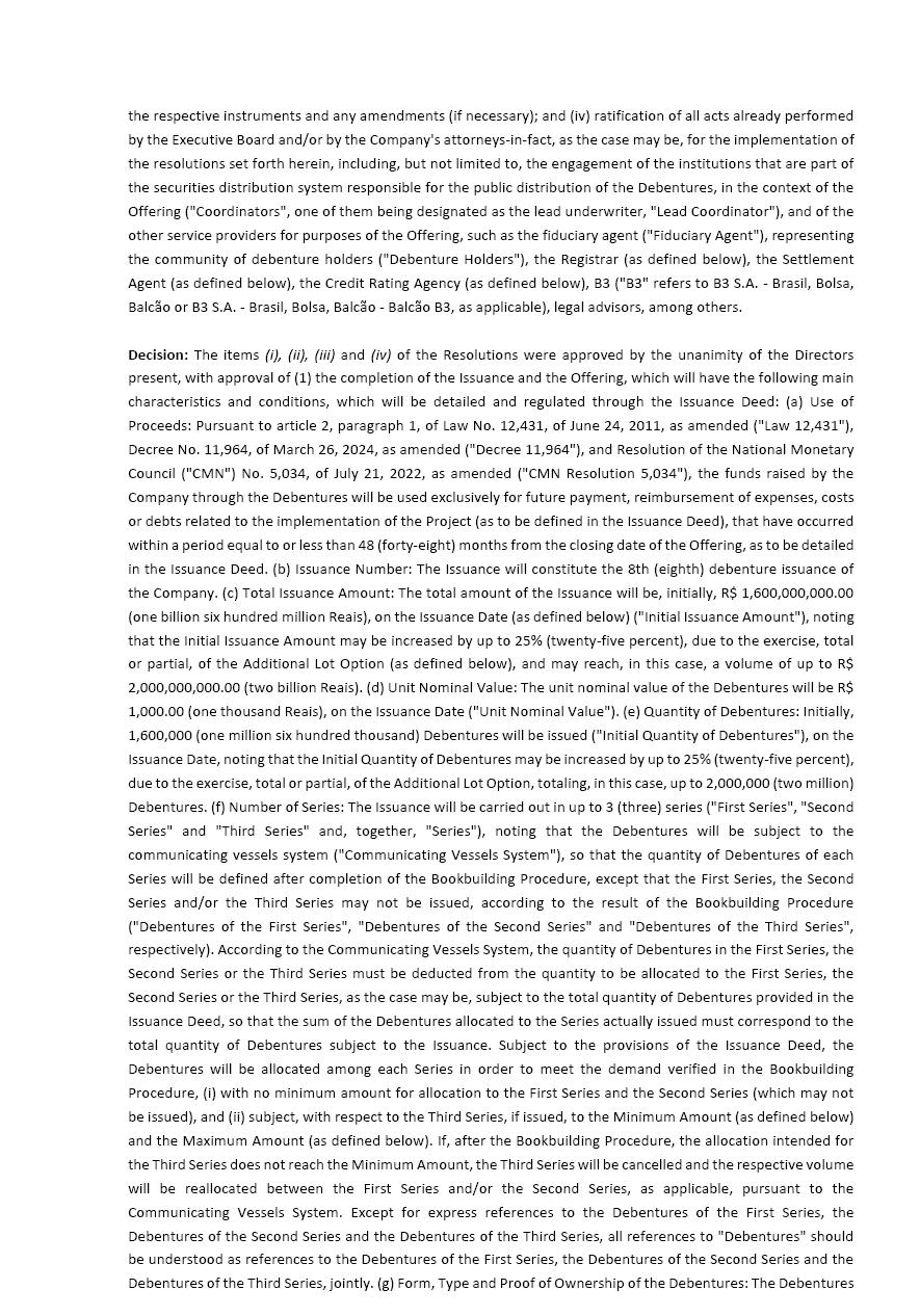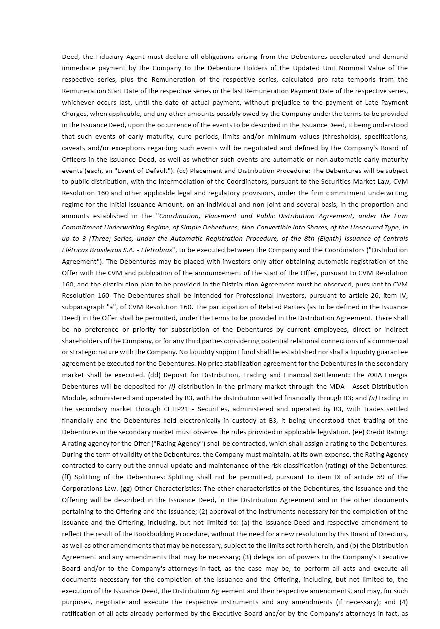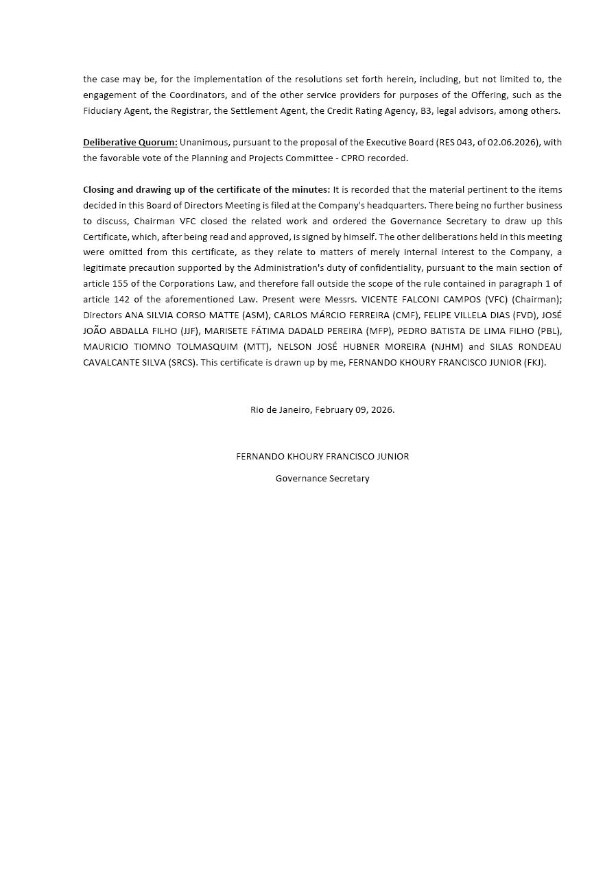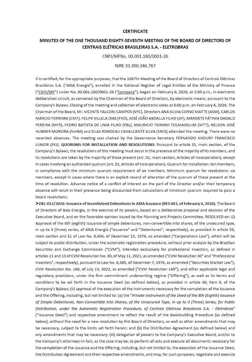 CERTIFICATE MINUTES OF THE ONE THOUSAND EIGHTY-SEVENTH MEETING OF THE BOARD OF DIRECTORS OF CENTRAIS ELÉTRICAS BRASILEIRAS S.A. - ELETROBRAS CNPJ/MFNo. 00.001.180/0001-26 NIRE 33.300.346.767 It is certified, for the appropriate purposes, that the 1087th Meeting of the Board of Directors of Centrais Elétricas Brasileiras S.A. ("AXIA Energia"), enrolled in the National Register of Legal Entities of the Ministry of Finance ("CNPJ/MF") under No. 00.001.180/0001-26 ("Company"), began on February 6, 2026, at 2:00 p.m., in electronic deliberation circuit, as convened by the Chairman of the Board of Directors, by electronic means, pursuant to the Company's Bylaws. Closing of the meeting and collection of electronic votes at 6:00 p.m. on February 6, 2026. The Chairman of the Board, Mr. VICENTE FALCONI CAMPOS (VFC). Directors ANA SILVIA CORSO MATTE (ASM), CARLOS MÁRCIO FERREIRA (CMF), FELIPE VILLELA DIAS (FVD), JOSÉ JOÃO ABDALLA FILHO (JJF), MARISETE FÁTIMA DADALD PEREIRA (MFP), PEDRO BATISTA DE LIMA FILHO (PBL), MAURICIO TIOMNO TOLMASQUIM (MTT), NELSON JOSÉ HUBNER MOREIRA (NJHM) and SILAS RONDEAU CAVALCANTE SILVA (SRCS) attended the meeting. There were no recorded absences. The meeting was chaired by the Governance Secretary FERNANDO KHOURY FRANCISCO JUNIOR (FKJ). QUORUMS FOR INSTALLATION AND RESOLUTIONS: Pursuant to article 31, main section, of the Company's Bylaws, the resolutions of this meeting must occur in the presence of the majority of its members, and its resolutions are taken by the majority of those present (art. 31, main section, Articles of Incorporation), except in cases involving an authorized quorum (art. 32, Articles of Incorporation). Quorum for installation: ten members, in compliance with the minimum quorum requirement of six members. Minimum quorum for resolutions: six members, except in cases where there is an explicit record of alteration of the quorum of those present at the time of resolution. Advance notice of a conflict of interest on the part of the Director and/or their temporary absence will result in their presence being discounted from calculations of minimum quorum required to pass a board resolutions. ➢DEL-012/2026: Issuance of Incentivized Debentures in AXIA Issuance (RES 043, of February 6, 2026). The Board of Directors of Axia Energia, in the exercise of its powers, based on a deliberative proposal and decision of the Executive Board, and on the favorable opinion issued by the Planning and Projects Committee, RESOLVED on: (i) Approval of the 8th (eighth) issuance of simple debentures, non-convertible into shares, of the unsecured type, in up to 3 (three) series, of AXIA Energia ("Issuance" and "Debentures", respectively), as provided in article 59, main section and §1 of Law No. 6,404, of December 15, 1976, as amended ("Corporations Law"), which will be subject to public distribution, under the automatic registration procedure, without prior analysis by the Brazilian Securities and Exchange Commission ("CVM"), intended exclusively for professional investors, as defined in articles 11 and 13 of CVM Resolution No. 30, of May 11, 2021, as amended ("CVM Resolution 30" and "Professional Investors", respectively), pursuant to Law No. 6,385, of December 7, 1976, as amended ("Securities Market Law"), CVM Resolution No. 160, of July 13, 2022, as amended ("CVM Resolution 160"), and other applicable legal and regulatory provisions, under the firm commitment underwriting regime ("Offering"), as well as its terms and conditions to be set forth in the Issuance Deed (as defined below), as provided in article 36, item X, of the Company's Bylaws; (ii) approval of the execution of the instruments necessary for the completion of the Issuance and the Offering, including, but not limited to: (a) the "Private Instrument of the Deed of the 8th (Eighth) Issuance of Simple Debentures, Non-Convertible into Shares, of the Unsecured Type, in up to 3 (Three) Series, for Public Distribution, under the Automatic Registration Procedure, of Centrais Elétricas Brasileiras S.A. - Eletrobras" ("Issuance Deed") and respective amendment to reflect the result of the Bookbuilding Procedure (as defined below), without the need for a new resolution by this Board of Directors, as well as other amendments that may be necessary, subject to the limits set forth herein; and (b) the Distribution Agreement (as defined below) and any amendments that may be necessary; (iii) delegation of powers to the Company's Executive Board, and/or to the Company's attorneys-in-fact, as the case may be, to perform all acts and execute all documents necessary for the completion of the Issuance and the Offering, including, but not limited to, the execution of the Issuance Deed, the Distribution Agreement and their respective amendments, and may, for such purposes, negotiate and execute the respective instruments and any amendments (if necessary); and (iv) ratification of all acts already performed by the Executive Board and/or by the Company's attorneys-in-fact, as the case may be, for the implementation of the resolutions set forth herein, including, but not limited to, the engagement of the institutions that are part of the securities distribution system responsible for the public distribution of the Debentures, in the context of the Offering ("Coordinators", one of them being designated as the lead underwriter, "Lead Coordinator"), and of the other service providers for purposes of the Offering, such as the fiduciary agent ("Fiduciary Agent"), representing the community of debenture holders ("Debenture Holders"), the Registrar (as defined below), the Settlement Agent (as defined below), the Credit Rating Agency (as defined below), B3 ("B3" refers to B3 S.A. - Brasil, Bolsa, Balcão or B3 S.A. - Brasil, Bolsa, Balcão - Balcão B3, as applicable), legal advisors, among others. Decision: The items (i), (ii), (iii) and (iv) of the Resolutions were approved by the unanimity of the Directors present, with approval of