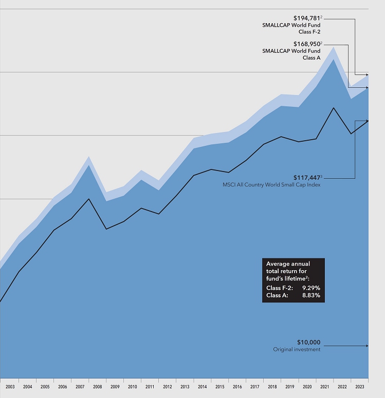 In a period characterized by market volatility and geopolitical turmoil, SMALLCAP World Fund generated a return of 13.64% (F-2 shares) for the fund’s fiscal year ended September 30, 2023. Over the same 12-month period, the fund’s primary benchmark index, the MSCI All Country World Small Cap Index — an unmanaged measure of small capitalization companies from around the world — climbed 15.24%.