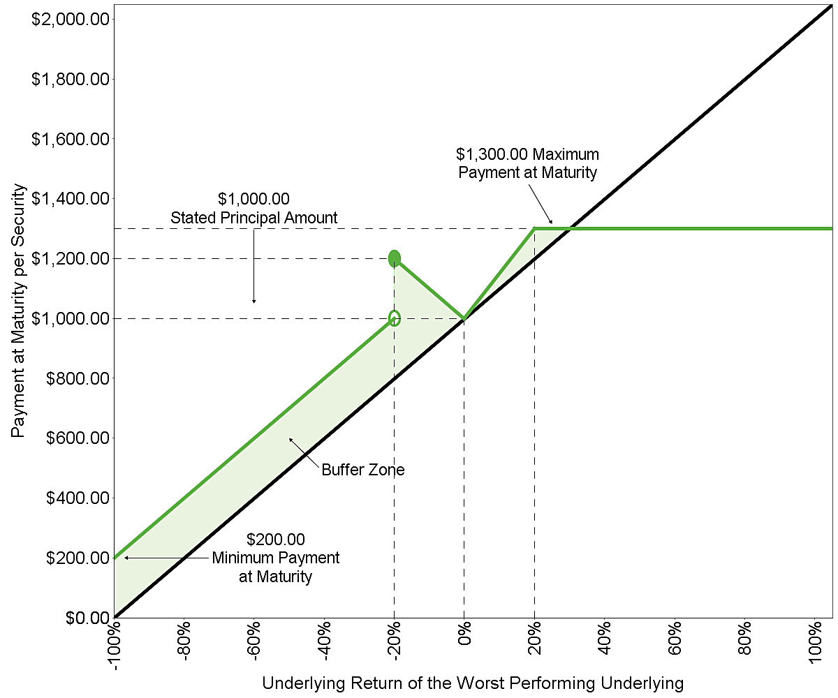You will receive at maturity for each security you then hold: ■If the final underlying value of the worst performing underlying is greater than or equal to its initial underlying value: $1,000 + the upside return amount, subject to the maximum upside return ■If the final underlying value of the worst performing underlying is less than its initial underlying value but greater than or equal to its final buffer value: $1,000 + the absolute return amount ■If the final underlying value of the worst performing underlying is less than its final buffer value: $1,000 + [$1,000 × (the underlying return of the worst performing underlying + the buffer percentage)] If the final underlying value of the worst performing underlying is less than its final buffer value, which means that the worst performing underlying has depreciated from its initial underlying value by more than the buffer percentage, you will lose 1% of the stated principal amount of your securities at maturity for every 1% by which that depreciation exceeds the buffer percentage. |