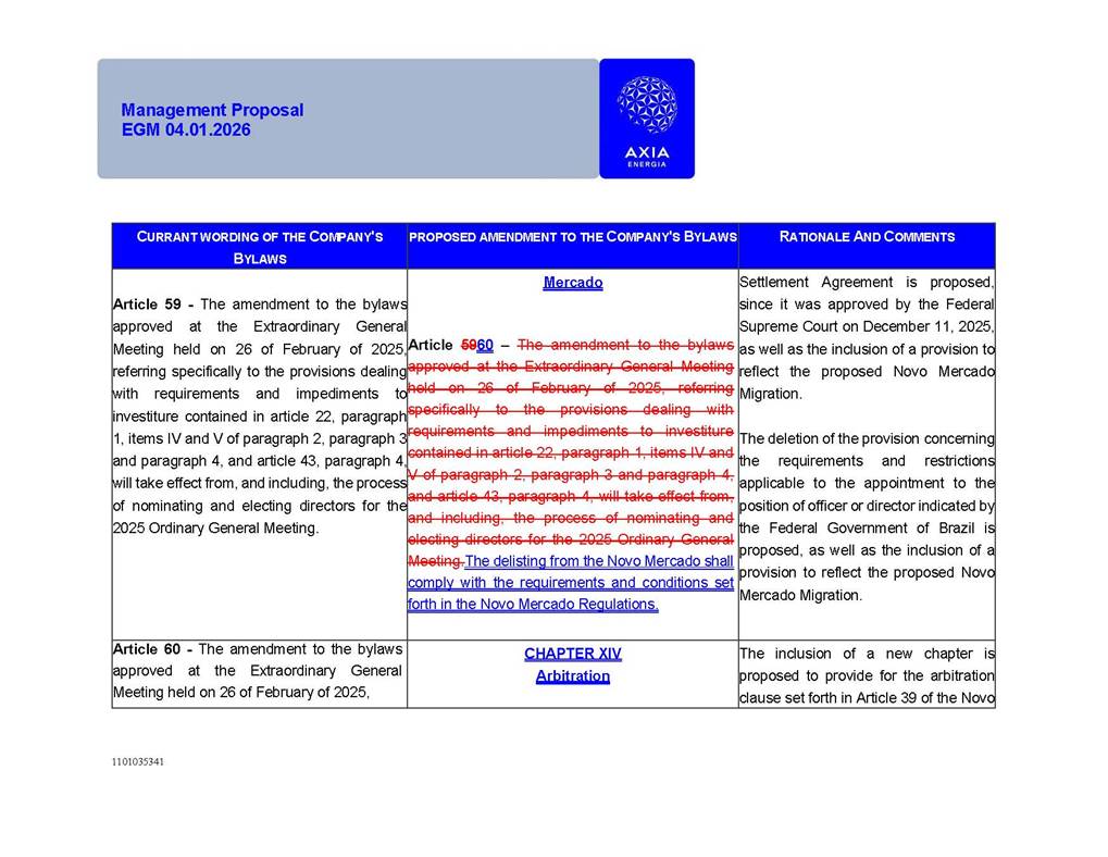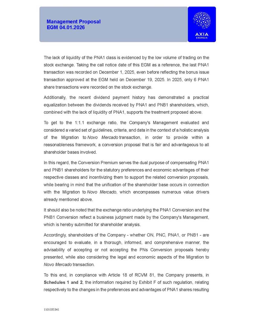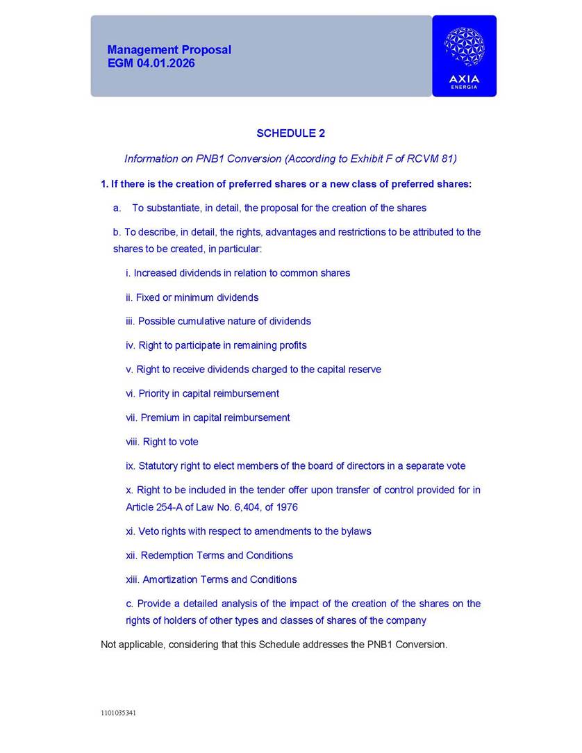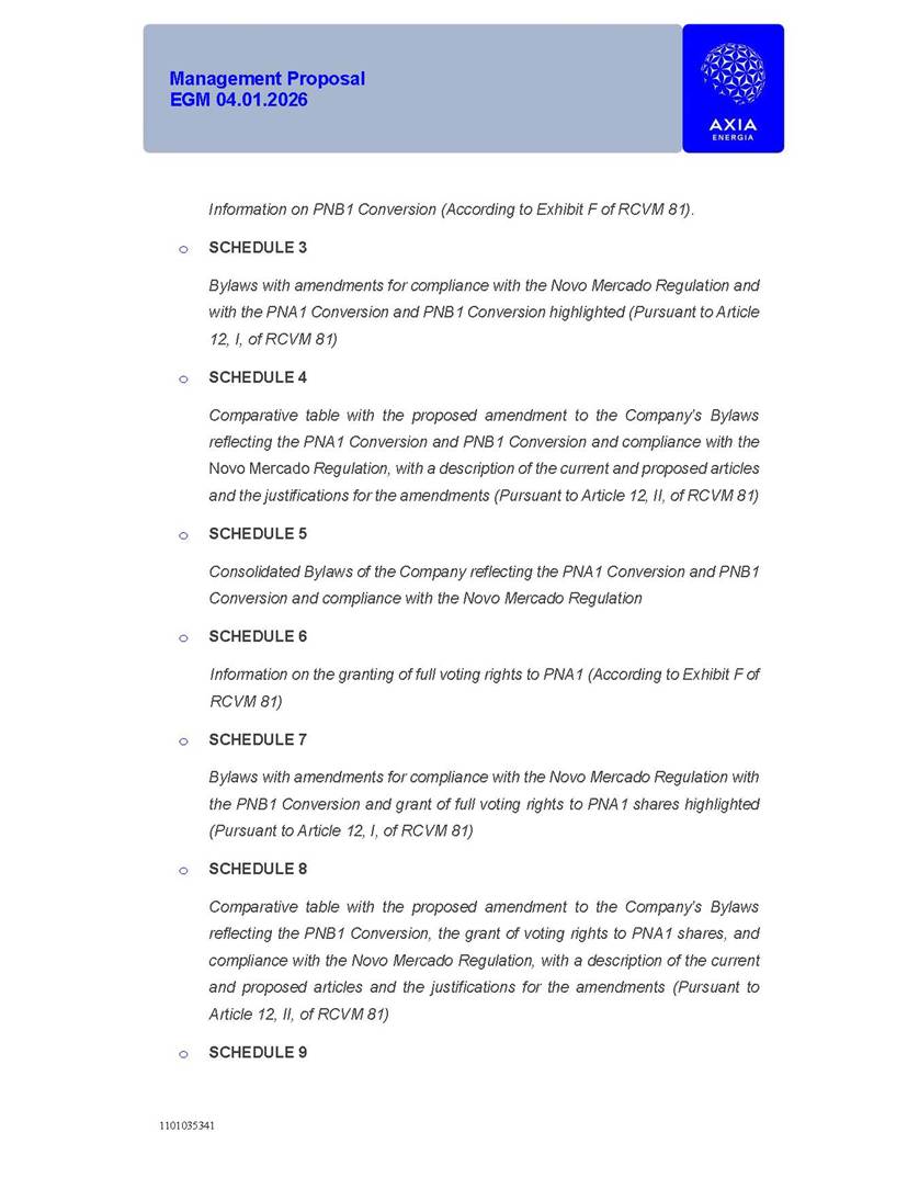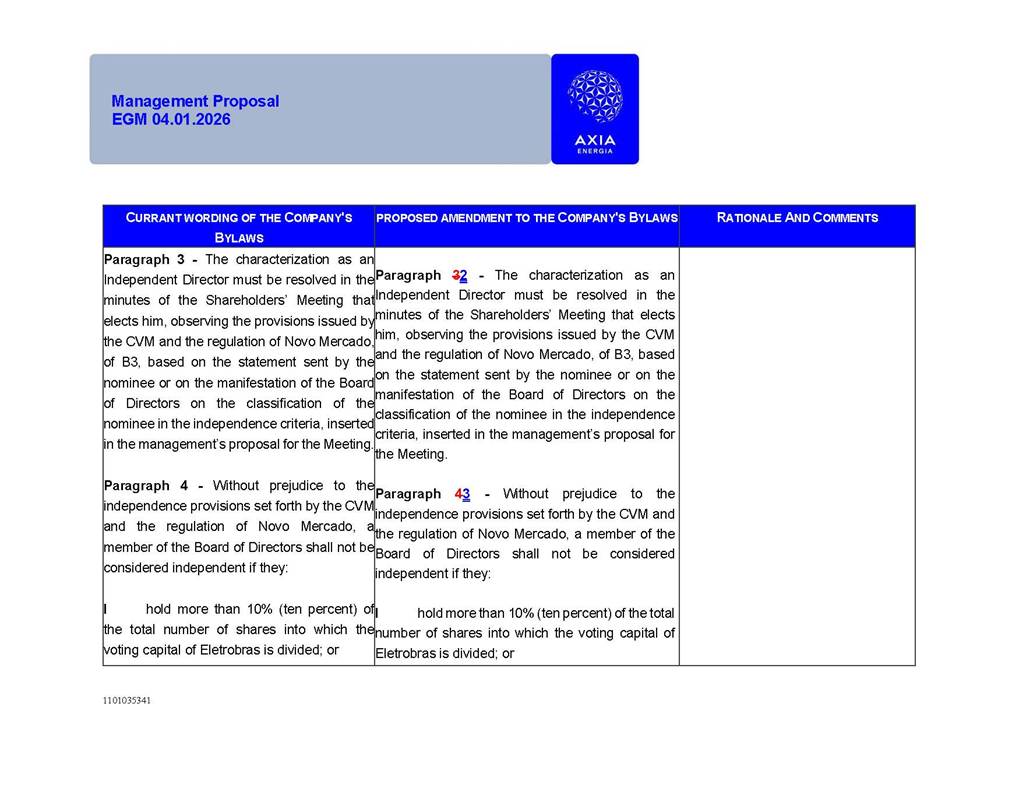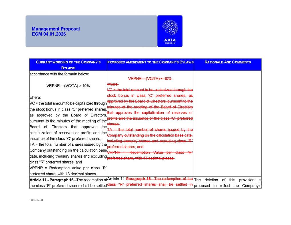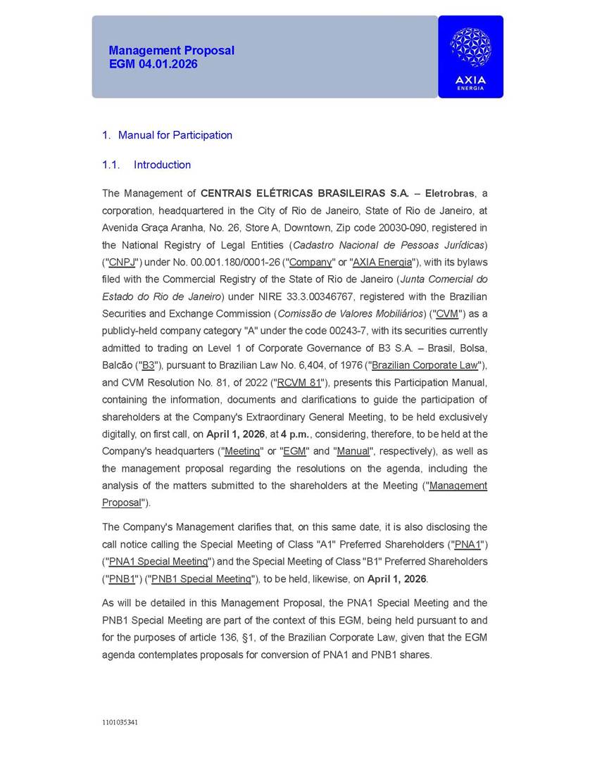 1101035341 Management Proposal EGM 04.01.2026 Management Proposal EGM 04.01.2026 1101035341 Management Proposal EGM 04.01.2026 Index 1. Manual for Participation ................................................................... 47 1.1. Introduction ...................................................................................... 47 1.2. Exclusively Digital Meeting .............................................................. 58 1.3. Remote Voting Ballot (BVD) ............................................................ 69 1.4. Required Documents ..................................................................... 812 1.5. Registration and Accreditation ..................................................... 1013 1.6. Declaration of Membership in a Group of Shareholders .............. 1215 2. Management Proposal .............................................................. 1417 2.1. General Guidelines ...................................................................... 1417 2.2. Agenda ........................................................................................ 1518 2.3. Clarifications on the agenda of the EGM ..................................... 1621 2.4. List of Schedules ......................................................................... 3344 2.5. Conclusion ................................................................................... 3545 SCHEDULE 1 ............................................................................................... 3646 SCHEDULE 2 ............................................................................................... 4259 SCHEDULE 3 ............................................................................................... 4664 SCHEDULE 4 ............................................................................................ 101119 SCHEDULE 5 ........................................................................................... 138157 SCHEDULE 6 ........................................................................................... 189208 SCHEDULE 7 ........................................................................................... 193212 SCHEDULE 8 ........................................................................................... 247266 SCHEDULE 9 ........................................................................................... 284304 1101035341 Management Proposal EGM 04.01.2026 1101035341 Management Proposal EGM 04.01.2026 1. Manual for Participation 1.1. Introduction The Management of CENTRAIS ELÉTRICAS BRASILEIRAS S.A. – Eletrobras, a corporation, headquartered in the City of Rio de Janeiro, State of Rio de Janeiro, at Avenida Graça Aranha, No. 26, Store A, Downtown, Zip code 20030-090, registered in the National Registry of Legal Entities (Cadastro Nacional de Pessoas Jurídicas) ("CNPJ") under No. 00.001.180/0001-26 ("Company" or "AXIA Energia"), with its bylaws filed with the Commercial Registry of the State of Rio de Janeiro (Junta Comercial do Estado do Rio de Janeiro) under NIRE 33.3.00346767, registered with the Brazilian Securities and Exchange Commission (Comissão de Valores Mobiliários) ("CVM") as a publicly-held company category "A" under the code 00243-7, with its securities currently admitted to trading on Level 1 of Corporate Governance of B3 S.A. – Brasil, Bolsa, Balcão ("B3"), pursuant to Brazilian Law No. 6,404, of 1976 ("Brazilian Corporate Law"), and CVM Resolution No. 81, of 2022 ("RCVM 81"), presents this Participation Manual, containing the information, documents and clarifications to guide the participation of shareholders at the Company's Extraordinary General Meeting, to be held exclusively digitally, on first call, on April 1, 2026, at 4 p.m., considering, therefore, to be held at the Company's headquarters ("Meeting" or "EGM" and "Manual", respectively), as well as the management proposal regarding the resolutions on the agenda, including the analysis of the matters submitted to the shareholders at the Meeting ("Management Proposal"). The Company's Management clarifies that, on this same date, it is also disclosing the call notice calling the Special Meeting of Class "A1" Preferred Shareholders ("PNA1") ("PNA1 Special Meeting") and the Special Meeting of Class "B1" Preferred Shareholders ("PNB1") ("PNB1 Special Meeting"), to be held, likewise, on April 1, 2026. As will be detailed in this Management Proposal, the PNA1 Special Meeting and the PNB1 Special Meeting are part of the context of this EGM, being held pursuant to and for the purposes of article 136, §1, of the Brazilian Corporate Law, given that the EGM agenda contemplates proposals for conversion of PNA1 and PNB1 shares. 1101035341 Management Proposal EGM 04.01.2026 1.2. Exclusively Digital Meeting The Meeting will be exclusively digital, to be held through the digital platform of "Atlas AGM" ("Digital Platform"). The exclusively digital format is intended to facilitate the participation of shareholders and others involved in the Meeting, pursuant to the Brazilian Corporate Law, RCVM 81 and the Company's Bylaws. Shareholders who wish to participate in the Meeting must register on the https://atlasagm.com website or through the "Atlas AGM" application available on the Apple Store and Google Play Store ("Application") and submit all documents necessary to qualify for participation or voting at the Meeting by 11:59 p.m. on March 30, 2026. The Digital Platform meets the requirements set forth in article 28, paragraph 1, items I to III, of RCVM 81 and the Meeting will be fully recorded. By accessing the Digital Platform and participating in the Meeting, the Admitted Shareholder (as defined below) authorizes the Company, and third parties authorized by the Company, to record and use the information, in accordance with applicable law. The recordings and related information will be used and processed by the Company for a period of five years, and may be used for the Company's de