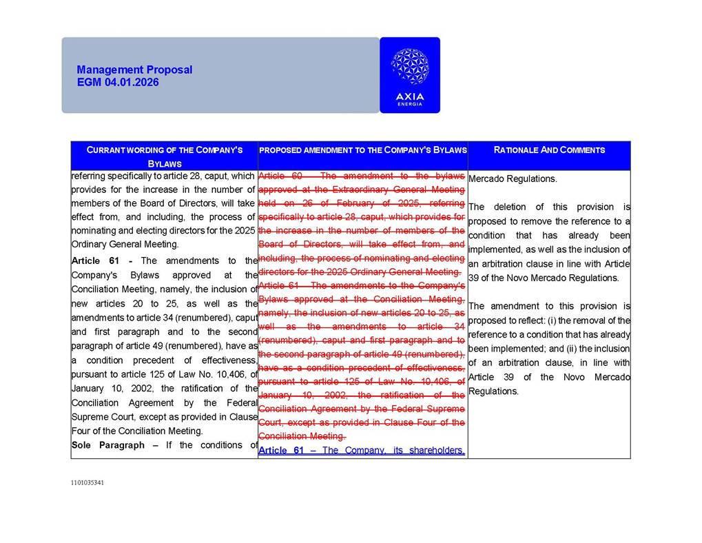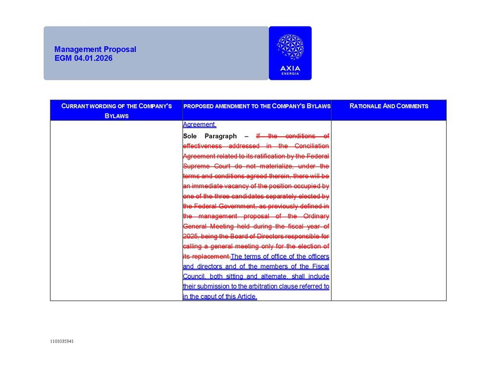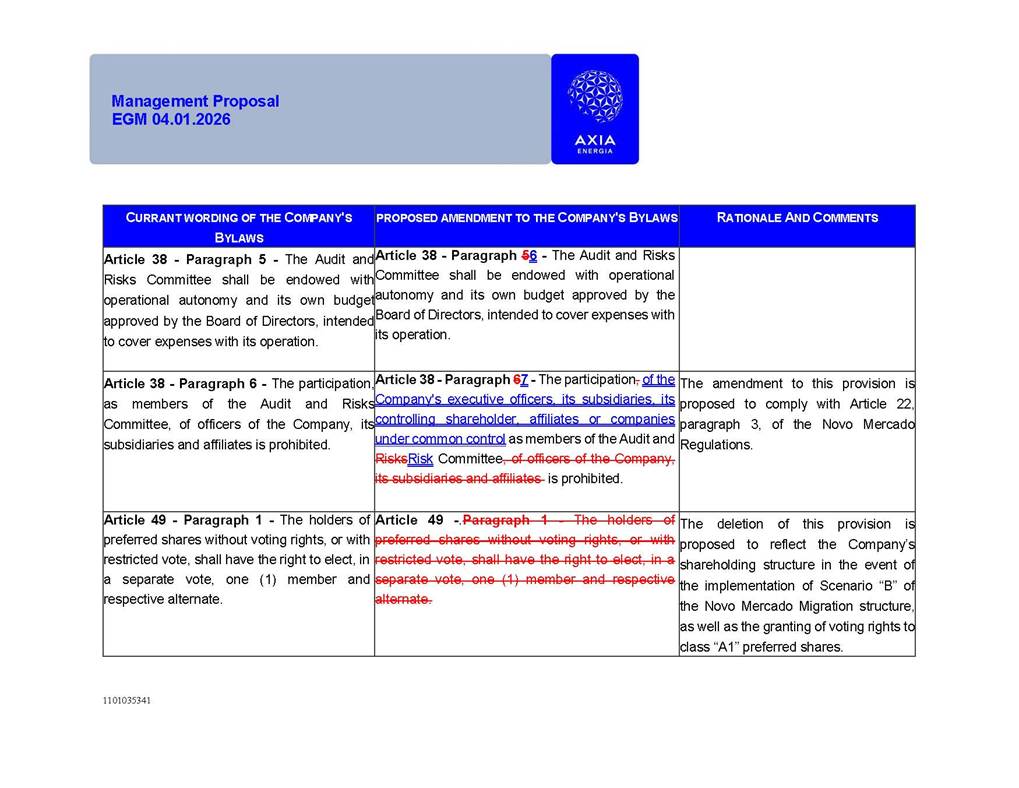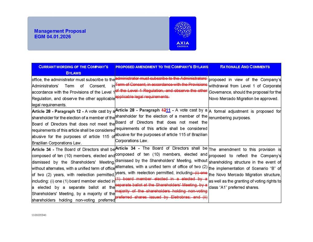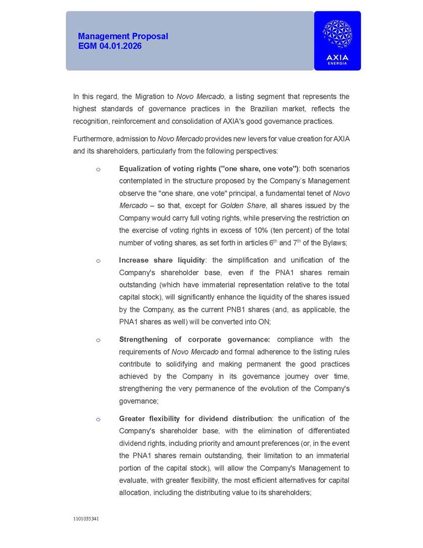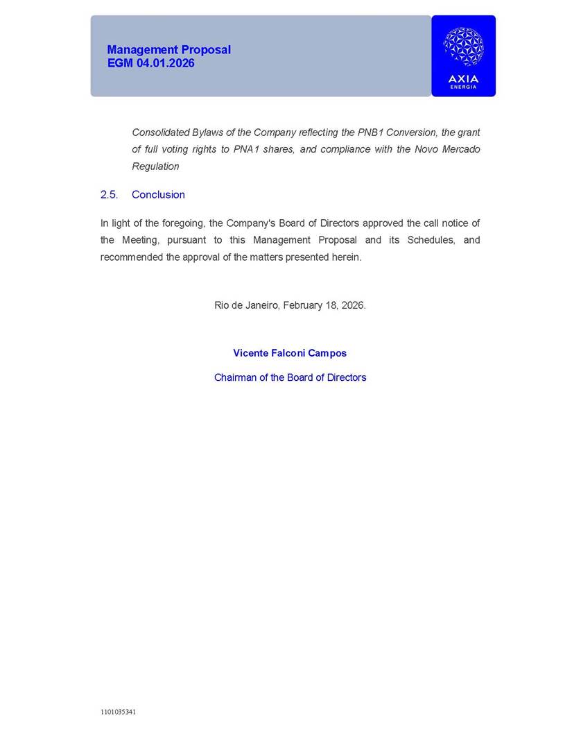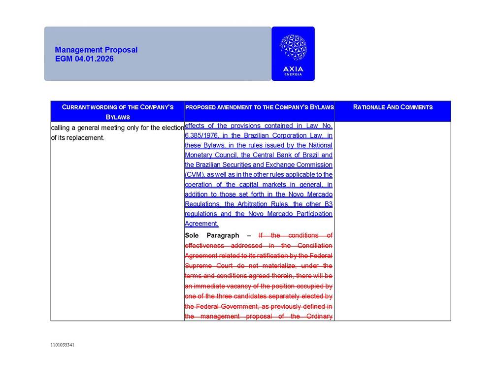 1101035341 Management Proposal EGM 04.01.2026 Management Proposal EGM 04.01.2026 1101035341 Management Proposal EGM 04.01.2026 Index 1. Manual for Participation ................................................................... 47 1.1. Introduction ...................................................................................... 47 1.2. Exclusively Digital Meeting .............................................................. 58 1.3. Remote Voting Ballot (BVD) ............................................................ 69 1.4. Required Documents ..................................................................... 812 1.5. Registration and Accreditation ..................................................... 1013 1.6. Declaration of Membership in a Group of Shareholders .............. 1215 2. Management Proposal .............................................................. 1417 2.1. General Guidelines ...................................................................... 1417 2.2. Agenda ........................................................................................ 1518 2.3. Clarifications on the agenda of the EGM ..................................... 1621 2.4. List of Schedules ......................................................................... 3344 2.5. Conclusion ................................................................................... 3545 SCHEDULE 1 ............................................................................................... 3646 SCHEDULE 2 ............................................................................................... 4259 SCHEDULE 3 ............................................................................................... 4664 SCHEDULE 4 ............................................................................................ 101119 SCHEDULE 5 ........................................................................................... 138157 SCHEDULE 6 ........................................................................................... 189208 SCHEDULE 7 ........................................................................................... 193212 SCHEDULE 8 ........................................................................................... 247266 SCHEDULE 9 ........................................................................................... 284304 1101035341 Management Proposal EGM 04.01.2026 1101035341 Management Proposal EGM 04.01.2026 1. Manual for Participation 1.1. Introduction The Management of CENTRAIS ELÉTRICAS BRASILEIRAS S.A. – Eletrobras, a corporation, headquartered in the City of Rio de Janeiro, State of Rio de Janeiro, at Avenida Graça Aranha, No. 26, Store A, Downtown, Zip code 20030-090, registered in the National Registry of Legal Entities (Cadastro Nacional de Pessoas Jurídicas) ("CNPJ") under No. 00.001.180/0001-26 ("Company" or "AXIA Energia"), with its bylaws filed with the Commercial Registry of the State of Rio de Janeiro (Junta Comercial do Estado do Rio de Janeiro) under NIRE 33.3.00346767, registered with the Brazilian Securities and Exchange Commission (Comissão de Valores Mobiliários) ("CVM") as a publicly-held company category "A" under the code 00243-7, with its securities currently admitted to trading on Level 1 of Corporate Governance of B3 S.A. – Brasil, Bolsa, Balcão ("B3"), pursuant to Brazilian Law No. 6,404, of 1976 ("Brazilian Corporate Law"), and CVM Resolution No. 81, of 2022 ("RCVM 81"), presents this Participation Manual, containing the information, documents and clarifications to guide the participation of shareholders at the Company's Extraordinary General Meeting, to be held exclusively digitally, on first call, on April 1, 2026, at 4 p.m., considering, therefore, to be held at the Company's headquarters ("Meeting" or "EGM" and "Manual", respectively), as well as the management proposal regarding the resolutions on the agenda, including the analysis of the matters submitted to the shareholders at the Meeting ("Management Proposal"). The Company's Management clarifies that, on this same date, it is also disclosing the call notice calling the Special Meeting of Class "A1" Preferred Shareholders ("PNA1") ("PNA1 Special Meeting") and the Special Meeting of Class "B1" Preferred Shareholders ("PNB1") ("PNB1 Special Meeting"), to be held, likewise, on April 1, 2026. As will be detailed in this Management Proposal, the PNA1 Special Meeting and the PNB1 Special Meeting are part of the context of this EGM, being held pursuant to and for the purposes of article 136, §1, of the Brazilian Corporate Law, given that the EGM agenda contemplates proposals for conversion of PNA1 and PNB1 shares. 1101035341 Management Proposal EGM 04.01.2026 1.2. Exclusively Digital Meeting The Meeting will be exclusively digital, to be held through the digital platform of "Atlas AGM" ("Digital Platform"). The exclusively digital format is intended to facilitate the participation of shareholders and others involved in the Meeting, pursuant to the Brazilian Corporate Law, RCVM 81 and the Company's Bylaws. Shareholders who wish to participate in the Meeting must register on the https://atlasagm.com website or through the "Atlas AGM" application available on the Apple Store and Google Play Store ("Application") and submit all documents necessary to qualify for participation or voting at the Meeting by 11:59 p.m. on March 30, 2026. The Digital Platform meets the requirements set forth in article 28, paragraph 1, items I to III, of RCVM 81 and the Meeting will be fully recorded. By accessing the Digital Platform and participating in the Meeting, the Admitted Shareholder (as defined below) authorizes the Company, and third parties authorized by the Company, to record and use the information, in accordance with applicable law. The recordings and related information will be used and processed by the Company for a period of five years, and may be used for the Company's de