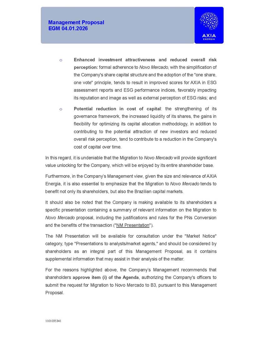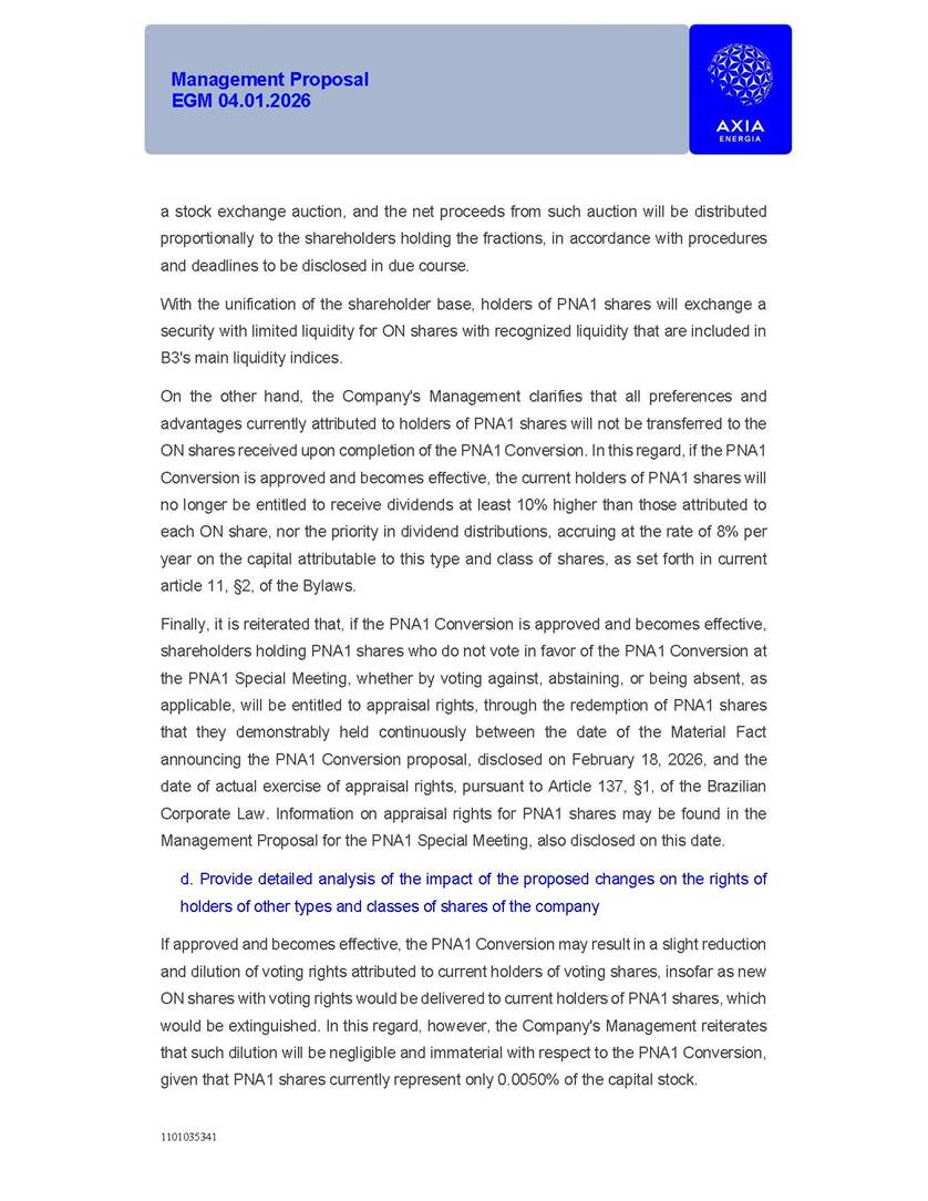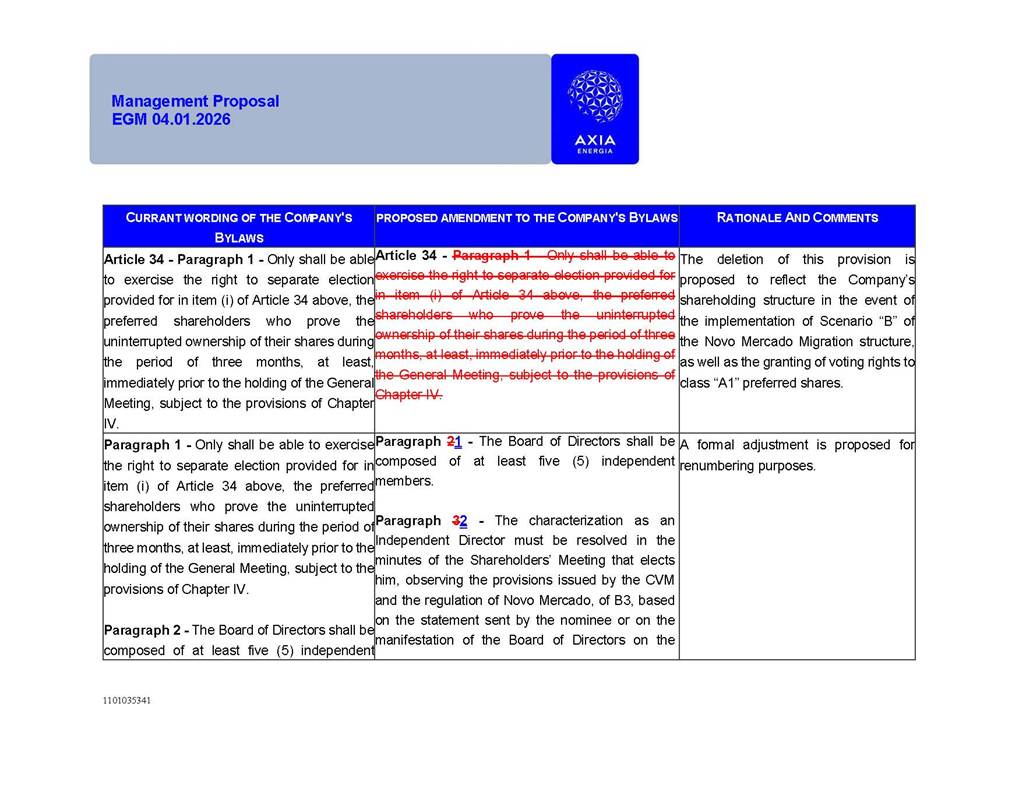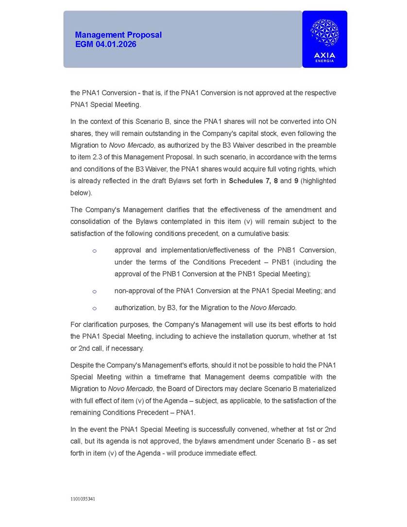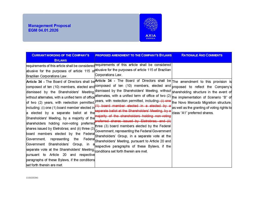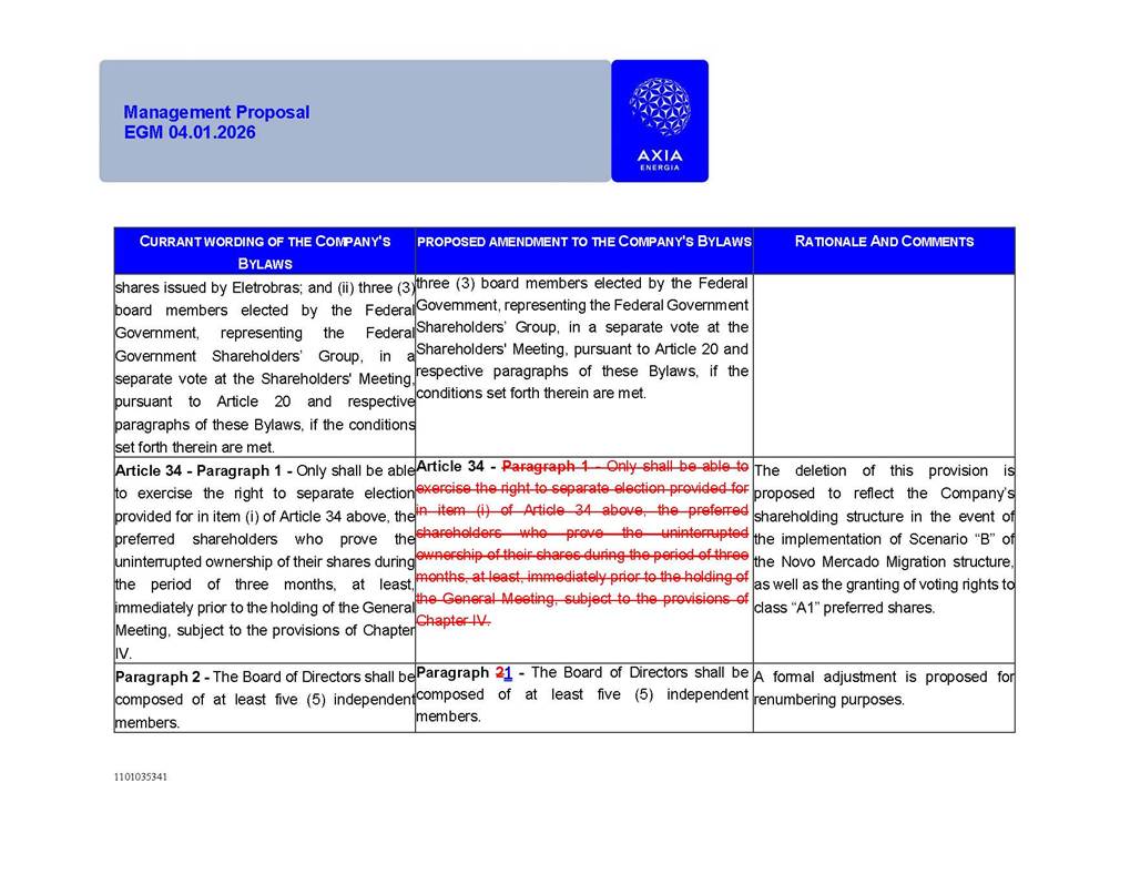1101035341 Management Proposal EGM 04.01.2026 Management Proposal EGM 04.01.2026 1101035341 Management Proposal EGM 04.01.2026 Index 1. Manual for Participation ................................................................... 47 1.1. Introduction ...................................................................................... 47 1.2. Exclusively Digital Meeting .............................................................. 58 1.3. Remote Voting Ballot (BVD) ............................................................ 69 1.4. Required Documents ..................................................................... 812 1.5. Registration and Accreditation ..................................................... 1013 1.6. Declaration of Membership in a Group of Shareholders .............. 1215 2. Management Proposal .............................................................. 1417 2.1. General Guidelines ...................................................................... 1417 2.2. Agenda ........................................................................................ 1518 2.3. Clarifications on the agenda of the EGM ..................................... 1621 2.4. List of Schedules ......................................................................... 3344 2.5. Conclusion ................................................................................... 3545 SCHEDULE 1 ............................................................................................... 3646 SCHEDULE 2 ............................................................................................... 4259 SCHEDULE 3 ............................................................................................... 4664 SCHEDULE 4 ............................................................................................ 101119 SCHEDULE 5 ........................................................................................... 138157 SCHEDULE 6 ........................................................................................... 189208 SCHEDULE 7 ........................................................................................... 193212 SCHEDULE 8 ........................................................................................... 247266 SCHEDULE 9 ........................................................................................... 284304 1101035341 Management Proposal EGM 04.01.2026 1101035341 Management Proposal EGM 04.01.2026 1. Manual for Participation 1.1. Introduction The Management of CENTRAIS ELÉTRICAS BRASILEIRAS S.A. – Eletrobras, a corporation, headquartered in the City of Rio de Janeiro, State of Rio de Janeiro, at Avenida Graça Aranha, No. 26, Store A, Downtown, Zip code 20030-090, registered in the National Registry of Legal Entities (Cadastro Nacional de Pessoas Jurídicas) ("CNPJ") under No. 00.001.180/0001-26 ("Company" or "AXIA Energia"), with its bylaws filed with the Commercial Registry of the State of Rio de Janeiro (Junta Comercial do Estado do Rio de Janeiro) under NIRE 33.3.00346767, registered with the Brazilian Securities and Exchange Commission (Comissão de Valores Mobiliários) ("CVM") as a publicly-held company category "A" under the code 00243-7, with its securities currently admitted to trading on Level 1 of Corporate Governance of B3 S.A. – Brasil, Bolsa, Balcão ("B3"), pursuant to Brazilian Law No. 6,404, of 1976 ("Brazilian Corporate Law"), and CVM Resolution No. 81, of 2022 ("RCVM 81"), presents this Participation Manual, containing the information, documents and clarifications to guide the participation of shareholders at the Company's Extraordinary General Meeting, to be held exclusively digitally, on first call, on April 1, 2026, at 4 p.m., considering, therefore, to be held at the Company's headquarters ("Meeting" or "EGM" and "Manual", respectively), as well as the management proposal regarding the resolutions on the agenda, including the analysis of the matters submitted to the shareholders at the Meeting ("Management Proposal"). The Company's Management clarifies that, on this same date, it is also disclosing the call notice calling the Special Meeting of Class "A1" Preferred Shareholders ("PNA1") ("PNA1 Special Meeting") and the Special Meeting of Class "B1" Preferred Shareholders ("PNB1") ("PNB1 Special Meeting"), to be held, likewise, on April 1, 2026. As will be detailed in this Management Proposal, the PNA1 Special Meeting and the PNB1 Special Meeting are part of the context of this EGM, being held pursuant to and for the purposes of article 136, §1, of the Brazilian Corporate Law, given that the EGM agenda contemplates proposals for conversion of PNA1 and PNB1 shares. 1101035341 Management Proposal EGM 04.01.2026 1.2. Exclusively Digital Meeting The Meeting will be exclusively digital, to be held through the digital platform of "Atlas AGM" ("Digital Platform"). The exclusively digital format is intended to facilitate the participation of shareholders and others involved in the Meeting, pursuant to the Brazilian Corporate Law, RCVM 81 and the Company's Bylaws. Shareholders who wish to participate in the Meeting must register on the https://atlasagm.com website or through the "Atlas AGM" application available on the Apple Store and Google Play Store ("Application") and submit all documents necessary to qualify for participation or voting at the Meeting by 11:59 p.m. on March 30, 2026. The Digital Platform meets the requirements set forth in article 28, paragraph 1, items I to III, of RCVM 81 and the Meeting will be fully recorded. By accessing the Digital Platform and participating in the Meeting, the Admitted Shareholder (as defined below) authorizes the Company, and third parties authorized by the Company, to record and use the information, in accordance with applicable law. The recordings and related information will be used and processed by the Company for a period of five years, and may be used for the Company's de