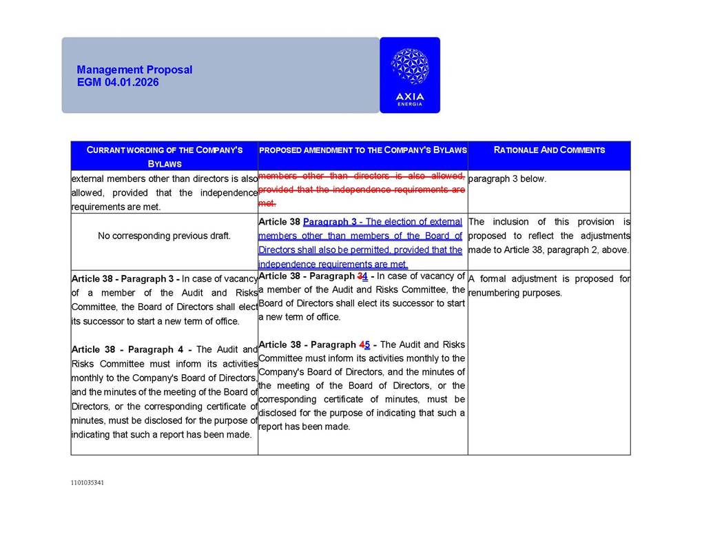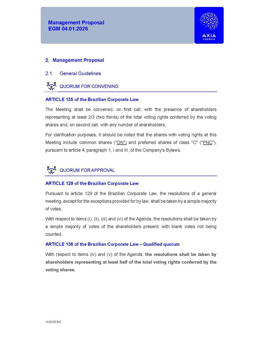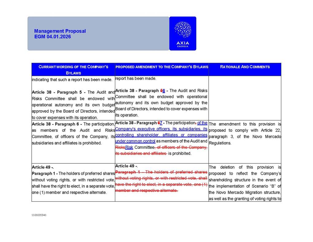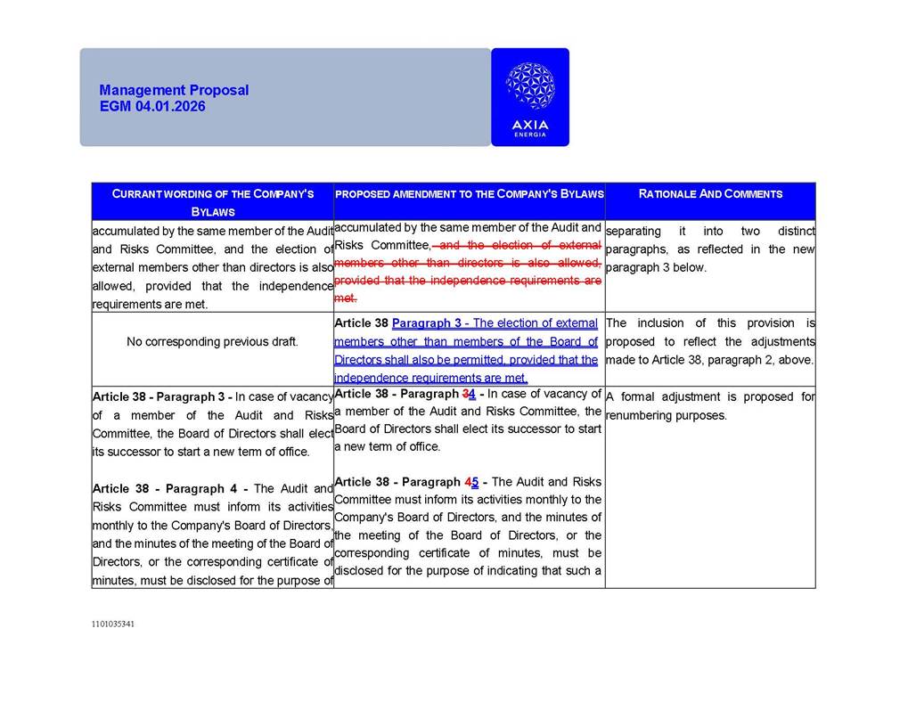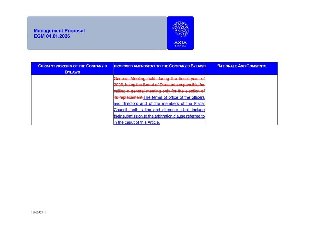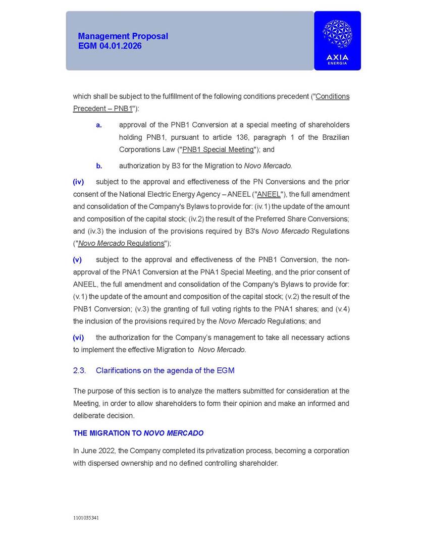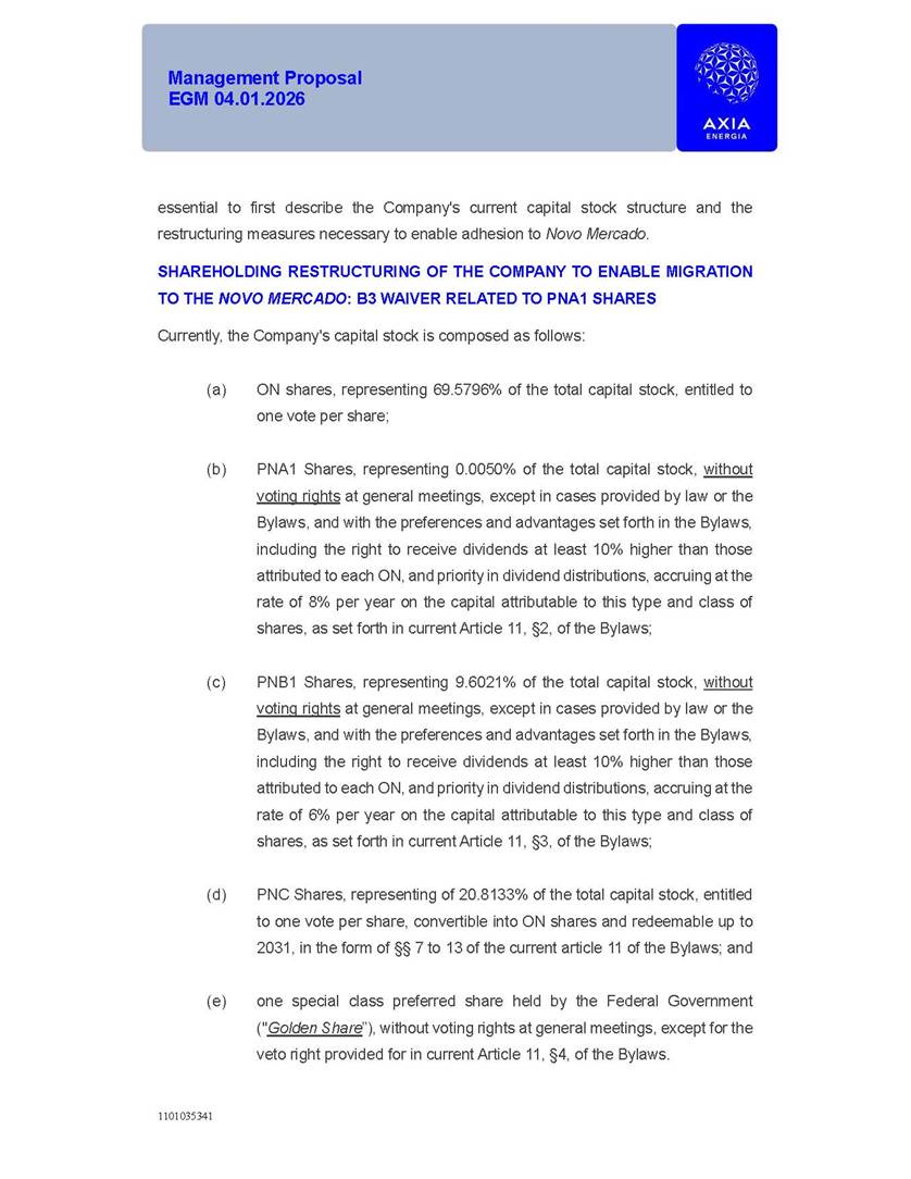 1101035341 Management Proposal EGM 04.01.2026 Management Proposal EGM 04.01.2026 1101035341 Management Proposal EGM 04.01.2026 Index 1. Manual for Participation ................................................................... 47 1.1. Introduction ...................................................................................... 47 1.2. Exclusively Digital Meeting .............................................................. 58 1.3. Remote Voting Ballot (BVD) ............................................................ 69 1.4. Required Documents ..................................................................... 812 1.5. Registration and Accreditation ..................................................... 1013 1.6. Declaration of Membership in a Group of Shareholders .............. 1215 2. Management Proposal .............................................................. 1417 2.1. General Guidelines ...................................................................... 1417 2.2. Agenda ........................................................................................ 1518 2.3. Clarifications on the agenda of the EGM ..................................... 1621 2.4. List of Schedules ......................................................................... 3344 2.5. Conclusion ................................................................................... 3545 SCHEDULE 1 ............................................................................................... 3646 SCHEDULE 2 ............................................................................................... 4259 SCHEDULE 3 ............................................................................................... 4664 SCHEDULE 4 ............................................................................................ 101119 SCHEDULE 5 ........................................................................................... 138157 SCHEDULE 6 ........................................................................................... 189208 SCHEDULE 7 ........................................................................................... 193212 SCHEDULE 8 ........................................................................................... 247266 SCHEDULE 9 ........................................................................................... 284304 1101035341 Management Proposal EGM 04.01.2026 1101035341 Management Proposal EGM 04.01.2026 1. Manual for Participation 1.1. Introduction The Management of CENTRAIS ELÉTRICAS BRASILEIRAS S.A. – Eletrobras, a corporation, headquartered in the City of Rio de Janeiro, State of Rio de Janeiro, at Avenida Graça Aranha, No. 26, Store A, Downtown, Zip code 20030-090, registered in the National Registry of Legal Entities (Cadastro Nacional de Pessoas Jurídicas) ("CNPJ") under No. 00.001.180/0001-26 ("Company" or "AXIA Energia"), with its bylaws filed with the Commercial Registry of the State of Rio de Janeiro (Junta Comercial do Estado do Rio de Janeiro) under NIRE 33.3.00346767, registered with the Brazilian Securities and Exchange Commission (Comissão de Valores Mobiliários) ("CVM") as a publicly-held company category "A" under the code 00243-7, with its securities currently admitted to trading on Level 1 of Corporate Governance of B3 S.A. – Brasil, Bolsa, Balcão ("B3"), pursuant to Brazilian Law No. 6,404, of 1976 ("Brazilian Corporate Law"), and CVM Resolution No. 81, of 2022 ("RCVM 81"), presents this Participation Manual, containing the information, documents and clarifications to guide the participation of shareholders at the Company's Extraordinary General Meeting, to be held exclusively digitally, on first call, on April 1, 2026, at 4 p.m., considering, therefore, to be held at the Company's headquarters ("Meeting" or "EGM" and "Manual", respectively), as well as the management proposal regarding the resolutions on the agenda, including the analysis of the matters submitted to the shareholders at the Meeting ("Management Proposal"). The Company's Management clarifies that, on this same date, it is also disclosing the call notice calling the Special Meeting of Class "A1" Preferred Shareholders ("PNA1") ("PNA1 Special Meeting") and the Special Meeting of Class "B1" Preferred Shareholders ("PNB1") ("PNB1 Special Meeting"), to be held, likewise, on April 1, 2026. As will be detailed in this Management Proposal, the PNA1 Special Meeting and the PNB1 Special Meeting are part of the context of this EGM, being held pursuant to and for the purposes of article 136, §1, of the Brazilian Corporate Law, given that the EGM agenda contemplates proposals for conversion of PNA1 and PNB1 shares. 1101035341 Management Proposal EGM 04.01.2026 1.2. Exclusively Digital Meeting The Meeting will be exclusively digital, to be held through the digital platform of "Atlas AGM" ("Digital Platform"). The exclusively digital format is intended to facilitate the participation of shareholders and others involved in the Meeting, pursuant to the Brazilian Corporate Law, RCVM 81 and the Company's Bylaws. Shareholders who wish to participate in the Meeting must register on the https://atlasagm.com website or through the "Atlas AGM" application available on the Apple Store and Google Play Store ("Application") and submit all documents necessary to qualify for participation or voting at the Meeting by 11:59 p.m. on March 30, 2026. The Digital Platform meets the requirements set forth in article 28, paragraph 1, items I to III, of RCVM 81 and the Meeting will be fully recorded. By accessing the Digital Platform and participating in the Meeting, the Admitted Shareholder (as defined below) authorizes the Company, and third parties authorized by the Company, to record and use the information, in accordance with applicable law. The recordings and related information will be used and processed by the Company for a period of five years, and may be used for the Company's de