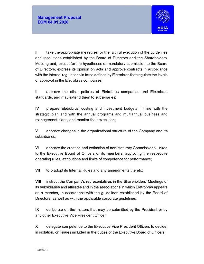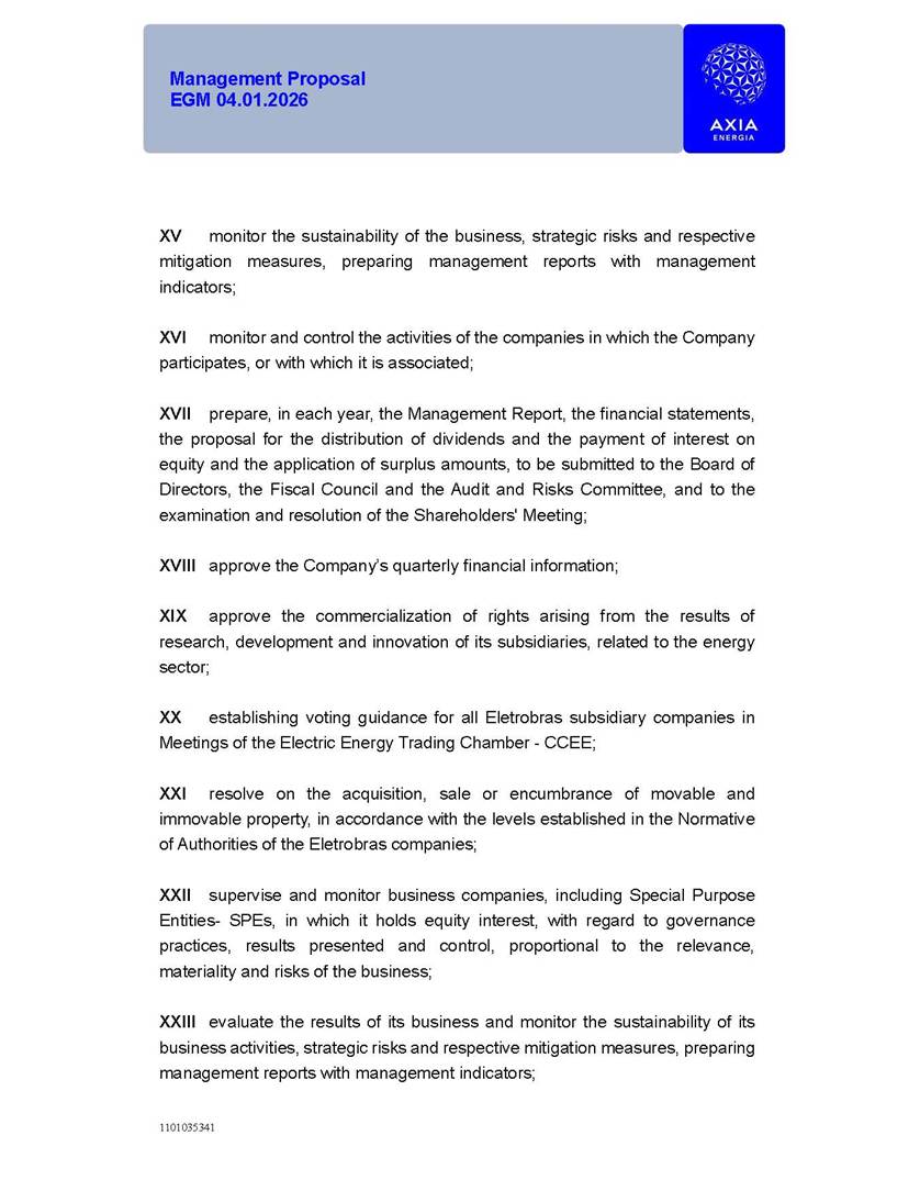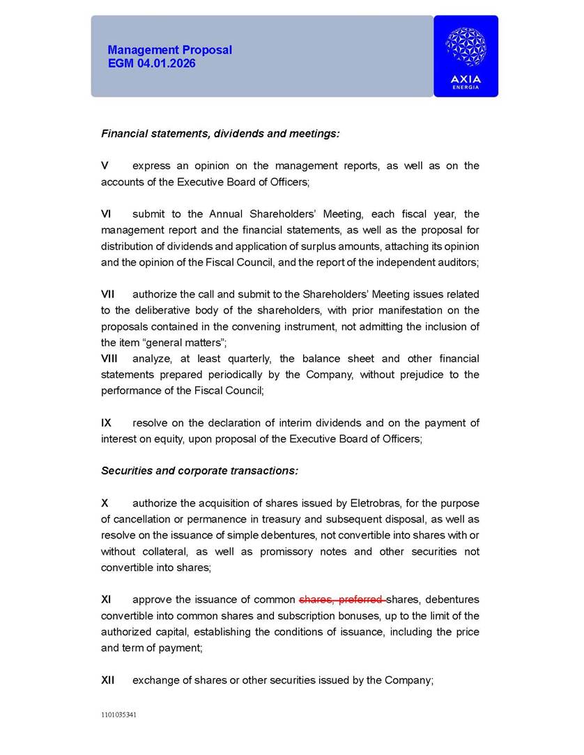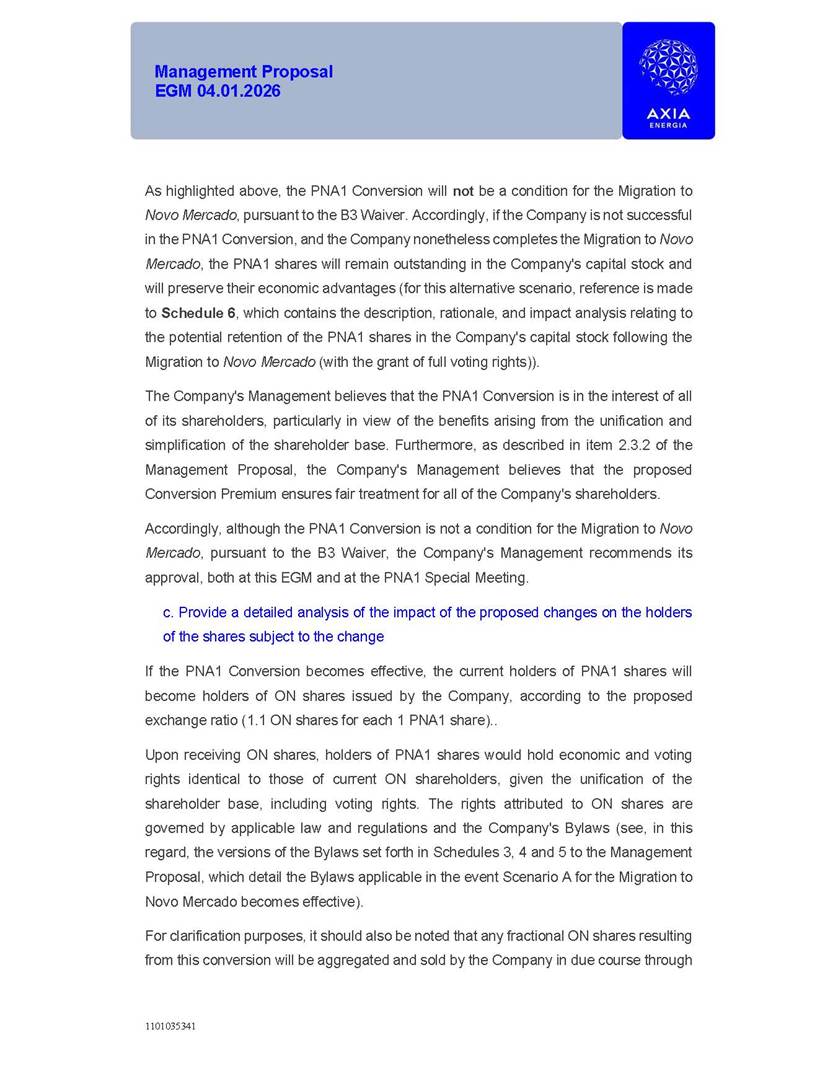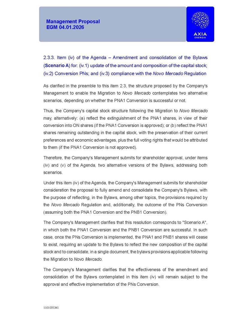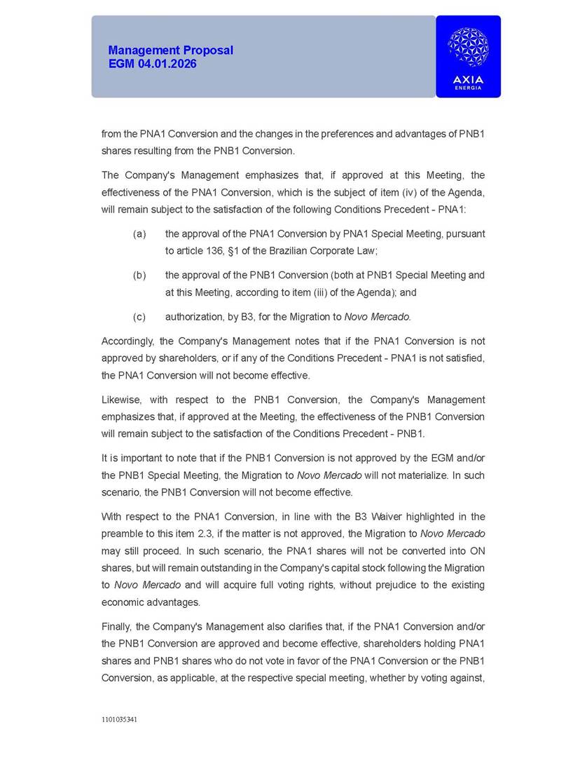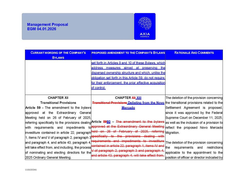 1101035341 Management Proposal EGM 04.01.2026 Management Proposal EGM 04.01.2026 1101035341 Management Proposal EGM 04.01.2026 Index 1. Manual for Participation ................................................................... 47 1.1. Introduction ...................................................................................... 47 1.2. Exclusively Digital Meeting .............................................................. 58 1.3. Remote Voting Ballot (BVD) ............................................................ 69 1.4. Required Documents ..................................................................... 812 1.5. Registration and Accreditation ..................................................... 1013 1.6. Declaration of Membership in a Group of Shareholders .............. 1215 2. Management Proposal .............................................................. 1417 2.1. General Guidelines ...................................................................... 1417 2.2. Agenda ........................................................................................ 1518 2.3. Clarifications on the agenda of the EGM ..................................... 1621 2.4. List of Schedules ......................................................................... 3344 2.5. Conclusion ................................................................................... 3545 SCHEDULE 1 ............................................................................................... 3646 SCHEDULE 2 ............................................................................................... 4259 SCHEDULE 3 ............................................................................................... 4664 SCHEDULE 4 ............................................................................................ 101119 SCHEDULE 5 ........................................................................................... 138157 SCHEDULE 6 ........................................................................................... 189208 SCHEDULE 7 ........................................................................................... 193212 SCHEDULE 8 ........................................................................................... 247266 SCHEDULE 9 ........................................................................................... 284304 1101035341 Management Proposal EGM 04.01.2026 1101035341 Management Proposal EGM 04.01.2026 1. Manual for Participation 1.1. Introduction The Management of CENTRAIS ELÉTRICAS BRASILEIRAS S.A. – Eletrobras, a corporation, headquartered in the City of Rio de Janeiro, State of Rio de Janeiro, at Avenida Graça Aranha, No. 26, Store A, Downtown, Zip code 20030-090, registered in the National Registry of Legal Entities (Cadastro Nacional de Pessoas Jurídicas) ("CNPJ") under No. 00.001.180/0001-26 ("Company" or "AXIA Energia"), with its bylaws filed with the Commercial Registry of the State of Rio de Janeiro (Junta Comercial do Estado do Rio de Janeiro) under NIRE 33.3.00346767, registered with the Brazilian Securities and Exchange Commission (Comissão de Valores Mobiliários) ("CVM") as a publicly-held company category "A" under the code 00243-7, with its securities currently admitted to trading on Level 1 of Corporate Governance of B3 S.A. – Brasil, Bolsa, Balcão ("B3"), pursuant to Brazilian Law No. 6,404, of 1976 ("Brazilian Corporate Law"), and CVM Resolution No. 81, of 2022 ("RCVM 81"), presents this Participation Manual, containing the information, documents and clarifications to guide the participation of shareholders at the Company's Extraordinary General Meeting, to be held exclusively digitally, on first call, on April 1, 2026, at 4 p.m., considering, therefore, to be held at the Company's headquarters ("Meeting" or "EGM" and "Manual", respectively), as well as the management proposal regarding the resolutions on the agenda, including the analysis of the matters submitted to the shareholders at the Meeting ("Management Proposal"). The Company's Management clarifies that, on this same date, it is also disclosing the call notice calling the Special Meeting of Class "A1" Preferred Shareholders ("PNA1") ("PNA1 Special Meeting") and the Special Meeting of Class "B1" Preferred Shareholders ("PNB1") ("PNB1 Special Meeting"), to be held, likewise, on April 1, 2026. As will be detailed in this Management Proposal, the PNA1 Special Meeting and the PNB1 Special Meeting are part of the context of this EGM, being held pursuant to and for the purposes of article 136, §1, of the Brazilian Corporate Law, given that the EGM agenda contemplates proposals for conversion of PNA1 and PNB1 shares. 1101035341 Management Proposal EGM 04.01.2026 1.2. Exclusively Digital Meeting The Meeting will be exclusively digital, to be held through the digital platform of "Atlas AGM" ("Digital Platform"). The exclusively digital format is intended to facilitate the participation of shareholders and others involved in the Meeting, pursuant to the Brazilian Corporate Law, RCVM 81 and the Company's Bylaws. Shareholders who wish to participate in the Meeting must register on the https://atlasagm.com website or through the "Atlas AGM" application available on the Apple Store and Google Play Store ("Application") and submit all documents necessary to qualify for participation or voting at the Meeting by 11:59 p.m. on March 30, 2026. The Digital Platform meets the requirements set forth in article 28, paragraph 1, items I to III, of RCVM 81 and the Meeting will be fully recorded. By accessing the Digital Platform and participating in the Meeting, the Admitted Shareholder (as defined below) authorizes the Company, and third parties authorized by the Company, to record and use the information, in accordance with applicable law. The recordings and related information will be used and processed by the Company for a period of five years, and may be used for the Company's de