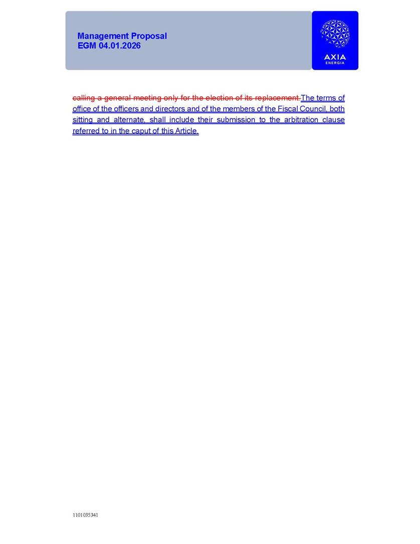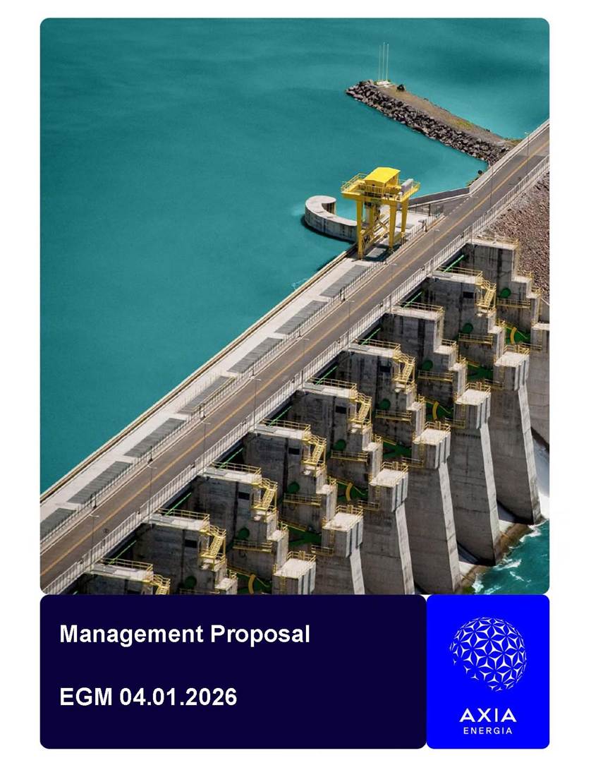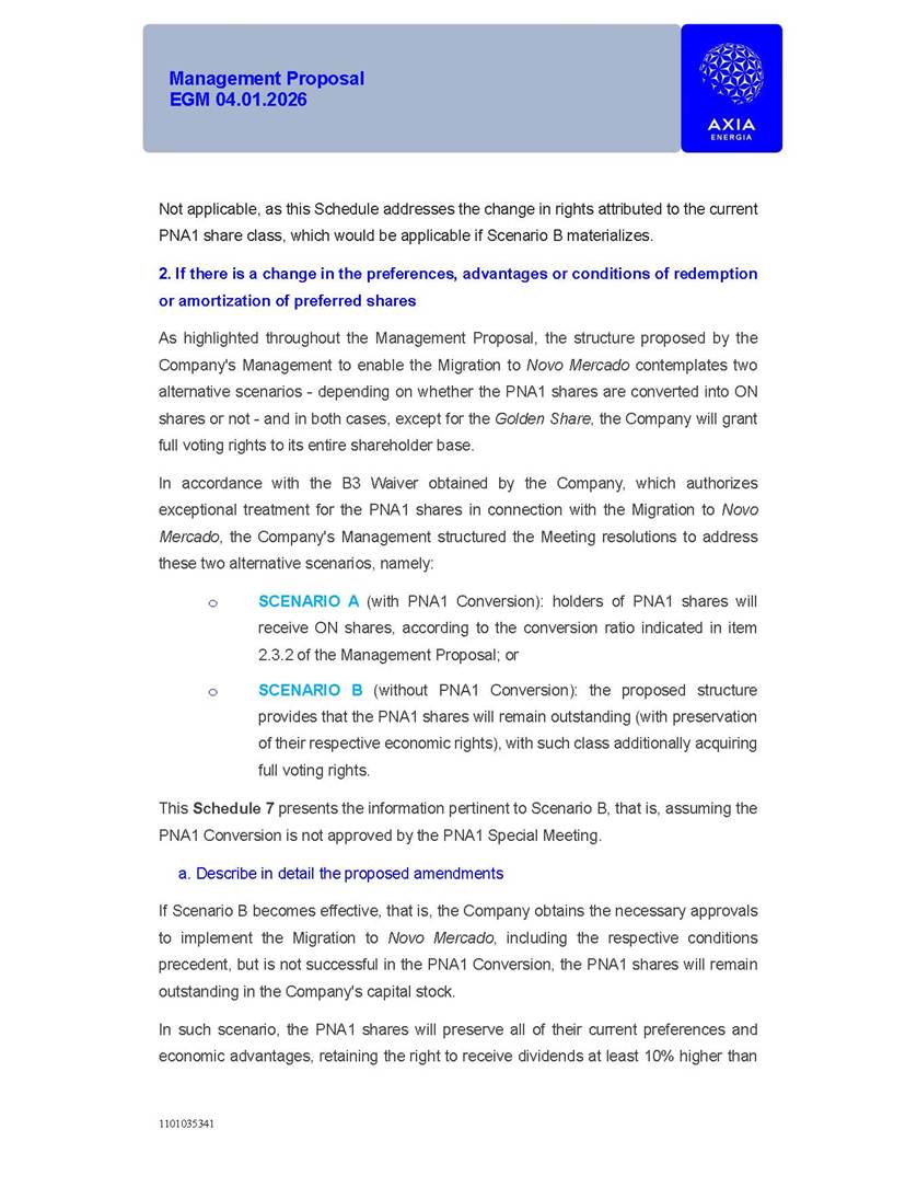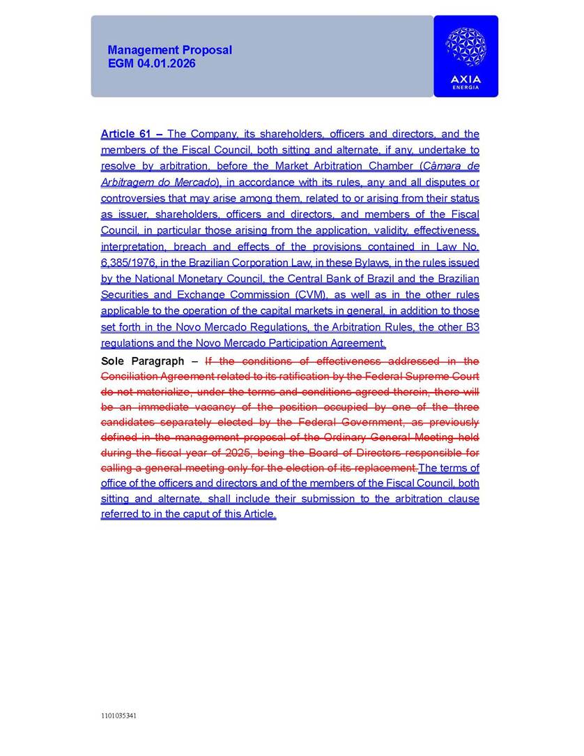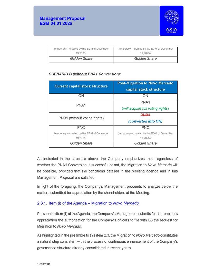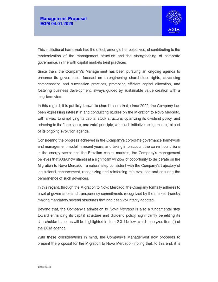 1101035341 Management Proposal EGM 04.01.2026 Management Proposal EGM 04.01.2026 1101035341 Management Proposal EGM 04.01.2026 Index 1. Manual for Participation ................................................................... 47 1.1. Introduction ...................................................................................... 47 1.2. Exclusively Digital Meeting .............................................................. 58 1.3. Remote Voting Ballot (BVD) ............................................................ 69 1.4. Required Documents ..................................................................... 812 1.5. Registration and Accreditation ..................................................... 1013 1.6. Declaration of Membership in a Group of Shareholders .............. 1215 2. Management Proposal .............................................................. 1417 2.1. General Guidelines ...................................................................... 1417 2.2. Agenda ........................................................................................ 1518 2.3. Clarifications on the agenda of the EGM ..................................... 1621 2.4. List of Schedules ......................................................................... 3344 2.5. Conclusion ................................................................................... 3545 SCHEDULE 1 ............................................................................................... 3646 SCHEDULE 2 ............................................................................................... 4259 SCHEDULE 3 ............................................................................................... 4664 SCHEDULE 4 ............................................................................................ 101119 SCHEDULE 5 ........................................................................................... 138157 SCHEDULE 6 ........................................................................................... 189208 SCHEDULE 7 ........................................................................................... 193212 SCHEDULE 8 ........................................................................................... 247266 SCHEDULE 9 ........................................................................................... 284304 1101035341 Management Proposal EGM 04.01.2026 1101035341 Management Proposal EGM 04.01.2026 1. Manual for Participation 1.1. Introduction The Management of CENTRAIS ELÉTRICAS BRASILEIRAS S.A. – Eletrobras, a corporation, headquartered in the City of Rio de Janeiro, State of Rio de Janeiro, at Avenida Graça Aranha, No. 26, Store A, Downtown, Zip code 20030-090, registered in the National Registry of Legal Entities (Cadastro Nacional de Pessoas Jurídicas) ("CNPJ") under No. 00.001.180/0001-26 ("Company" or "AXIA Energia"), with its bylaws filed with the Commercial Registry of the State of Rio de Janeiro (Junta Comercial do Estado do Rio de Janeiro) under NIRE 33.3.00346767, registered with the Brazilian Securities and Exchange Commission (Comissão de Valores Mobiliários) ("CVM") as a publicly-held company category "A" under the code 00243-7, with its securities currently admitted to trading on Level 1 of Corporate Governance of B3 S.A. – Brasil, Bolsa, Balcão ("B3"), pursuant to Brazilian Law No. 6,404, of 1976 ("Brazilian Corporate Law"), and CVM Resolution No. 81, of 2022 ("RCVM 81"), presents this Participation Manual, containing the information, documents and clarifications to guide the participation of shareholders at the Company's Extraordinary General Meeting, to be held exclusively digitally, on first call, on April 1, 2026, at 4 p.m., considering, therefore, to be held at the Company's headquarters ("Meeting" or "EGM" and "Manual", respectively), as well as the management proposal regarding the resolutions on the agenda, including the analysis of the matters submitted to the shareholders at the Meeting ("Management Proposal"). The Company's Management clarifies that, on this same date, it is also disclosing the call notice calling the Special Meeting of Class "A1" Preferred Shareholders ("PNA1") ("PNA1 Special Meeting") and the Special Meeting of Class "B1" Preferred Shareholders ("PNB1") ("PNB1 Special Meeting"), to be held, likewise, on April 1, 2026. As will be detailed in this Management Proposal, the PNA1 Special Meeting and the PNB1 Special Meeting are part of the context of this EGM, being held pursuant to and for the purposes of article 136, §1, of the Brazilian Corporate Law, given that the EGM agenda contemplates proposals for conversion of PNA1 and PNB1 shares. 1101035341 Management Proposal EGM 04.01.2026 1.2. Exclusively Digital Meeting The Meeting will be exclusively digital, to be held through the digital platform of "Atlas AGM" ("Digital Platform"). The exclusively digital format is intended to facilitate the participation of shareholders and others involved in the Meeting, pursuant to the Brazilian Corporate Law, RCVM 81 and the Company's Bylaws. Shareholders who wish to participate in the Meeting must register on the https://atlasagm.com website or through the "Atlas AGM" application available on the Apple Store and Google Play Store ("Application") and submit all documents necessary to qualify for participation or voting at the Meeting by 11:59 p.m. on March 30, 2026. The Digital Platform meets the requirements set forth in article 28, paragraph 1, items I to III, of RCVM 81 and the Meeting will be fully recorded. By accessing the Digital Platform and participating in the Meeting, the Admitted Shareholder (as defined below) authorizes the Company, and third parties authorized by the Company, to record and use the information, in accordance with applicable law. The recordings and related information will be used and processed by the Company for a period of five years, and may be used for the Company's de