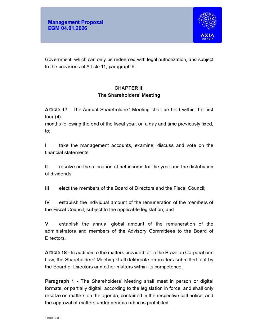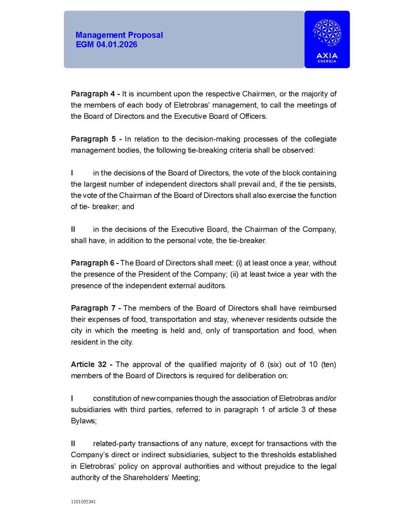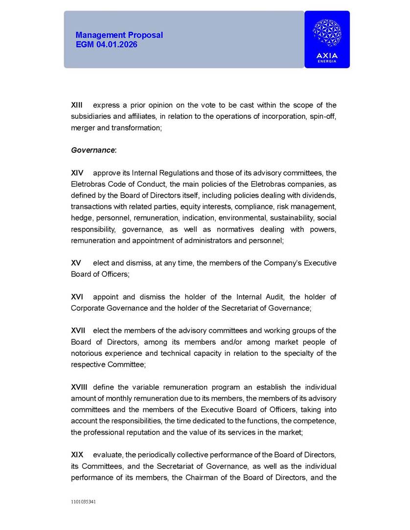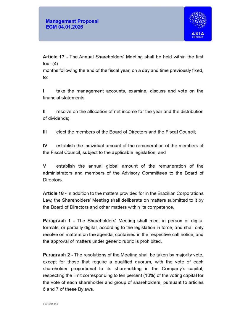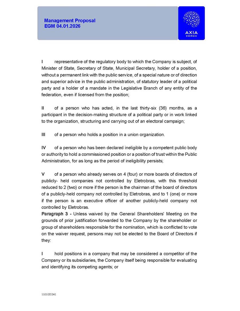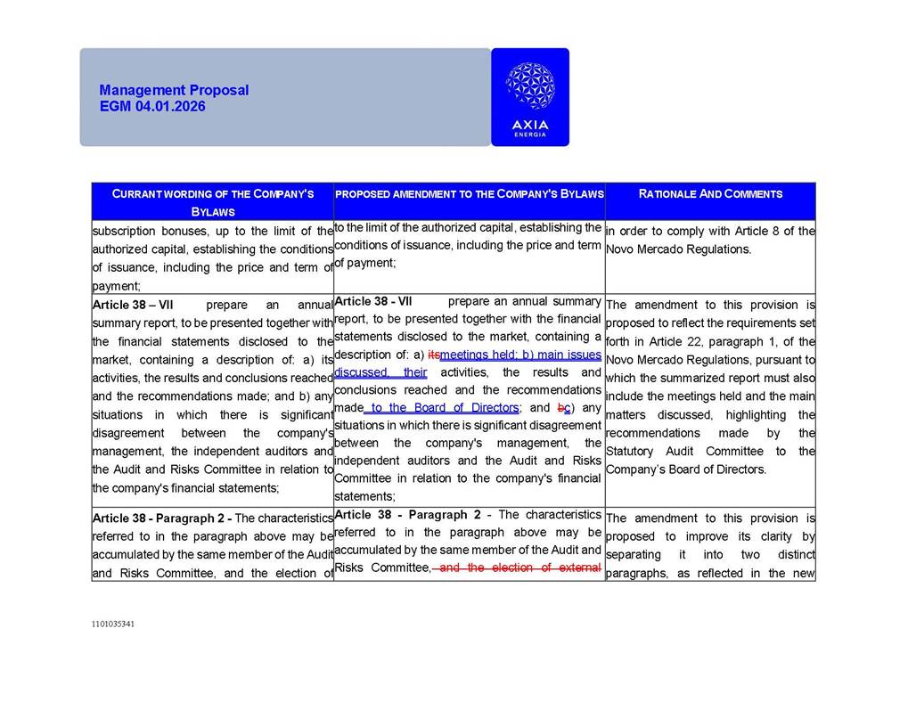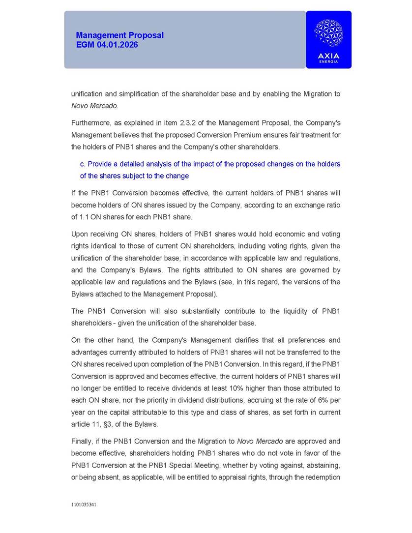 1101035341 Management Proposal EGM 04.01.2026 Management Proposal EGM 04.01.2026 1101035341 Management Proposal EGM 04.01.2026 Index 1. Manual for Participation ................................................................... 47 1.1. Introduction ...................................................................................... 47 1.2. Exclusively Digital Meeting .............................................................. 58 1.3. Remote Voting Ballot (BVD) ............................................................ 69 1.4. Required Documents ..................................................................... 812 1.5. Registration and Accreditation ..................................................... 1013 1.6. Declaration of Membership in a Group of Shareholders .............. 1215 2. Management Proposal .............................................................. 1417 2.1. General Guidelines ...................................................................... 1417 2.2. Agenda ........................................................................................ 1518 2.3. Clarifications on the agenda of the EGM ..................................... 1621 2.4. List of Schedules ......................................................................... 3344 2.5. Conclusion ................................................................................... 3545 SCHEDULE 1 ............................................................................................... 3646 SCHEDULE 2 ............................................................................................... 4259 SCHEDULE 3 ............................................................................................... 4664 SCHEDULE 4 ............................................................................................ 101119 SCHEDULE 5 ........................................................................................... 138157 SCHEDULE 6 ........................................................................................... 189208 SCHEDULE 7 ........................................................................................... 193212 SCHEDULE 8 ........................................................................................... 247266 SCHEDULE 9 ........................................................................................... 284304 1101035341 Management Proposal EGM 04.01.2026 1101035341 Management Proposal EGM 04.01.2026 1. Manual for Participation 1.1. Introduction The Management of CENTRAIS ELÉTRICAS BRASILEIRAS S.A. – Eletrobras, a corporation, headquartered in the City of Rio de Janeiro, State of Rio de Janeiro, at Avenida Graça Aranha, No. 26, Store A, Downtown, Zip code 20030-090, registered in the National Registry of Legal Entities (Cadastro Nacional de Pessoas Jurídicas) ("CNPJ") under No. 00.001.180/0001-26 ("Company" or "AXIA Energia"), with its bylaws filed with the Commercial Registry of the State of Rio de Janeiro (Junta Comercial do Estado do Rio de Janeiro) under NIRE 33.3.00346767, registered with the Brazilian Securities and Exchange Commission (Comissão de Valores Mobiliários) ("CVM") as a publicly-held company category "A" under the code 00243-7, with its securities currently admitted to trading on Level 1 of Corporate Governance of B3 S.A. – Brasil, Bolsa, Balcão ("B3"), pursuant to Brazilian Law No. 6,404, of 1976 ("Brazilian Corporate Law"), and CVM Resolution No. 81, of 2022 ("RCVM 81"), presents this Participation Manual, containing the information, documents and clarifications to guide the participation of shareholders at the Company's Extraordinary General Meeting, to be held exclusively digitally, on first call, on April 1, 2026, at 4 p.m., considering, therefore, to be held at the Company's headquarters ("Meeting" or "EGM" and "Manual", respectively), as well as the management proposal regarding the resolutions on the agenda, including the analysis of the matters submitted to the shareholders at the Meeting ("Management Proposal"). The Company's Management clarifies that, on this same date, it is also disclosing the call notice calling the Special Meeting of Class "A1" Preferred Shareholders ("PNA1") ("PNA1 Special Meeting") and the Special Meeting of Class "B1" Preferred Shareholders ("PNB1") ("PNB1 Special Meeting"), to be held, likewise, on April 1, 2026. As will be detailed in this Management Proposal, the PNA1 Special Meeting and the PNB1 Special Meeting are part of the context of this EGM, being held pursuant to and for the purposes of article 136, §1, of the Brazilian Corporate Law, given that the EGM agenda contemplates proposals for conversion of PNA1 and PNB1 shares. 1101035341 Management Proposal EGM 04.01.2026 1.2. Exclusively Digital Meeting The Meeting will be exclusively digital, to be held through the digital platform of "Atlas AGM" ("Digital Platform"). The exclusively digital format is intended to facilitate the participation of shareholders and others involved in the Meeting, pursuant to the Brazilian Corporate Law, RCVM 81 and the Company's Bylaws. Shareholders who wish to participate in the Meeting must register on the https://atlasagm.com website or through the "Atlas AGM" application available on the Apple Store and Google Play Store ("Application") and submit all documents necessary to qualify for participation or voting at the Meeting by 11:59 p.m. on March 30, 2026. The Digital Platform meets the requirements set forth in article 28, paragraph 1, items I to III, of RCVM 81 and the Meeting will be fully recorded. By accessing the Digital Platform and participating in the Meeting, the Admitted Shareholder (as defined below) authorizes the Company, and third parties authorized by the Company, to record and use the information, in accordance with applicable law. The recordings and related information will be used and processed by the Company for a period of five years, and may be used for the Company's de