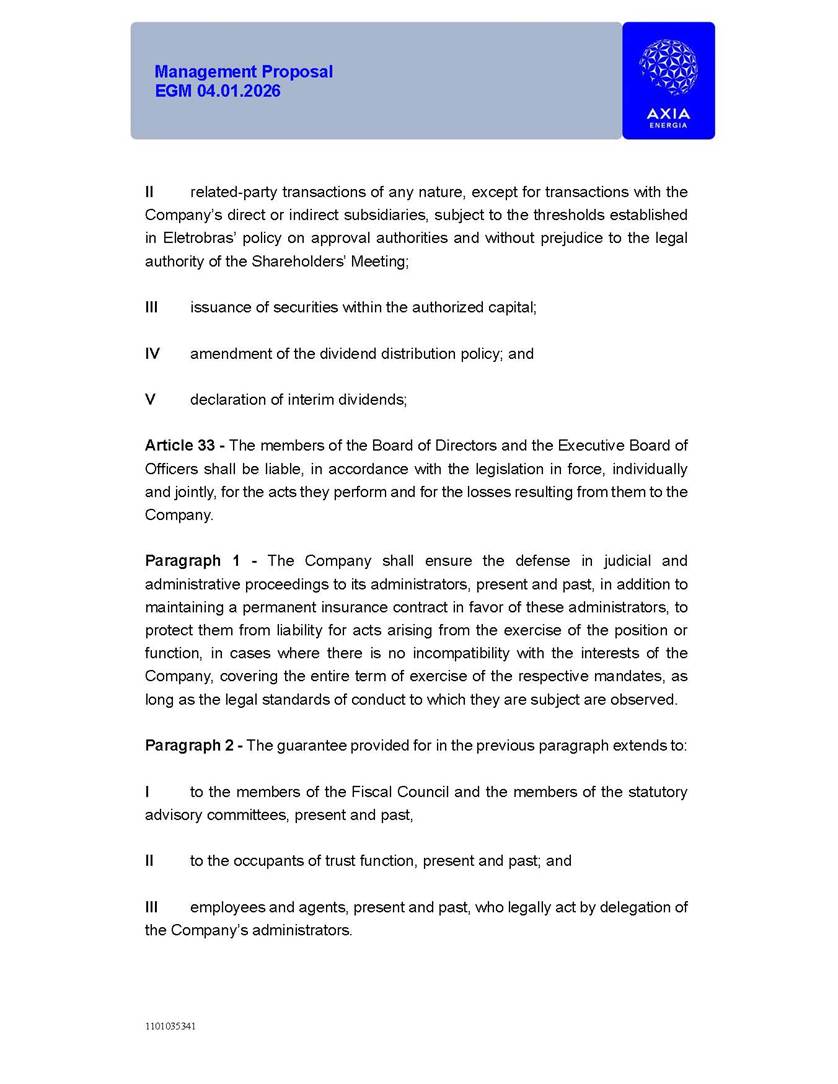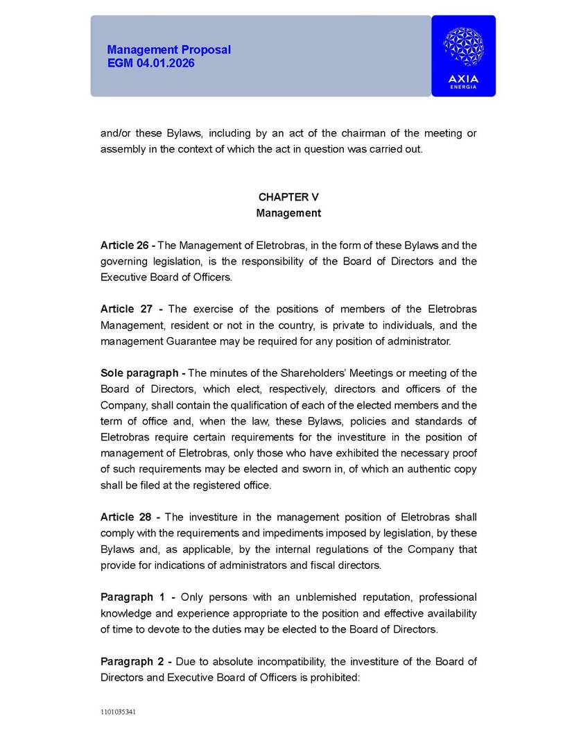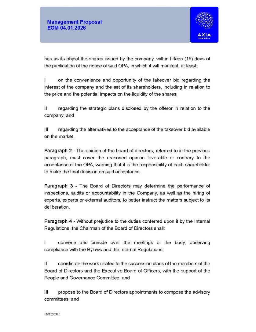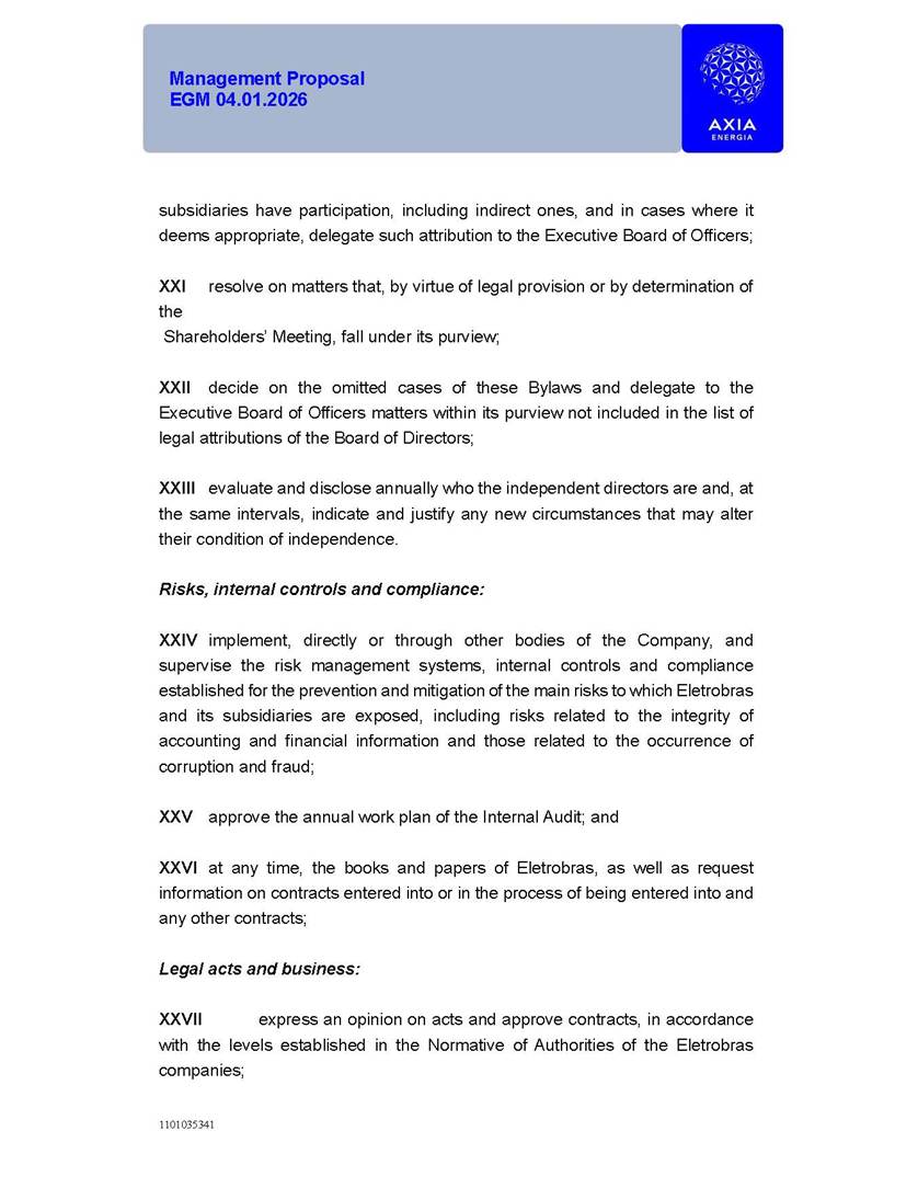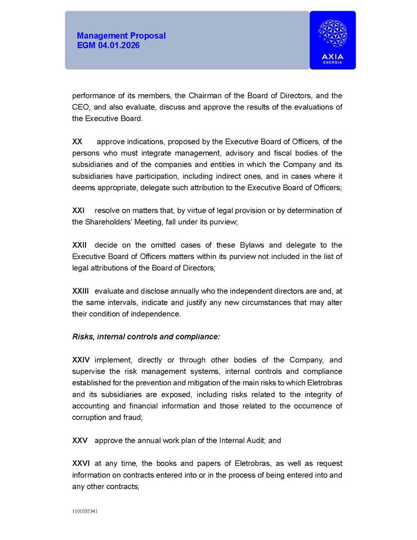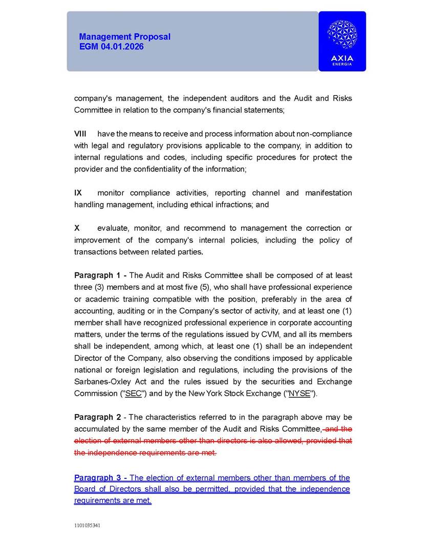 1101035341 Management Proposal EGM 04.01.2026 Management Proposal EGM 04.01.2026 1101035341 Management Proposal EGM 04.01.2026 Index 1. Manual for Participation ................................................................... 47 1.1. Introduction ...................................................................................... 47 1.2. Exclusively Digital Meeting .............................................................. 58 1.3. Remote Voting Ballot (BVD) ............................................................ 69 1.4. Required Documents ..................................................................... 812 1.5. Registration and Accreditation ..................................................... 1013 1.6. Declaration of Membership in a Group of Shareholders .............. 1215 2. Management Proposal .............................................................. 1417 2.1. General Guidelines ...................................................................... 1417 2.2. Agenda ........................................................................................ 1518 2.3. Clarifications on the agenda of the EGM ..................................... 1621 2.4. List of Schedules ......................................................................... 3344 2.5. Conclusion ................................................................................... 3545 SCHEDULE 1 ............................................................................................... 3646 SCHEDULE 2 ............................................................................................... 4259 SCHEDULE 3 ............................................................................................... 4664 SCHEDULE 4 ............................................................................................ 101119 SCHEDULE 5 ........................................................................................... 138157 SCHEDULE 6 ........................................................................................... 189208 SCHEDULE 7 ........................................................................................... 193212 SCHEDULE 8 ........................................................................................... 247266 SCHEDULE 9 ........................................................................................... 284304 1101035341 Management Proposal EGM 04.01.2026 1101035341 Management Proposal EGM 04.01.2026 1. Manual for Participation 1.1. Introduction The Management of CENTRAIS ELÉTRICAS BRASILEIRAS S.A. – Eletrobras, a corporation, headquartered in the City of Rio de Janeiro, State of Rio de Janeiro, at Avenida Graça Aranha, No. 26, Store A, Downtown, Zip code 20030-090, registered in the National Registry of Legal Entities (Cadastro Nacional de Pessoas Jurídicas) ("CNPJ") under No. 00.001.180/0001-26 ("Company" or "AXIA Energia"), with its bylaws filed with the Commercial Registry of the State of Rio de Janeiro (Junta Comercial do Estado do Rio de Janeiro) under NIRE 33.3.00346767, registered with the Brazilian Securities and Exchange Commission (Comissão de Valores Mobiliários) ("CVM") as a publicly-held company category "A" under the code 00243-7, with its securities currently admitted to trading on Level 1 of Corporate Governance of B3 S.A. – Brasil, Bolsa, Balcão ("B3"), pursuant to Brazilian Law No. 6,404, of 1976 ("Brazilian Corporate Law"), and CVM Resolution No. 81, of 2022 ("RCVM 81"), presents this Participation Manual, containing the information, documents and clarifications to guide the participation of shareholders at the Company's Extraordinary General Meeting, to be held exclusively digitally, on first call, on April 1, 2026, at 4 p.m., considering, therefore, to be held at the Company's headquarters ("Meeting" or "EGM" and "Manual", respectively), as well as the management proposal regarding the resolutions on the agenda, including the analysis of the matters submitted to the shareholders at the Meeting ("Management Proposal"). The Company's Management clarifies that, on this same date, it is also disclosing the call notice calling the Special Meeting of Class "A1" Preferred Shareholders ("PNA1") ("PNA1 Special Meeting") and the Special Meeting of Class "B1" Preferred Shareholders ("PNB1") ("PNB1 Special Meeting"), to be held, likewise, on April 1, 2026. As will be detailed in this Management Proposal, the PNA1 Special Meeting and the PNB1 Special Meeting are part of the context of this EGM, being held pursuant to and for the purposes of article 136, §1, of the Brazilian Corporate Law, given that the EGM agenda contemplates proposals for conversion of PNA1 and PNB1 shares. 1101035341 Management Proposal EGM 04.01.2026 1.2. Exclusively Digital Meeting The Meeting will be exclusively digital, to be held through the digital platform of "Atlas AGM" ("Digital Platform"). The exclusively digital format is intended to facilitate the participation of shareholders and others involved in the Meeting, pursuant to the Brazilian Corporate Law, RCVM 81 and the Company's Bylaws. Shareholders who wish to participate in the Meeting must register on the https://atlasagm.com website or through the "Atlas AGM" application available on the Apple Store and Google Play Store ("Application") and submit all documents necessary to qualify for participation or voting at the Meeting by 11:59 p.m. on March 30, 2026. The Digital Platform meets the requirements set forth in article 28, paragraph 1, items I to III, of RCVM 81 and the Meeting will be fully recorded. By accessing the Digital Platform and participating in the Meeting, the Admitted Shareholder (as defined below) authorizes the Company, and third parties authorized by the Company, to record and use the information, in accordance with applicable law. The recordings and related information will be used and processed by the Company for a period of five years, and may be used for the Company's de