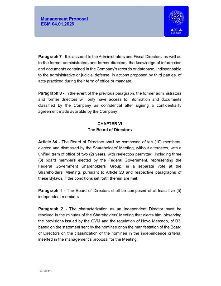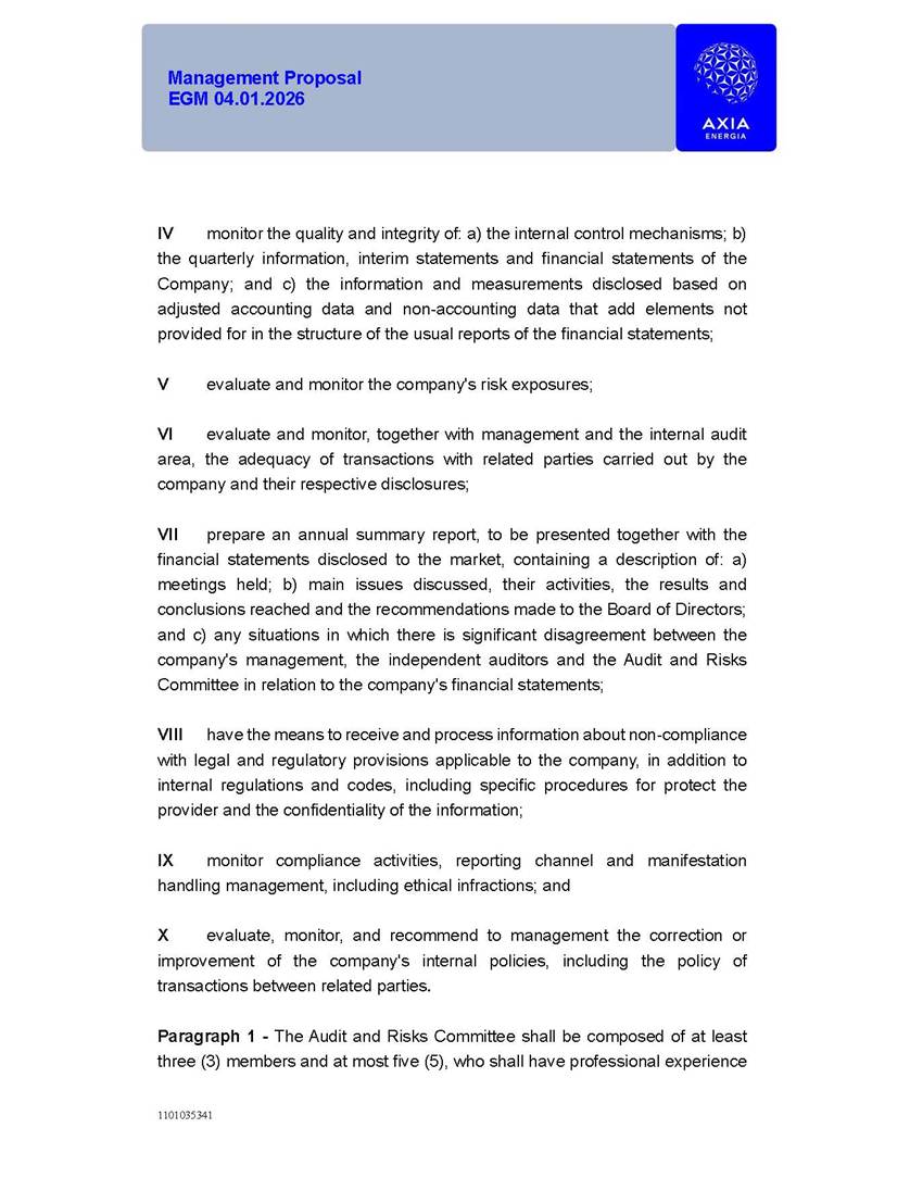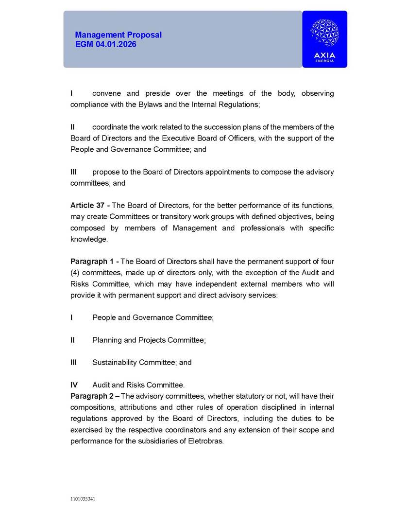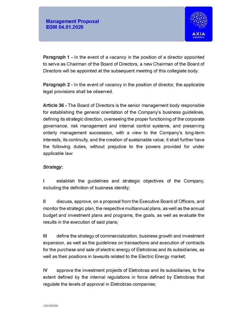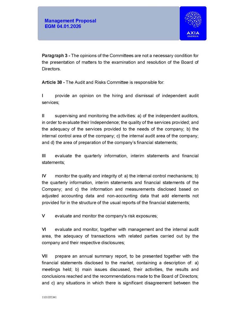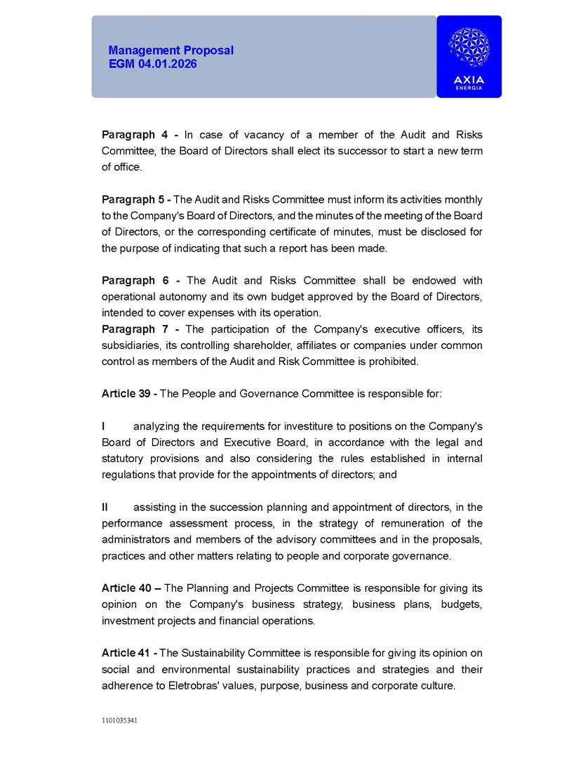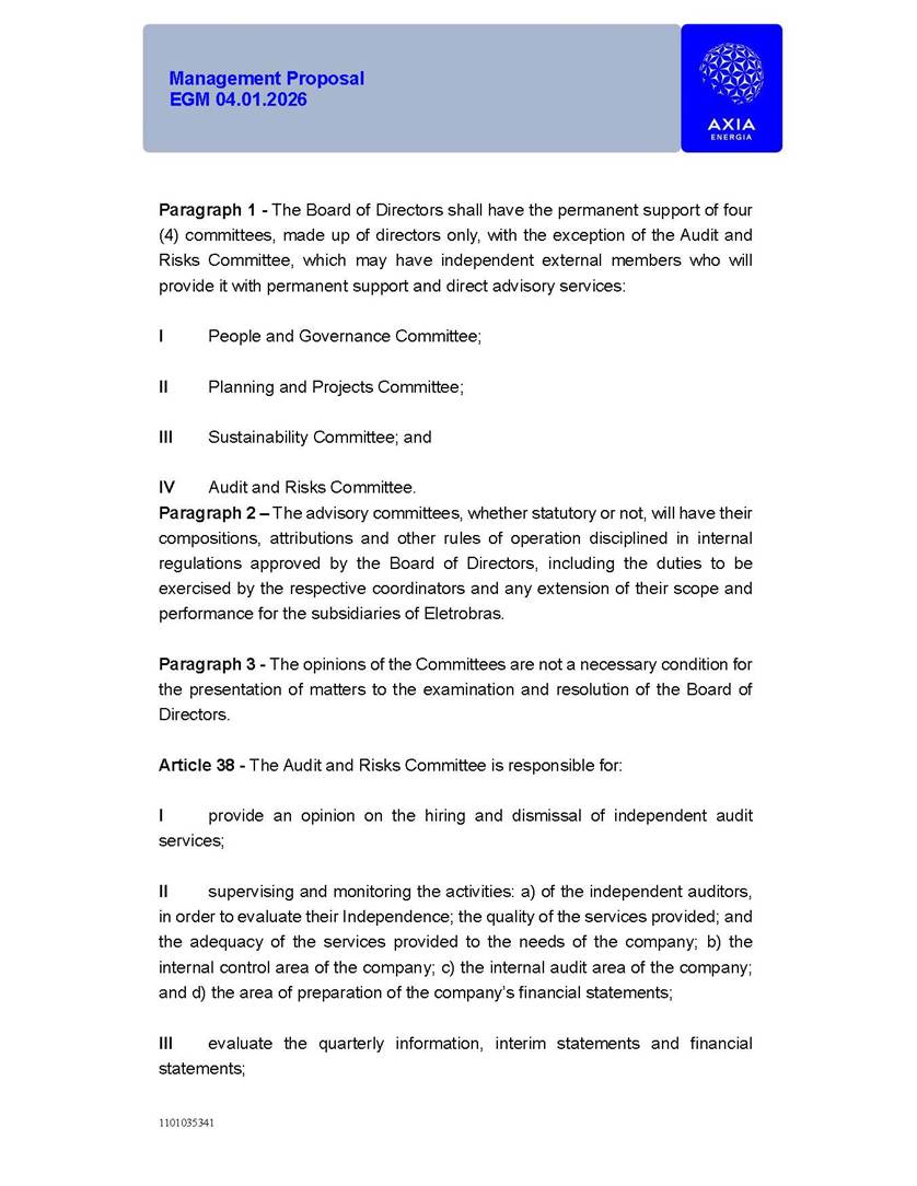 1101035341 Management Proposal EGM 04.01.2026 Management Proposal EGM 04.01.2026 1101035341 Management Proposal EGM 04.01.2026 Index 1. Manual for Participation ................................................................... 47 1.1. Introduction ...................................................................................... 47 1.2. Exclusively Digital Meeting .............................................................. 58 1.3. Remote Voting Ballot (BVD) ............................................................ 69 1.4. Required Documents ..................................................................... 812 1.5. Registration and Accreditation ..................................................... 1013 1.6. Declaration of Membership in a Group of Shareholders .............. 1215 2. Management Proposal .............................................................. 1417 2.1. General Guidelines ...................................................................... 1417 2.2. Agenda ........................................................................................ 1518 2.3. Clarifications on the agenda of the EGM ..................................... 1621 2.4. List of Schedules ......................................................................... 3344 2.5. Conclusion ................................................................................... 3545 SCHEDULE 1 ............................................................................................... 3646 SCHEDULE 2 ............................................................................................... 4259 SCHEDULE 3 ............................................................................................... 4664 SCHEDULE 4 ............................................................................................ 101119 SCHEDULE 5 ........................................................................................... 138157 SCHEDULE 6 ........................................................................................... 189208 SCHEDULE 7 ........................................................................................... 193212 SCHEDULE 8 ........................................................................................... 247266 SCHEDULE 9 ........................................................................................... 284304 1101035341 Management Proposal EGM 04.01.2026 1101035341 Management Proposal EGM 04.01.2026 1. Manual for Participation 1.1. Introduction The Management of CENTRAIS ELÉTRICAS BRASILEIRAS S.A. – Eletrobras, a corporation, headquartered in the City of Rio de Janeiro, State of Rio de Janeiro, at Avenida Graça Aranha, No. 26, Store A, Downtown, Zip code 20030-090, registered in the National Registry of Legal Entities (Cadastro Nacional de Pessoas Jurídicas) ("CNPJ") under No. 00.001.180/0001-26 ("Company" or "AXIA Energia"), with its bylaws filed with the Commercial Registry of the State of Rio de Janeiro (Junta Comercial do Estado do Rio de Janeiro) under NIRE 33.3.00346767, registered with the Brazilian Securities and Exchange Commission (Comissão de Valores Mobiliários) ("CVM") as a publicly-held company category "A" under the code 00243-7, with its securities currently admitted to trading on Level 1 of Corporate Governance of B3 S.A. – Brasil, Bolsa, Balcão ("B3"), pursuant to Brazilian Law No. 6,404, of 1976 ("Brazilian Corporate Law"), and CVM Resolution No. 81, of 2022 ("RCVM 81"), presents this Participation Manual, containing the information, documents and clarifications to guide the participation of shareholders at the Company's Extraordinary General Meeting, to be held exclusively digitally, on first call, on April 1, 2026, at 4 p.m., considering, therefore, to be held at the Company's headquarters ("Meeting" or "EGM" and "Manual", respectively), as well as the management proposal regarding the resolutions on the agenda, including the analysis of the matters submitted to the shareholders at the Meeting ("Management Proposal"). The Company's Management clarifies that, on this same date, it is also disclosing the call notice calling the Special Meeting of Class "A1" Preferred Shareholders ("PNA1") ("PNA1 Special Meeting") and the Special Meeting of Class "B1" Preferred Shareholders ("PNB1") ("PNB1 Special Meeting"), to be held, likewise, on April 1, 2026. As will be detailed in this Management Proposal, the PNA1 Special Meeting and the PNB1 Special Meeting are part of the context of this EGM, being held pursuant to and for the purposes of article 136, §1, of the Brazilian Corporate Law, given that the EGM agenda contemplates proposals for conversion of PNA1 and PNB1 shares. 1101035341 Management Proposal EGM 04.01.2026 1.2. Exclusively Digital Meeting The Meeting will be exclusively digital, to be held through the digital platform of "Atlas AGM" ("Digital Platform"). The exclusively digital format is intended to facilitate the participation of shareholders and others involved in the Meeting, pursuant to the Brazilian Corporate Law, RCVM 81 and the Company's Bylaws. Shareholders who wish to participate in the Meeting must register on the https://atlasagm.com website or through the "Atlas AGM" application available on the Apple Store and Google Play Store ("Application") and submit all documents necessary to qualify for participation or voting at the Meeting by 11:59 p.m. on March 30, 2026. The Digital Platform meets the requirements set forth in article 28, paragraph 1, items I to III, of RCVM 81 and the Meeting will be fully recorded. By accessing the Digital Platform and participating in the Meeting, the Admitted Shareholder (as defined below) authorizes the Company, and third parties authorized by the Company, to record and use the information, in accordance with applicable law. The recordings and related information will be used and processed by the Company for a period of five years, and may be used for the Company's de