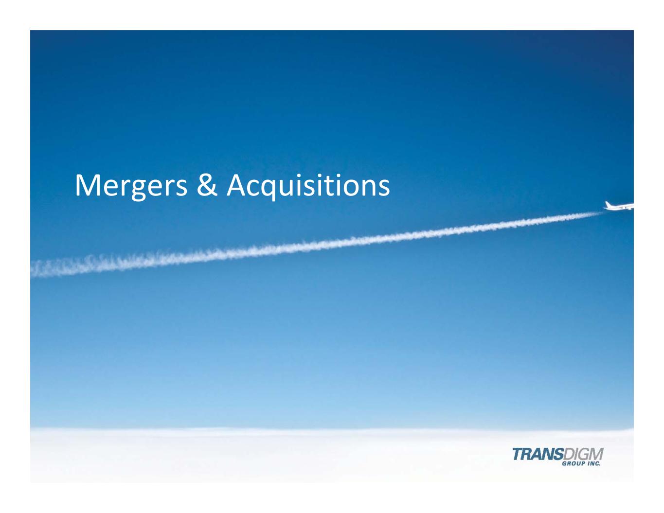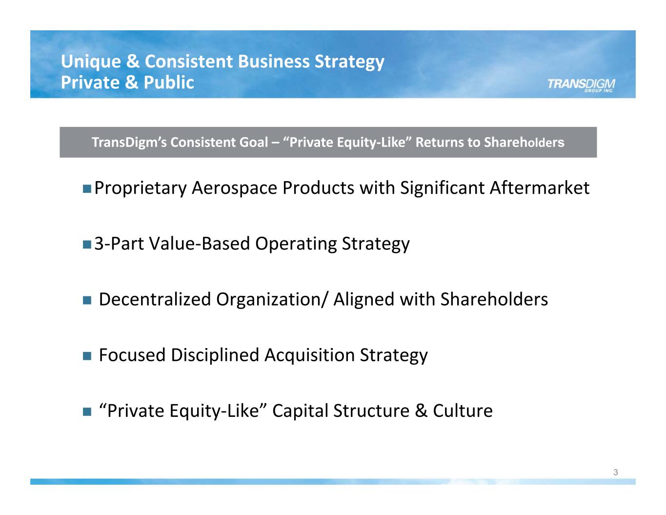 Unique & Consistent Business Strategy Private & Public 3 Proprietary Aerospace Products with Significant Aftermarket 3‐Part Value‐Based Operating Strategy Decentralized Organization/ Aligned with Shareholders Focused Disciplined Acquisition Strategy “Private Equity‐Like” Capital Structure & Culture TransDigm’s Consistent Goal – “Private Equity‐Like” Returns to Shareholders