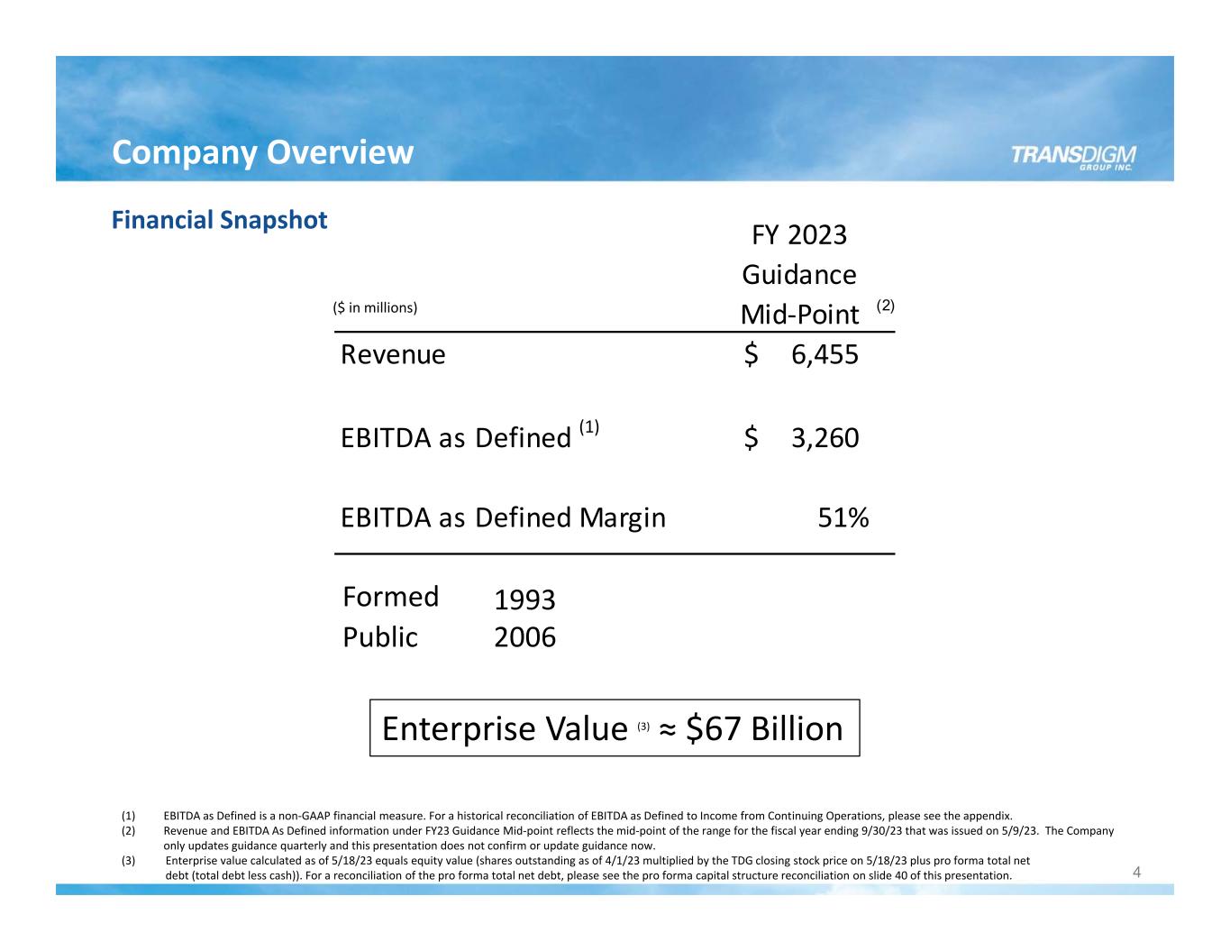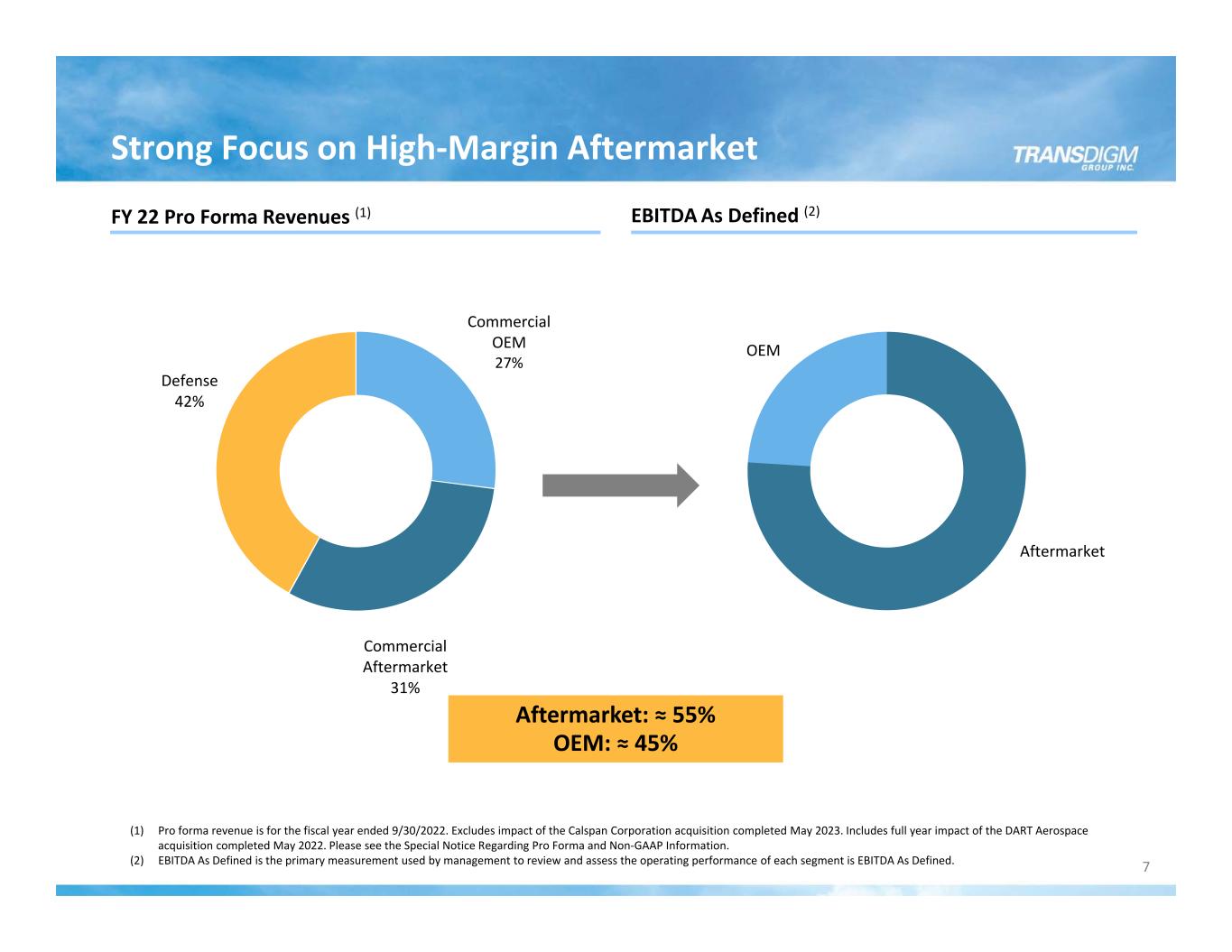 FORWARD LOOKING STATEMENTS This presentation contains forward‐looking statements within the meaning of the Private Securities Litigation Reform Act of 1995, including information regarding our guidance for future periods. These forward‐looking statements are based on management’s current expectations and beliefs, as well as a number of assumptions concerning future events, many of which are outside of our control. Consequently, such forward looking statements should be regarded solely as our current plans, estimates and beliefs. These statements are subject to risks and uncertainties that could cause actual results to differ materially from those expressed or implied in the forward‐looking statement. The Company does not undertake, and specifically declines, any obligation, to publicly release the results of any revisions to these forward‐looking statements that may be made to reflect any future events or circumstances after the date of such statements or to reflect the occurrence of anticipated or unanticipated events. All forward –looking statements attributable to the Company or persons acting on its behalf are expressly qualified in their entirety by these cautionary statements. These risks and uncertainties include but are not limited to: the impact that the COVID‐19 pandemic has on our business, results of operations, financial condition and liquidity; the sensitivity of our business to the number of flight hours that our customers’ planes spend aloft and our customers’ profitability, both of which are affected by general economic conditions; current and future geopolitical or other worldwide events; cyber‐security threats, natural disasters and climate change‐related events; our reliance on certain customers; the U.S. defense budget and risks associated with being a government supplier, including government audits and investigations; failure to maintain government or industry approvals; failure to complete or successfully integrate acquisitions; our indebtedness; potential environmental liabilities; liabilities arising in connection with litigation; climate‐related regulations; increases in raw material costs, taxes and labor costs that cannot be recovered in product pricing; risks and costs associated with our international sales and operations; and other risk factors. Further information regarding the important factors that could cause actual results to differ materially from projected results can be found in TransDigm Group’s Annual Report on Form 10‐K for the fiscal year ended September 30, 2022 and other reports that TransDigm Group or its subsidiaries have filed with the Securities and Exchange Commission. You are cautioned not to place undue reliance on our forward‐looking statements. TransDigm Group Incorporated assumes no obligation to, and expressly disclaims any obligation to, update or revise any forward‐looking statements, whether as a result of new information, future events or otherwise. 1 SPECIAL NOTICE REGARDING PRO FORMA AND NON‐GAAP INFORMATION This presentation sets forth certain pro forma financial information. This pro forma financial information gives effect to certain recently completed acquisitions. Such pro forma information is based on certain assumptions and adjustments and does not purport to present TransDigm's actual results of operations or financial condition had the transactions reflected in such pro forma financial information occurred at the beginning of the relevant period, in the case of income statement information, or at the end of such period, in the case of balance sheet information, nor is it necessarily indicative of the results of operations that may be achieved in the future. This presentation also sets forth certain non‐GAAP financial measures. A presentation of the most directly comparable GAAP measures and a reconciliation to such measures are set forth in the appendix. Forward Looking Statements & Special Notice Regarding Pro Forma and Non‐GAAP Information