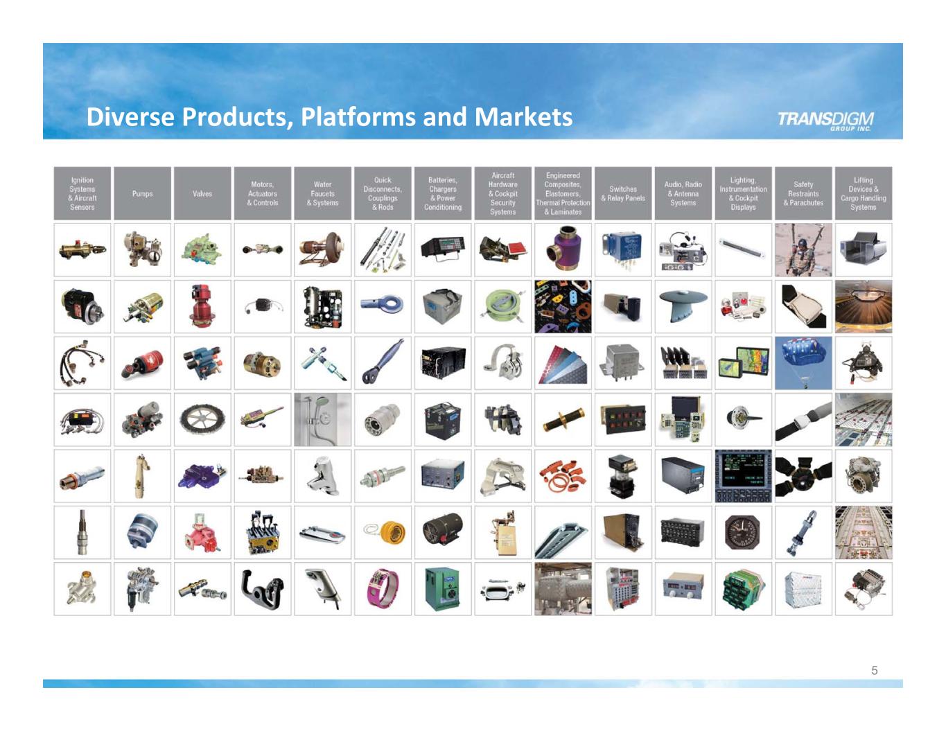 Company Overview 4 FY 2023 Guidance Mid‐Point (2) Revenue 6,455$ EBITDA as Defined (1) 3,260$ EBITDA as Defined Margin 51% ($ in millions) Financial Snapshot (1) EBITDA as Defined is a non‐GAAP financial measure. For a historical reconciliation of EBITDA as Defined to Income from Continuing Operations, please see the appendix. (2) Revenue and EBITDA As Defined information under FY23 Guidance Mid‐point reflects the mid‐point of the range for the fiscal year ending 9/30/23 that was issued on 5/9/23. The Company only updates guidance quarterly and this presentation does not confirm or update guidance now. (3) Enterprise value calculated as of 5/18/23 equals equity value (shares outstanding as of 4/1/23 multiplied by the TDG closing stock price on 5/18/23 plus pro forma total net debt (total debt less cash)). For a reconciliation of the pro forma total net debt, please see the pro forma capital structure reconciliation on slide 40 of this presentation. Formed Public 1993 2006 Enterprise Value (3) ≈ $67 Billion