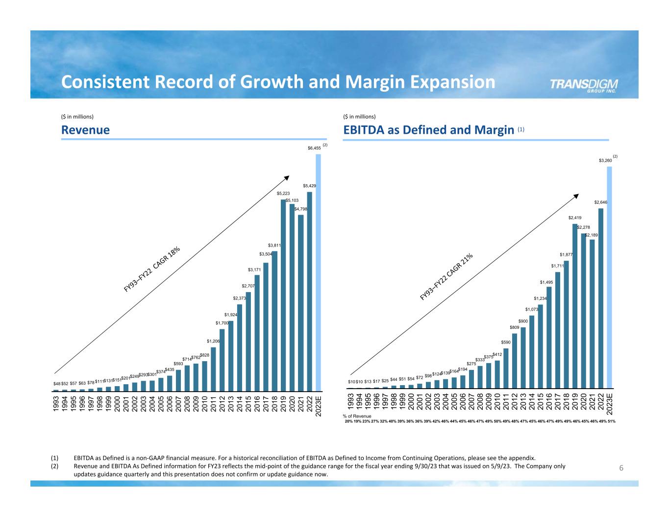 EBITDA as Defined and Margin (1)Revenue Consistent Record of Growth and Margin Expansion ($ in millions) $48 $52 $57 $63 $78 $111$131$151$201$249$293$301$374$435 $593 $714$762$828 $1,206 $1,700 $1,924 $2,373 $2,707 $3,171 $3,504 $3,811 $5,223 $5,103 $4,798 $5,429 $6,455 19 93 19 94 19 95 19 96 19 97 19 98 19 99 20 00 20 01 20 02 20 03 20 04 20 05 20 06 20 07 20 08 20 09 20 10 20 11 20 12 20 13 20 14 20 15 20 16 20 17 20 18 20 19 20 20 20 21 20 22 20 23 E ($ in millions) $10 $10 $13 $17 $25 $44 $51 $54 $72 $98$124$139$164$194 $275 $333 $375$412 $590 $809 $900 $1,073 $1,234 $1,495 $1,711 $1,877 $2,419 $2,278 $2,189 $2,646 $3,260 19 93 19 94 19 95 19 96 19 97 19 98 19 99 20 00 20 01 20 02 20 03 20 04 20 05 20 06 20 07 20 08 20 09 20 10 20 11 20 12 20 13 20 14 20 15 20 16 20 17 20 18 20 19 20 20 20 21 20 22 20 23 E 6 % of Revenue 20% 19% 23% 27% 32% 40% 39% 36% 36% 39% 42% 46% 44% 45% 46% 47% 49% 50% 49% 48% 47% 45% 46% 47% 49% 49% 46% 45% 46% 49% 51% (1) EBITDA as Defined is a non‐GAAP financial measure. For a historical reconciliation of EBITDA as Defined to Income from Continuing Operations, please see the appendix. (2) Revenue and EBITDA As Defined information for FY23 reflects the mid‐point of the guidance range for the fiscal year ending 9/30/23 that was issued on 5/9/23. The Company only updates guidance quarterly and this presentation does not confirm or update guidance now. (2) (2)